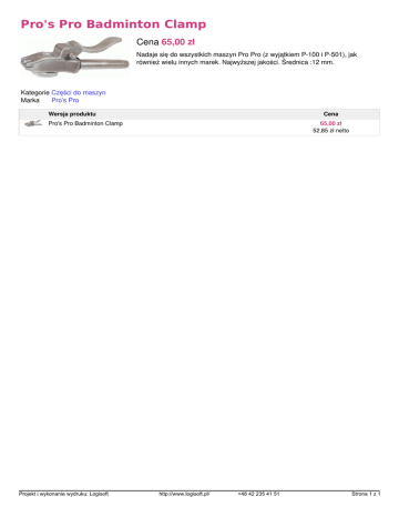 Pro's Pro Badminton Clamp Cena 65,00 zł Nadaje się do wszystkich maszyn Pro Pro (z wyjątkiem P-100 i P-501), jak również wielu innych marek. Najwyższej jakości. Średnica :12 mm. Kategorie Części do maszyn Marka Pro's Pro Wersja produktu Cena Pro's Pro Badminton Clamp Projekt i wykonanie wydruku: Logisoft Powered by TCPDF (www.tcpdf.org) 65,00 zł 52,85 zł netto http://www.logisoft.pl/ +48 42 235 41 51 Strona 1 z 1
