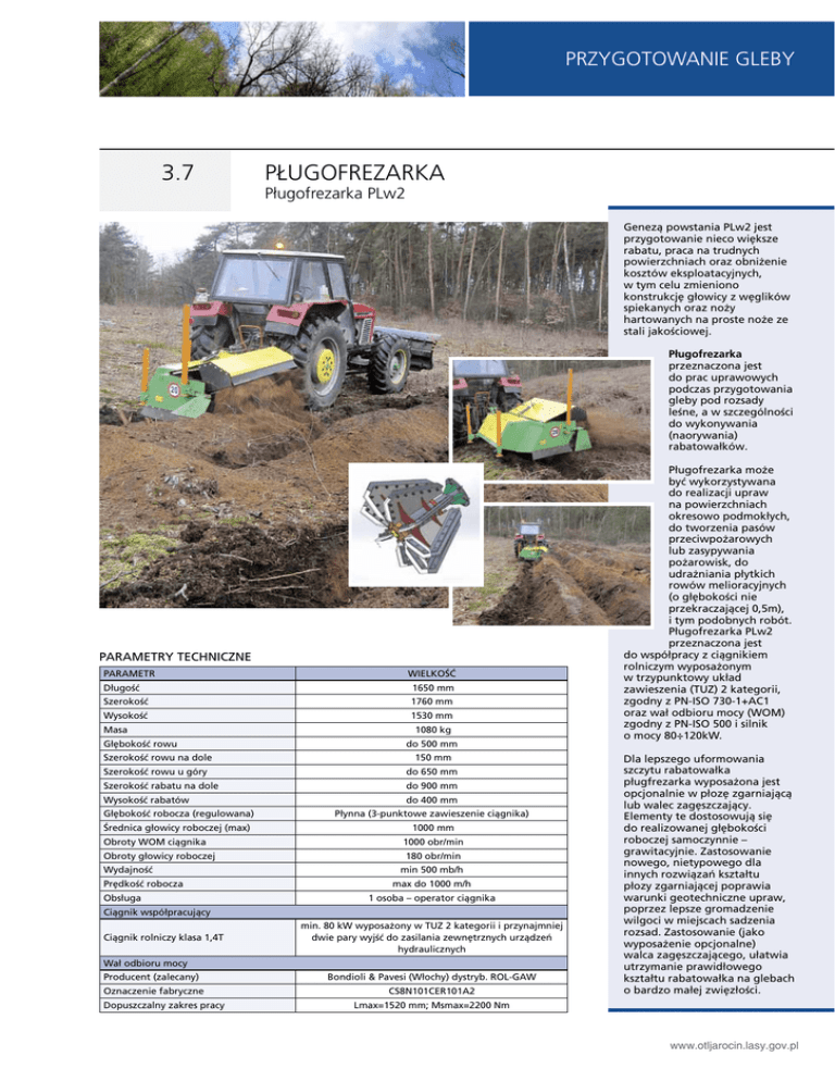 Untergrund PRZYGOTOWANIE vorbereiten GLEBY 3.7 Pługofrezarka Pługofrezarka PLw2 Genezą powstania PLw2 jest przygotowanie nieco większe rabatu, praca na trudnych powierzchniach oraz obniżenie kosztów eksploatacyjnych, w tym celu zmieniono konstrukcję głowicy z węglików spiekanych oraz noży hartowanych na proste noże ze stali jakościowej. Pługofrezarka przeznaczona jest do prac uprawowych podczas przygotowania gleby pod rozsady leśne, a w szczególności do wykonywania (naorywania) rabatowałków. PARAMETRY TECHNICZNE PARAMETR WIELKOŚĆ Długość 1650 mm Szerokość 1760 mm Wysokość 1530 mm Masa Głębokość rowu 1080 kg do 500 mm Szerokość rowu na dole 150 mm Szerokość rowu u góry do 650 mm Szerokość rabatu na dole do 900 mm Wysokość rabatów Głębokość robocza (regulowana) Średnica głowicy roboczej (max) Obroty WOM ciągnika Obroty głowicy roboczej Wydajność Prędkość robocza Obsługa do 400 mm Płynna (3-punktowe zawieszenie ciągnika) 1000 mm 1000 obr/min 180 obr/min min 500 mb/h max do 1000 m/h 1 osoba – operator ciągnika Ciągnik współpracujący Ciągnik rolniczy klasa 1,4T min. 80 kW wyposażony w TUZ 2 kategorii i przynajmniej dwie pary wyjść do zasilania zewnętrznych urządzeń hydraulicznych Wał odbioru mocy Producent (zalecany) Oznaczenie fabryczne Dopuszczalny zakres pracy Bondioli & Pavesi (Włochy) dystryb. ROL-GAW CS8N101CER101A2 Pługofrezarka może być wykorzystywana do realizacji upraw na powierzchniach okresowo podmokłych, do tworzenia pasów przeciwpożarowych lub zasypywania pożarowisk, do udrażniania płytkich rowów melioracyjnych (o głębokości nie przekraczającej 0,5m), i tym podobnych robót. Pługofrezarka PLw2 przeznaczona jest do współpracy z ciągnikiem rolniczym wyposażonym w trzypunktowy układ zawieszenia (TUZ) 2 kategorii, zgodny z PN-ISO 730-1+AC1 oraz wał odbioru mocy (WOM) zgodny z PN-ISO 500 i silnik o mocy 80÷120kW. Dla lepszego uformowania szczytu rabatowałka pługfrezarka wyposażona jest opcjonalnie w płozę zgarniającą lub walec zagęszczający. Elementy te dostosowują się do realizowanej głębokości roboczej samoczynnie – grawitacyjnie. Zastosowanie nowego, nietypowego dla innych rozwiązań kształtu płozy zgarniającej poprawia warunki geotechniczne upraw, poprzez lepsze gromadzenie wilgoci w miejscach sadzenia rozsad. Zastosowanie (jako wyposażenie opcjonalne) walca zagęszczającego, ułatwia utrzymanie prawidłowego kształtu rabatowałka na glebach o bardzo małej zwięzłości. Lmax=1520 mm; Msmax=2200 Nm www.otljarocin.lasy.gov.pl