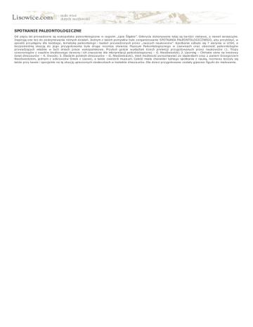 SPOTKANIE PALEONTOLOGICZNE Od pięciu lat prowadzone są wykopaliska paleontologiczne w cegielni „Lipie Śląskie”. Odkrycia dokonywane tutaj są bardzo ciekawe, a nawet sensacyjne. Inspirują one też do podejmowania różnych działań. Jednym z takich pomysłów było zorganizowanie SPOTKANIA PALEONTOLOGICZNEGO, aby przybliżyć, w sposób przystępny dla każdego, tematykę paleontologii i badań prowadzonych przez „naszych naukowców”. Spotkanie odbyło się 7 sierpnia w LCSK, a bezpośrednią okazją do jego przygotowania była druga rocznica otwarcia Muzeum Paleontologicznego w Lisowicach oraz obecność paleontologów prowadzących właśnie w tych dniach prace wykopaliskowe. Przybyli goście wysłuchali trzech prelekcji przygotowanych przez naukowców (1. Tropy czworonogów z osadów środkowego dewonu i ich znaczenie dla interpretacji paleobiologicznej – G. Niedźwiedzki; 2. Liaoning – Chińskie okno na kredowy świat dinozaurów – K. Owocki; 3. Śladami polskich dinozaurów – G. Niedźwiedzki), mieli możliwość porozmawiać ze studentami oraz z panem Grzegorzem Niedźwiedzkim, jednym z odkrywców Smok z Lisowic, a także zwiedzili muzeum. Całość miała charakter luźnego spotkania z nauką, rozmowy toczyły się także przy kawie i specjalnie na tę okazję upieczonych ciasteczkach w kształcie dinozaurów. Dla dzieci przygotowane zostały gipsowe figurki do malowania.