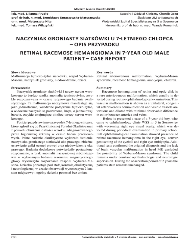 Magazyn Lekarza Okulisty 4/2008 lek. med. Lilianna Prudło Katedra i Oddział Kliniczny Chorób Oczu prof. dr hab. n. med. Bronisława Koraszewska-Matuszewska Śląskiego UM w Katowicach dr n. med. Małgorzata Nita Wojewódzki Szpital Specjalistyczny nr 5 w Sosnowcu lek. med. Tomasz Wilczyński kierownik: prof. dr hab. n. med. Wanda Romaniuk Naczyniak groniasty siatkówki u 7-letniego chłopca – opis przypadku Retinal racemose hemangioma in 7-year old male patient – case report Key words Słowa kluczowe Malformacja tętniczo-żylna siatkówki, zespół Wyburna- Retinal arteriovenous malformation, Wyburn-Mason syndrome, racemose hemangioma, amblyopia, children. Masona, naczyniak groniasty, niedowidzenie, dzieci. Streszczenie Naczyniak groniasty siatkówki i tarczy nerwu wzrokowego to bardzo rzadka anomalia tętniczo-żylna, zwykle rozpoznawana w czasie rutynowego badania okulistycznego. Ta malformacja naczyniowa manifestuje się jako jednostronne, wrodzone połączenie tętniczo-żylne, a widoczne naczynia są poszerzone, kręte, o jednakowej barwie, zwykle obejmujące okolicę tarczy nerwu wzrokowego. Poniżej przedstawiamy przypadek 7-letniego chłopca, który zgłosił się do Przyklinicznej Poradni Okulistycznej z powodu obniżenia ostrości wzroku, zdiagnozowanego przez higienistkę szkolną w czasie badań przesiewowych. Pełne badanie okulistyczne wykazało istnienie naczyniaka groniastego siatkówki oka prawego, zbieżne ustawienie gałki ocznej prawej oraz niedowidzenie oka prawego. Badania dodatkowe potwierdziły postawione rozpoznanie, a brak anomalii naczyniowej śródmózgowia w wykonanym badaniu rezonansu magnetycznego głowy wykluczyło rozpoznanie zespołu Wyburna-Masona. Dziecko pozostaje pod stałą kontrolą okulistyczną i neurologiczną; w czasie obserwacji wynoszącym 2 lata stan miejscowy i ogólny dziecka pozostał bez zmian. 288 Summary Racemose hemangioma of retina and optic disk is a rare arteriovenous malformation, which usually is detected during routine ophthalmological examination. This vascular malformation is shown as a unilateral, congenital arteriovenous communication and visible vessels are tortuous and dilated with minimal observable difference in color between arteries and veins. Below is presented a case of a 7-year old boy, who came to ophthalmology clinic WSS nr 5 in Sosnowiec with worsening right eye visual acuity, which was detected during periodical examination in primary school. Full ophthalmological examination showed presence of retinal racemose hemangioma in the right eye, convergent setting of the eyeball and right eye amblyopia. Additional tests confirmed the original diagnosis and the lack of brain vascular malformation in head MR excluded the possibility of Wyburn-Mason syndrome. The child remains under constant ophthalmologic and neurologic supervision. During the observation period of 2 years the patients state remains unchanged. Naczyniak groniasty siatkówki u 7 letniego chłopca – opis przypadku – praca kazuistyczna