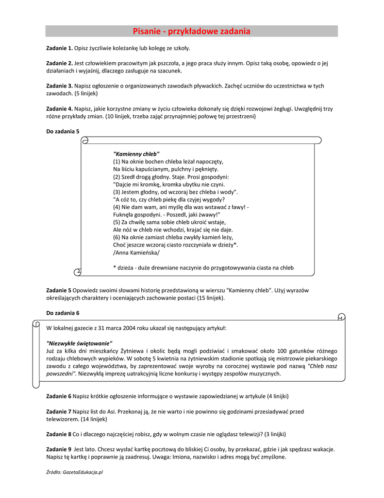 Pisanie - przykładowe zadania Zadanie 1. Opisz życzliwie koleżankę lub kolegę ze szkoły. Zadanie 2. Jest człowiekiem pracowitym jak pszczoła, a jego praca służy innym. Opisz taką osobę, opowiedz o jej działaniach i wyjaśnij, dlaczego zasługuje na szacunek. Zadanie 3. Napisz ogłoszenie o organizowanych zawodach pływackich. Zachęć uczniów do uczestnictwa w tych zawodach. (5 linijek) Zadanie 4. Napisz, jakie korzystne zmiany w życiu człowieka dokonały się dzięki rozwojowi żeglugi. Uwzględnij trzy różne przykłady zmian. (10 linijek, trzeba zająć przynajmniej połowę tej przestrzeni) Do zadania 5 "Kamienny chleb" (1) Na oknie bochen chleba leżał napoczęty, Na liściu kapuścianym, pulchny i pęknięty. (2) Szedł drogą głodny. Staje. Prosi gospodyni: "Dajcie mi kromkę, kromka ubytku nie czyni. (3) Jestem głodny, od wczoraj bez chleba i wody". "A cóż to, czy chleb piekę dla czyjej wygody? (4) Nie dam wam, ani myślę dla was wstawać z ławy! Fuknęła gospodyni. - Poszedł, jaki żwawy!" (5) Za chwilę sama sobie chleb ukroić wstaje, Ale nóż w chleb nie wchodzi, krajać się nie daje. (6) Na oknie zamiast chleba zwykły kamień leży, Choć jeszcze wczoraj ciasto rozczyniała w dzieży*. /Anna Kamieńska/ * dzieża - duże drewniane naczynie do przygotowywania ciasta na chleb Zadanie 5 Opowiedz swoimi słowami historię przedstawioną w wierszu "Kamienny chleb". Użyj wyrazów określających charaktery i oceniających zachowanie postaci (15 linijek). Do zadania 6 W lokalnej gazecie z 31 marca 2004 roku ukazał się następujący artykuł: "Niezwykłe świętowanie" Już za kilka dni mieszkańcy Żytniewa i okolic będą mogli podziwiać i smakować około 100 gatunków różnego rodzaju chlebowych wypieków. W sobotę 5 kwietnia na żytniewskim stadionie spotkają się mistrzowie piekarskiego zawodu z całego województwa, by zaprezentować swoje wyroby na corocznej wystawie pod nazwą "Chleb nasz powszedni". Niezwykłą imprezę uatrakcyjnią liczne konkursy i występy zespołów muzycznych. Zadanie 6 Napisz krótkie ogłoszenie informujące o wystawie zapowiedzianej w artykule (4 linijki) Zadanie 7 Napisz list do Asi. Przekonaj ją, że nie warto i nie powinno się godzinami przesiadywać przed telewizorem. (14 linijek) Zadanie 8 Co i dlaczego najczęściej robisz, gdy w wolnym czasie nie oglądasz telewizji? (3 linijki) Zadanie 9 Jest lato. Chcesz wysłać kartkę pocztową do bliskiej Ci osoby, by przekazać, gdzie i jak spędzasz wakacje. Napisz tę kartkę i poprawnie ją zaadresuj. Uwaga: Imiona, nazwisko i adres mogą być zmyślone. Źródło: GazetaEdukacja.pl