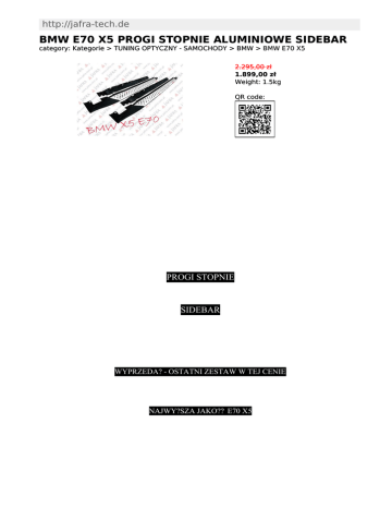 http://jafra-tech.de BMW E70 X5 PROGI STOPNIE ALUMINIOWE SIDEBAR category: Kategorie > TUNING OPTYCZNY - SAMOCHODY > BMW > BMW E70 X5 2.295,00 zł 1.899,00 zł Weight: 1.5kg QR code: BMW PROGI STOPNIE SIDEBAR WYPRZEDA? - OSTATNI ZESTAW W TEJ CENIE NAJWY?SZA JAKO?? E70 X5 page: 1/4 print date: 07-03-2017 http://jafra-tech.de/bmw-e70-x5-progi-stopnie-aluminiowe-sidebar-szczecin.html !!!!! GWARANCJA JAKO?CI !!!!! page: 2/4 print date: 07-03-2017 http://jafra-tech.de/bmw-e70-x5-progi-stopnie-aluminiowe-sidebar-szczecin.html STOPNIE PROGI BMW E70 X5 zawieraj?: - KOLOR: Czarny podstawa, Aluminium nak?adka - TRZY G?ÓWNE ELEMENT: 1. Dwa Progi wykonane z wysokiej jako?? ABS'u, lekkie i wytrzyma?e w cz??ci pokryte nak 2. Elementy monta?owe, ?ruby, podk?adki, wsporniki page: 3/4 print date: 07-03-2017 http://jafra-tech.de/bmw-e70-x5-progi-stopnie-aluminiowe-sidebar-szczecin.html 3. Pasuj? idealnie, 3. Progi u?atwiaj? wchodzenie do samochodu, poprawiaj? wygl?d wizualny, nadaj? sportowego charakteru. 5. Zastosowanie do BMW seria X: BMW X5 E70 page: 4/4 print date: 07-03-2017 http://jafra-tech.de/bmw-e70-x5-progi-stopnie-aluminiowe-sidebar-szczecin.html