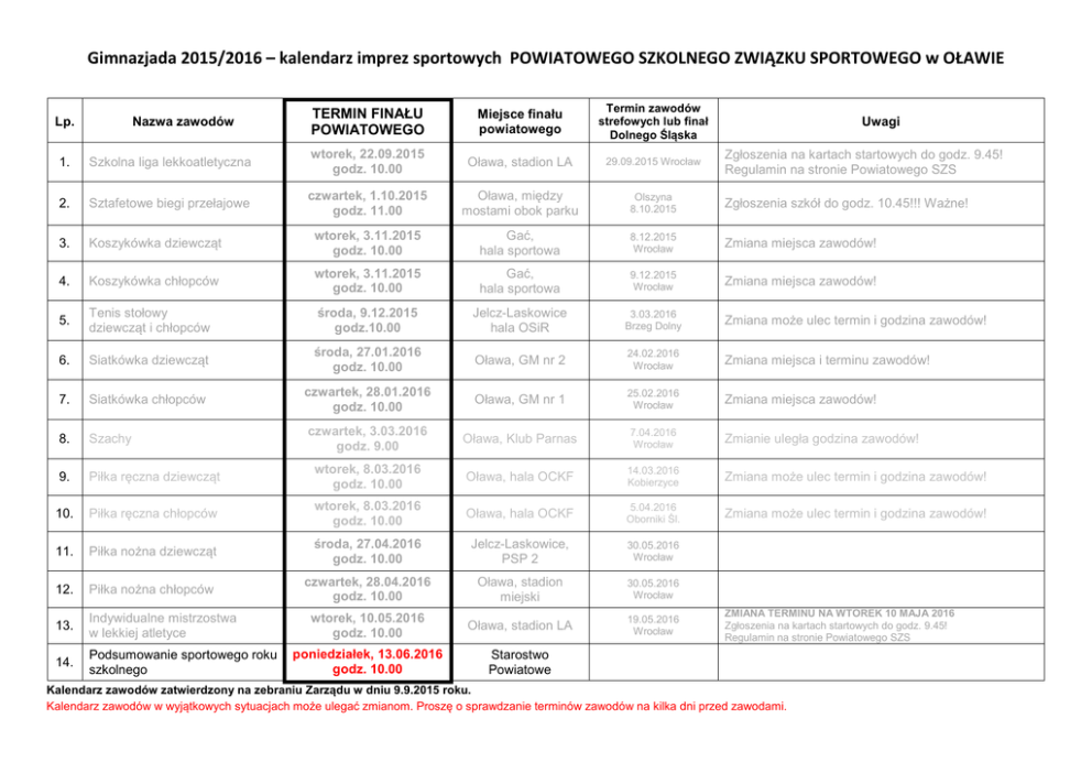 Gimnazjada 2015/2016 – kalendarz imprez sportowych POWIATOWEGO SZKOLNEGO ZWIĄZKU SPORTOWEGO w OŁAWIE Lp. Nazwa zawodów TERMIN FINAŁU POWIATOWEGO Miejsce finału powiatowego Termin zawodów strefowych lub finał Dolnego Śląska Uwagi 1. Szkolna liga lekkoatletyczna wtorek, 22.09.2015 godz. 10.00 Oława, stadion LA 29.09.2015 Wrocław 2. Sztafetowe biegi przełajowe czwartek, 1.10.2015 godz. 11.00 Oława, między mostami obok parku Olszyna 8.10.2015 Zgłoszenia szkół do godz. 10.45!!! Ważne! 3. Koszykówka dziewcząt wtorek, 3.11.2015 godz. 10.00 Gać, hala sportowa 8.12.2015 Wrocław Zmiana miejsca zawodów! 4. Koszykówka chłopców wtorek, 3.11.2015 godz. 10.00 Gać, hala sportowa 9.12.2015 Wrocław Zmiana miejsca zawodów! 5. Tenis stołowy dziewcząt i chłopców środa, 9.12.2015 godz.10.00 Jelcz-Laskowice hala OSiR 3.03.2016 Brzeg Dolny Zmiana może ulec termin i godzina zawodów! 6. Siatkówka dziewcząt środa, 27.01.2016 godz. 10.00 Oława, GM nr 2 24.02.2016 Wrocław Zmiana miejsca i terminu zawodów! 7. Siatkówka chłopców czwartek, 28.01.2016 godz. 10.00 Oława, GM nr 1 25.02.2016 Wrocław Zmiana miejsca zawodów! 8. Szachy czwartek, 3.03.2016 godz. 9.00 Oława, Klub Parnas 7.04.2016 Wrocław Zmianie uległa godzina zawodów! 9. Piłka ręczna dziewcząt wtorek, 8.03.2016 godz. 10.00 Oława, hala OCKF 14.03.2016 Kobierzyce Zmiana może ulec termin i godzina zawodów! 10. Piłka ręczna chłopców wtorek, 8.03.2016 godz. 10.00 Oława, hala OCKF 5.04.2016 Oborniki Śl. Zmiana może ulec termin i godzina zawodów! 11. Piłka nożna dziewcząt środa, 27.04.2016 godz. 10.00 Jelcz-Laskowice, PSP 2 30.05.2016 Wrocław 12. Piłka nożna chłopców czwartek, 28.04.2016 godz. 10.00 Oława, stadion miejski 30.05.2016 Wrocław 13. Indywidualne mistrzostwa w lekkiej atletyce wtorek, 10.05.2016 godz. 10.00 Oława, stadion LA 19.05.2016 Wrocław 14. Podsumowanie sportowego roku szkolnego poniedziałek, 13.06.2016 godz. 10.00 Starostwo Powiatowe Zgłoszenia na kartach startowych do godz. 9.45! Regulamin na stronie Powiatowego SZS ZMIANA TERMINU NA WTOREK 10 MAJA 2016 Zgłoszenia na kartach startowych do godz. 9.45! Regulamin na stronie Powiatowego SZS Kalendarz zawodów zatwierdzony na zebraniu Zarządu w dniu 9.9.2015 roku. Kalendarz zawodów w wyjątkowych sytuacjach może ulegać zmianom. Proszę o sprawdzanie terminów zawodów na kilka dni przed zawodami.