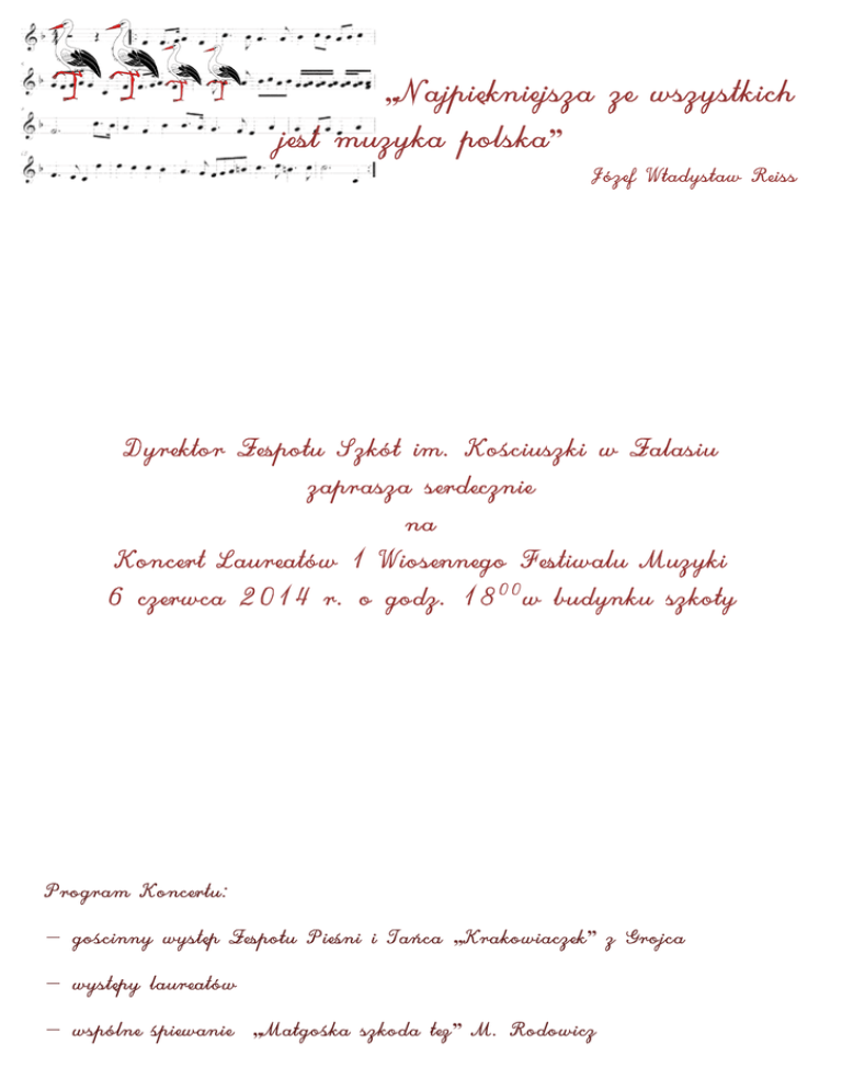 „Najpiękniejsza ze wszystkich jest muzyka polska” Józef Władysław Reiss Dyrektor Zespołu Szkół im. Kościuszki w Zalasiu zaprasza serdecznie na Koncert Laureatów 1 Wiosennego Festiwalu Muzyki 6 czerwca 2014 r. o godz. 1800w budynku szkoły Program Koncertu: - gościnny występ Zespołu Pieśni i Tańca „Krakowiaczek” z Grojca - występy laureatów - wspólne śpiewanie „Małgośka szkoda łez” M. Rodowicz