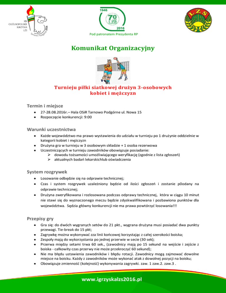 Pod patronatem Prezydenta RP Komunikat Organizacyjny Turnieju piłki siatkowej drużyn 3-osobowych kobiet i mężczyzn Termin i miejsce 27-28.08.2016r.– Hala OSiR Tarnowo Podgórne ul. Nowa 15 Rozpoczęcie konkurencji: 9:00 Warunki uczestnictwa Każde województwo ma prawo wystawienia do udziału w turnieju po 1 drużynie oddzielnie w kategorii kobiet i mężczyzn Drużyna gra w turnieju w 3 osobowym składzie + 1 osoba rezerwowa Uczestniczących w turnieju zawodników obowiązuje posiadanie: dowodu tożsamości umożliwiającego weryfikację (zgodnie z lista zgłoszeo) aktualnych badao lekarskichlub oświadczenia System rozgrywek Losowanie odbędzie się na odprawie technicznej; Czas i system rozgrywek uzależniony będzie od ilości zgłoszeo i zostanie p0odany na odprawie technicznej; Drużyna zweryfikowana i rozlosowana podczas odprawy technicznej, która w ciągu 10 minut nie stawi się do wyznaczonego meczu będzie zdyskwalifikowana i pozbawiona punktów dla województwa. Sędzia główny konkurencji nie ma prawa powtórzyd losowania!!! Przepisy gry Gra się: do dwóch wygranych setów do 21 pkt., wygrana drużyna musi posiadad dwa punkty przewagi. Tie-break do 15 pkt; Zagrywkę można wykonywad zza linii koocowej korzystając z całej szerokości boiska; Zespoły mają do wykorzystania po jednej przerwie w secie (30 sek); Przerwa między setami trwa 60 sek., (zawodnicy mają po 15 sekund na wejście i zejście z boiska - całkowity czas przerwy nie może przekroczyd 60 sekund); Nie ma błędu ustawienia zawodników i błędu rotacji. Zawodnicy mogą zajmowad dowolne miejsce na boisku. Każdy z zawodników może wykonad atak z dowolnej pozycji na boisku; Obowiązuje zmiennośd (kolejnośd) wykonywania zagrywki. zaw. 1 zaw.2. zaw.3 . www.igrzyskalzs2016.pl Pod patronatem Prezydenta RP Pozostałe przepisy zgodnie z regulaminem PZTS Informacje dodatkowe Boisko: wymiary boiska to 9 x 9 m dla mężczyzn i 7 x 7 dla kobiet teren do gry – hala sportowa boisko do gry nie posiada linii środkowej i tzw. linii trzeciego metra. linie wyznaczające boisko, to taśmy o szerokości 5 - 8 cm wysokośd siatki mierzona od środka pola gry (wysokośd siatki na liniach nie może przekraczad oficjalnej wysokości o więcej niż 2cm) Drużyna: składa się z 3 zawodników + 1 zawodnika rezerwowego; nie wymagana jest obecnośd trenera; w imieniu zespołu rozmawiad z sędziami może kapitan drużyny, a w przypadku braku trenera kapitan drużyny może prosid o „czas”; zawodnicy uczestniczą w turnieju w miękkim obuwiu – nie wolno używad kolców, butów z korkami itp. Kary: żółta karta jest ostrzeżeniem (zespół nie traci punktu), natomiast czerwona kartka powoduje utratę punktu (bez wykluczenia zawodnika z gry); nie ma kumulacji kar dla zawodników w meczu. W każdym secie zawodnik rozpoczyna grę z czystym kontem. Postanowienia końcowe Organizatorzy nie biorą odpowiedzialności za wszelkie urazy i kontuzje zawodników powstałe w trakcie turnieju; Za rzeczy pozostawione bez opieki organizator nie odpowiada; Organizator zabezpiecza piłki meczowe; Organizator zabezpiecza opiekę medyczną; Za zaistniałe wypadki niezawinione przez organizatora, organizator nie ponosiodpowiedzialności; Sędzia główny konkurencji: Paweł Kapłon tel:602 637 951 www.igrzyskalzs2016.pl