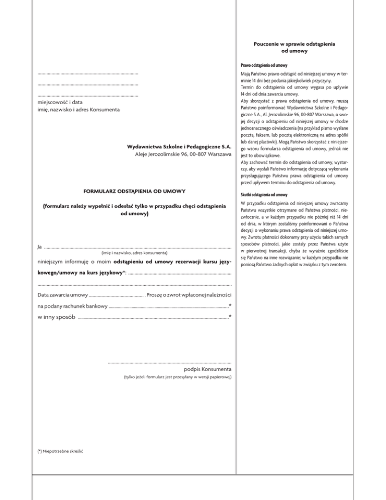Pouczenie w sprawie odstąpienia od umowy Prawo odstąpienia od umowy ............................................................................... ............................................................................... ............................................................................... miejscowość i data imię, nazwisko i adres Konsumenta Wydawnictwa Szkolne i Pedagogiczne S.A. Aleje Jerozolimskie 96, 00-807 Warszawa FORMULARZ ODSTĄPIENIA OD UMOWY (formularz należy wypełnić i odesłać tylko w przypadku chęci odstąpienia od umowy) Ja ................................................................................................................................................... (imię i nazwisko, adres konsumenta) niniejszym informuję o moim odstąpieniu od umowy rezerwacji kursu językowego/umowy na kurs językowy*: ................................................................................. ...................................................................................................................................................... Data zawarcia umowy ........................................... . Proszę o zwrot wpłaconej należności na podany rachunek bankowy ........................................................................................................* w inny sposób .......................................................................................................................* ................................................................................................. podpis Konsumenta (tylko jeżeli formularz jest przesyłany w wersji papierowej) (*) Niepotrzebne skreślić Mają Państwo prawo odstąpić od niniejszej umowy w terminie 14 dni bez podania jakiejkolwiek przyczyny. Termin do odstąpienia od umowy wygasa po upływie 14 dni od dnia zawarcia umowy. Aby skorzystać z prawa odstąpienia od umowy, muszą Państwo poinformować Wydawnictwa Szkolne i Pedagogiczne S.A., Al. Jerozolimskie 96, 00-807 Warszawa, o swojej decyzji o odstąpieniu od niniejszej umowy w drodze jednoznacznego oświadczenia (na przykład pismo wysłane pocztą, faksem, lub pocztą elektroniczną na adres spółki lub danej placówki). Mogą Państwo skorzystać z niniejszego wzoru formularza odstąpienia od umowy, jednak nie jest to obowiązkowe. Aby zachować termin do odstąpienia od umowy, wystarczy, aby wysłali Państwo informację dotyczącą wykonania przysługującego Państwu prawa odstąpienia od umowy przed upływem terminu do odstąpienia od umowy. Skutki odstąpienia od umowy W przypadku odstąpienia od niniejszej umowy zwracamy Państwu wszystkie otrzymane od Państwa płatności, niezwłocznie, a w każdym przypadku nie później niż 14 dni od dnia, w którym zostaliśmy poinformowani o Państwa decyzji o wykonaniu prawa odstąpienia od niniejszej umowy. Zwrotu płatności dokonamy przy użyciu takich samych sposobów płatności, jakie zostały przez Państwa użyte w pierwotnej transakcji, chyba że wyraźnie zgodziliście się Państwo na inne rozwiązanie; w każdym przypadku nie poniosą Państwo żadnych opłat w związku z tym zwrotem.