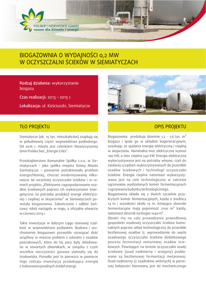 BIOGAZOWNIA O WYDAJNOŚCI 0,2 MW W OCZYSZCZALNI ŚCIEKÓW W SIEMIATYCZACH Rodzaj działania: wykorzystanie biogazu Czas realizacji: 2013 – 2015 r. Lokalizacja: ul. Kościuszki, Siemiatycze fot. Marcin Jakimczuk TŁO PROJEKTU Siemiatycze (ok. 15 tys. mieszkańców) znajdują się w południowej części województwa podlaskiego. Od 2016 r. miasto jest członkiem Stowarzyszenia Gmin Polska Sieć „Energie Cités”. Przedsiębiorstwo Komunalne Spółka z.o.o. w Siemiatyczach – jako spółka miejska Gminy Miasto Siemiatycze – poważnie potraktowało problem energochłonnej, chociaż modernizowanej kilkanaście lat wcześniej oczyszczalni ścieków i w ramach projektu „Efektywne zagospodarowanie osadów ściekowych poprzez ich wykorzystanie energetyczne na potrzeby produkcji energii elektrycznej i cieplnej w skojarzeniu” w Siemiatyczach powstała biogazownia. Zakończenie i odbiór końcowy robót nastąpiły w maju, a oficjalne otwarcie w czerwcu 2015 r. Takie inwestycje w dalszym ciągu stanowią rzadkość w województwie podlaskim. Budowa i uruchomienie biogazowni pozwoliło rozwiązać dość uciążliwy w mieście problem z odorami z osadów pościekowych, które do tej pory były składowane w otwartych zbiornikach, w związku z czym wszelkie nieczystości gazowe ulatniały się do środowiska. Ponadto jest to pierwsza w powiecie tego rodzaju inwestycja produkująca energię z niekonwencjonalnych źródeł energii. OPIS PROJEKTU Biogazownia produkuje dziennie 1,2 - 1,6 tys. m³ biogazu i spala go w układzie kogeneracyjnym, uzyskując ze spalania energię elektryczną i cieplną w skojarzeniu. Nominalna moc elektryczna wynosi 190 kW, a moc cieplna 240 kW. Energia elektryczna wykorzystywana jest na potrzeby własne, czyli do zasilania urządzeń wykorzystywanych do przeróbki osadów ściekowych i technologii oczyszczalni ścieków. Energia cieplna natomiast wykorzystywana jest na cele technologiczne w zakresie ogrzewania wydzielonych komór fermentacyjnych i ogrzewania budynku technologicznego. Biogazownia składa się z dwóch szczelnie przykrytych komór fermentacyjnych, każda o średnicy 13 m i wysokości około 15 m. Istniejące zbiorniki fermentacyjne mają pojemność 2100 m³ każdy, natomiast zbiornik na biogaz 1040 m³. Obiekt ma na celu prowadzenie prawidłowej gospodarki osadowej oczyszczalni ścieków komunalnych poprzez układ technologiczny do przeróbki beztlenowej osadów tj. wprowadzenie do węzła osadowego oczyszczalni ścieków dodatkowego procesu fermentacji metanowej osadów ściekowych. Powstające na terenie oczyszczalni osady ściekowe (osad nadmierny i wstępny) poddawane są beztlenowej fermentacji metanowej. Osad nadmierny (z osadników wtórnych) w pierwszej kolejności kierowany jest do mechanicznego fot. Marcin Jakimczuk zagęszczania i odwodnienia. W procesie beztlenowej fermentacji produktem zachodzących reakcji biologicznych jest biogaz, który następnie jest magazynowany w zbiorniku i poprzez system odwodnienia kondensatu oraz odsiarczalnię biogazu transportowany jest do zbiornika niskociśnieniowego. Biogaz ze zbiornika, za pośrednictwem tłoczni biogazu podnoszącej ciśnienie, tłoczony jest do maszyn energetycznych tj. kogeneratora i kotła cieplnego, które wytwarzają m.in. energię cieplną na potrzeby podtrzymania temperatur procesowych w WKF (wydzielona komora fermentacyjna) i wcześniej wspomnianą energię elektryczną do zasilania oczyszczalni. Dla zapewnienia odpowiedniej temperatury w komorach przewidziano dla każdej komory układ cyrkulacji grzewczej, natomiast dwuśmigłowe mieszadła o pionowej osi mieszania mają zapewnić całkowite wymieszanie osadów fermentacyjnych w WKF. ŹRÓDŁA FINANSOWANIA Całkowita wartość projektu to około 12 mln zł brutto. Na kwotę tę złożyło się dofinansowanie z Regionalnego Programu Operacyjnego (RPO) Województwa Podlaskiego na lata 2007-2013, które wyniosło prawie 7,5 mln zł brutto oraz pożyczka od Wojewódzkiego Funduszu Ochrony Środowiska i Gospodarki Wodnej w Białymstoku w wysokości prawie 2,5 mln zł brutto. W ramach projektu zakupiono również instalację do odwadniania osadów przefermentowanych o wartości około 2 mln zł, która także była dofinansowana w 85% z RPO. REZULTATY PROJEKTU Głównym celem inwestycji było prawidłowe i efektywne zagospodarowanie osadów ściekowych, a przy okazji ich wykorzystanie energetyczne na potrzeby produkcji energii elektrycznej, dzięki czemu przedsiębiorstwo obniżyło o połowę koszty energii zużywanej na obsługę urządzeń w oczyszczalni ścieków. Średnie miesięczne oszczędności w opłatach za energię sięgają prawie 20 tys. zł. Z tytułu sprzedaży świadectw pochodzenia energii elektrycznej (zielone certyfikaty) spółka czerpie także realne korzyści finansowe, dające możliwość pokrycia kosztów eksploatacji. Realizacja przedsięwzięcia wpłynęła także korzystnie na poprawę komfortu życia mieszkańców Siemiatycz, zwłaszcza w zakresie likwidacji uciążliwości odorowych. W wyniku kontrolowanej fermentacji wyeliminowano zanieczyszczenia emitowane do atmosfery, a ponadto nawet o 30% zmniejszyła się ilość osadów ściekowych. Zwiększyło się natomiast bezpieczeństwo sanitarne osadów przefermentowanych wykorzystywanych rolniczo w celu poprawy agrokultury gleb. Po odgazowaniu i mechanicznym odwadnianiu osad jest poddawany procesowi higienizacji i może być zagospodarowany jako naturalny nawóz. Przygotowanie osadów do ewentualnej dalszej przeróbki (suszenie, spalanie), zgodnie z tendencjami światowymi, otworzyło drogę do kolejnych inwestycji spółki tj. suszarni i spalarni osadów, które są w zamierzeniach inwestycyjnych Przedsiębiorstwa Komunalnego. Poprzez wykorzystanie odnawialnych źródeł energii, tj. paliwa gazowego – biogazu, inwestycja jest działalnością proekologiczną, która pozwala na oszczędność paliw kopalnych. „Efektywne zagospodarowanie osadów ś