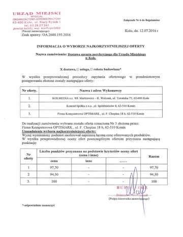 URZĄD MIEJSKI WYDZIAŁ ORGANIZACYJNO-ADMINISTMCYJNY Załącznik 62-600 Koło, ul. Stary Rynek 1 Nr 6 do Regulaminu tel. 63 26 27 561 powiat kolski, woj. wielkopolskie Koło, dn. 12.07.2016 r (Pieczęć zamawiającego) Znak sprawy: OA.2600.193.2016 INFORMACJA O WYBORZE NAJKORZYSTNIEJSZEJ Nazwa zamówienia: OFERTY Dostawa sprzętu peryferyjnego dla Urzędu Miejskiego wKole. X dostawa, D usługa, D robota budowlana* W wyniku przeprowadzonej procedury zapytania postępowaniu złożone zostały następujące oferty: Nr oferty. 1. ofertowego w przedmiotowym N azwa i adres Wykonawcy KOLMEDIA s.c. Wł. Markiewicz - R. Walczak, ul. Toruńska 73, 62-600 Koło 2. Konrad Spółka z 3. 0.0. ,ul. Spółdzielców 8, 62-510 Konin Firma Komputerowa OPTIMARK , ul. F. Chopina 18 b, 62-510 Konin Do realizacji zamówienia wybrana została oferta oznaczona Nr 3 złożona przez: Firma Komputerowa OPTIMARK , ul. F. Chopina 18 b, 62-510 Konin Uzasadnienie wyboru najkorzvstniejszej oferty: Wyżej wymieniony podmiot zaoferował najniższą łączną cenę oferowanych produktów. W wyniku przeprowadzonej oceny ofert poszczególnym ofertom przyznana następującą punktację: Nr oferty Liczba punktów przyznana na podstawie kryteriów oceny ofert (cena i inne) cena inne 1 97,70 - ...... - 2 94,50 - - 3. 100 - - BU Razem 97,70 f\ ~ I 94,50 100 I ~1 $TIF ~ ·······Sta '. /, -~j~,~aj (Podpis kierownika zamawiaj *-odpowiednio zaznaczyć zek> . ego)