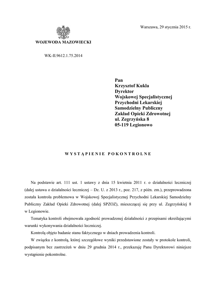 Wystąpienie pokontrolne Wojskowa Specjalistyczna Przychodnia