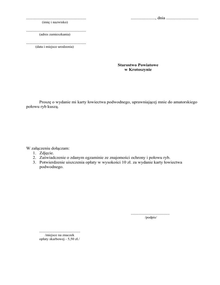 ...................................................... ......................, dnia ............................. (imię i nazwisko) ...................................................... (adres zamieszkania) ...................................................... (data i miejsce urodzenia) Starostwo Powiatowe w Krotoszynie Proszę o wydanie mi karty łowiectwa podwodnego, uprawniającej mnie do amatorskiego połowu ryb kuszą. W załączeniu dołączam: 1. Zdjęcie. 2. Zaświadczenie o zdanym egzaminie ze znajomości ochrony i połowu ryb. 3. Potwierdzenie uiszczenia opłaty w wysokości 10 zł. za wydanie karty łowiectwa podwodnego. ................................... /podpis/ ..................................... /miejsce na znaczek opłaty skarbowej - 5,50 zł./