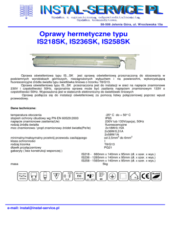 58-506 Jelenia Góra, ul. Wrocławska 15a Oprawy hermetyczne typu IS218SK, IS236SK, IS258SK Oprawa oświetleniowa typu IS...SK jest oprawą oświetleniową przeznaczoną do stosowania w podziemnych wyrobiskach górniczych, niezagrożonych wybuchem i na powierzchni, wykorzystującą fluorescencyjne źródła światła typu świetlówka liniowa o trzonku T8/G13. Oprawa oświetleniowa typu IS...SK przeznaczona jest do instalacji w sieci na napięcie znamionowe 230V i częstotliwości 50Hz, opcjonalnie oprawa może być zasilania napięciem znamionowym 133V o częstotliwości 50Hz. Wyposażona jest w statecznik elektroniczny do świetlówek liniowych Oprawę podłącza się do instalacji oświetleniowej za pomocą listwy połączeniowej poprzez wpust przewodowy. Dane techniczne: temperatura otoczenia stopień ochrony obudowy wg PN-EN 60529:2003 napięcie znamionowe zasilania(Ue) rodzaj źródła światła moc znamionowa / prąd znamionowy źródeł światła(Pe/Ie) -25° C do + 50° C IP65 230V lub 133V(opcja), 50Hz fluorescencyjne 2x18W/0,15A 2x36W/0,31A 2x58W/1A od 2,5mm2 do 6mm2 I T8/G13 PG21 minimalny/maksymalny przekrój przewodu zasilającego klasa ochronności rodzaj trzonka dławik przyłączeniowy gabaryty ( bez konstrukcji wsporczej ) IS218 - 660mm x 140mm x 95mm (dł. x szer. x wys.) IS236 - 1265mm x 140mm x 95mm (dł. x szer. x wys.) IS258 - 1565mm x 140mm x 95mm (dł. x szer. x wys.) masa 5kg e-mail: [email protected] Oprawy typu IS...SK produkowane są w następujących odmianach : IS218SK - oprawa przystosowana dla 2 źródeł światła o mocy 18W, wyposażona w statecznik elektroniczny z dodatkową konstrukcją wsporczą; IS236SK - oprawa przystosowana dla 2 źródeł światła o mocy 36W, wyposażona w statecznik elektroniczny z dodatkową konstrukcją wsporczą; IS258SK - oprawa przystosowana dla 2 źródeł światła o mocy 58W, wyposażona w statecznik elektroniczny z dodatkową konstrukcją wsporczą. Parametry źródła światła fluorescencyjnego stosowanego w oprawach typu IS ... SK Temperatura barwowa 6400K* Temperatura barwowa 6400K* Temperatura barwowa 6400K* Łączny strumień świetlny 1300lm* Łączny strumień świetlny 3250lm* Łączny strumień świetlny 5300lm* Trwałość 15.000h Trwałość Trwałość 15.000h Długość świetlówki 60,4cm Długość świetlówki Długość świetlówki 151,4cm IS218SK 15.000h 121,4cm IS236SK *parametry źródeł mogą być uzgadniane przez klienta przy zamówieniu Zamówienia należy składać pisemnie lub faxem na adres: IS258SK