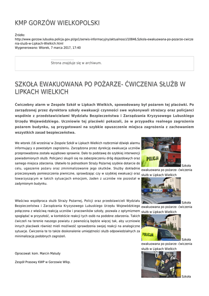 KMP GORZÓW WIELKOPOLSKI Źródło: http://www.gorzow.lubuska.policja.gov.pl/go1/serwis-informacyjny/aktualnosci/10846,Szkola-ewakuowana-po-pozarze-cwicze nia-sluzb-w-Lipkach-Wielkich.html Wygenerowano: Wtorek, 7 marca 2017, 17:40 Strona znajduje się w archiwum. SZKOŁA EWAKUOWANA PO POŻARZE- ĆWICZENIA SŁUŻB W LIPKACH WIELKICH Ćwiczebny alarm w Zespole Szkół w Lipkach Wielkich, spowodowany był pożarem tej placówki. Po zarządzonej przez dyrektora szkoły ewakuacji czynności swe wykonywali strażacy oraz policjanci wspólnie z przedstawicielami Wydziału Bezpieczeństwa i Zarządzania Kryzysowego Lubuskiego Urzędu Wojewódzkiego. Uczniowie tej placówki pokazali, że w przypadku realnego zagrożenia pożarem budynku, są przygotowani na szybkie opuszczenie miejsca zagrożenia z zachowaniem wszystkich zasad bezpieczeństwa. We wtorek /16 września/ w Zespole Szkół w Lipkach Wielkich rozbrzmiał dźwięk alarmu informujący o powstałym zagrożeniu. Zarządzona przez dyrekcję ewakuacja uczniów przeprowadzona została wyjątkowo sprawnie. Dało to podstawę do szybkiej interwencji powiadomionych służb. Policjanci skupili się na zabezpieczeniu dróg dojazdowych oraz samego miejsca zdarzenia. Ułatwiło to jednostkom Straży Pożarnej szybkie dotarcie do Szkoła celu, ugaszenie pożaru oraz zminimalizowanie jego skutków. Służby dokładnie ewakuowana po pożarze- ćwiczenia przeczesywały pomieszczenia piwniczne, sprawdzając czy w szybkiej ewakuacji oraz służb w Lipkach Wielkich towarzyszącym w takich sytuacjach emocjom, żaden z uczniów nie pozostał w zadymionym budynku. Właściwa współpraca służb Straży Pożarnej, Policji oraz przedstawicieli Wydziału Szkoła Bezpieczeństwa i Zarządzania Kryzysowego Lubuskiego Urzędu Wojewódzkiego ewakuowana po pożarze- ćwiczenia połączona z właściwą reakcją uczniów i pracowników szkoły, pozwala z optymizmem służb w Lipkach Wielkich spoglądać w przyszłość, w kontekście reakcji tych osób na podobne zdarzenia. Takich ćwiczeń na terenie naszego powiatu z pewnością będzie więcej tak, aby uczniowie innych placówek również mieli możliwość sprawdzenia swojej reakcji na analogiczne sytuacje. Ćwiczenia te to także doskonalenie umiejętności służb odpowiedzialnych za minimalizację podobnych zagrożeń. Szkoła ewakuowana po pożarze- ćwiczenia służb w Lipkach Wielkich Opracował: kom. Marcin Maludy Zespół Prasowy KWP w Gorzowie Wlkp. Szkoła ewakuowana po pożarze- ćwiczenia służb w Lipkach Wielkich Szkoła ewakuowana po pożarze- ćwiczenia służb w Lipkach Wielkich Szkoła ewakuowana po pożarze- ćwiczenia służb w Lipkach Wielkich Szkoła ewakuowana po pożarze- ćwiczenia służb w Lipkach Wielkich Szkoła ewakuowana po pożarze- ćwiczenia służb w Lipkach Wielkich Szkoła ewakuowana po pożarze- ćwiczenia służb w Lipkach Wielkich Szkoła ewakuowana po pożarze- ćwiczenia służb w Lipkach Wielkich Szkoła ewakuowana po pożarze- ćwiczenia służb w Lipkach Wielkich Szkoła ewakuowana po pożarze- ćwiczenia służb w Lipkach Wielkich Szkoła ewakuowana po pożarze- ćwiczenia służb w Lipkach Wielkich Szkoła ewakuowana po pożarze- ćwiczenia służb w Lipkach Wielkich Szkoła ewakuowana po pożarze- ćwiczenia służb w Lipkach Wielkich Szkoła ewakuowana po pożarze- ćwiczenia służb w Lipkach Wielkich Ocena: 0/5 (0) Tweetnij