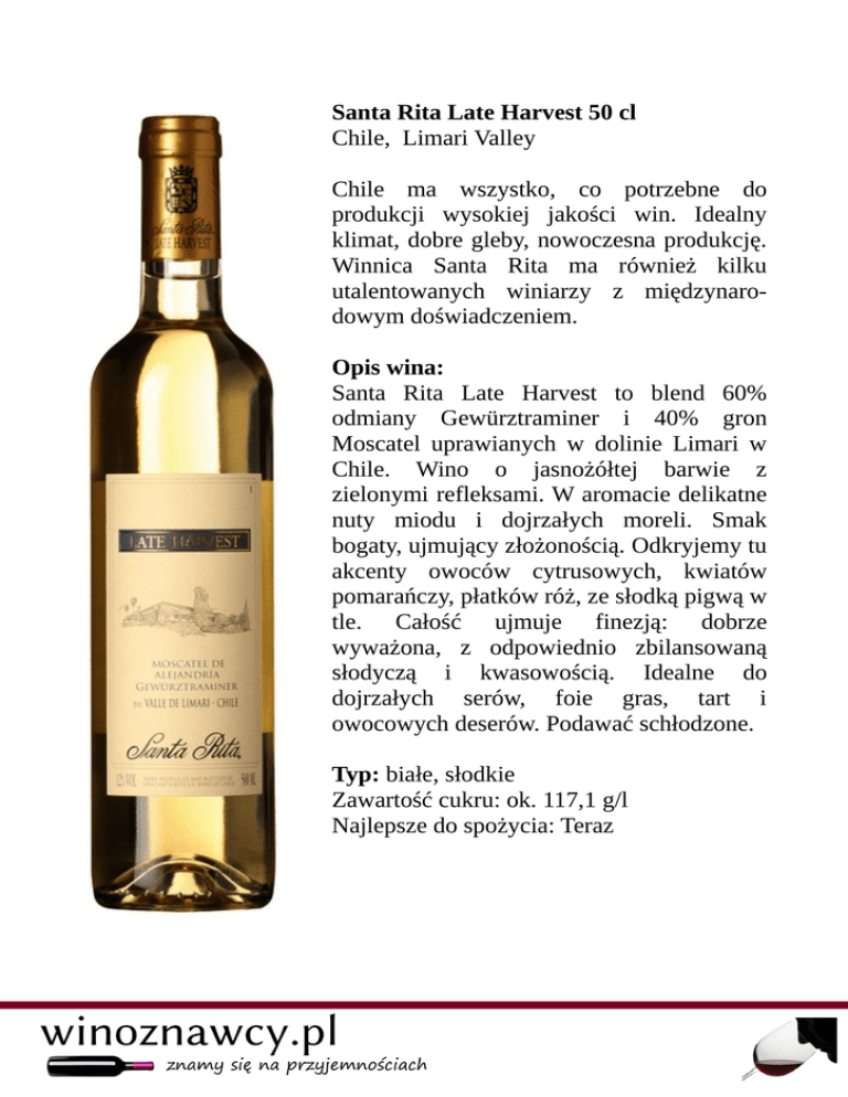 Santa Rita Late Harvest 50 cl Chile, Limari Valley Chile ma wszystko, co potrzebne do produkcji wysokiej jakości win. Idealny klimat, dobre gleby, nowoczesna produkcję. Winnica Santa Rita ma również kilku utalentowanych winiarzy z międzynarodowym doświadczeniem. Opis wina: Santa Rita Late Harvest to blend 60% odmiany Gewürztraminer i 40% gron Moscatel uprawianych w dolinie Limari w Chile. Wino o jasnożółtej barwie z zielonymi refleksami. W aromacie delikatne nuty miodu i dojrzałych moreli. Smak bogaty, ujmujący złożonością. Odkryjemy tu akcenty owoców cytrusowych, kwiatów pomarańczy, płatków róż, ze słodką pigwą w tle. Całość ujmuje finezją: dobrze wyważona, z odpowiednio zbilansowaną słodyczą i kwasowością. Idealne do dojrzałych serów, foie gras, tart i owocowych deserów. Podawać schłodzone. Typ: białe, słodkie Zawartość cukru: ok. 117,1 g/l Najlepsze do spożycia: Teraz