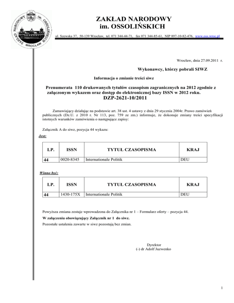 ZAKŁAD NARODOWY im. OSSOLIŃSKICH ul. Szewska 37, 50-139 Wrocław, tel. 071 344-44-71, fax 071 344-85-61, NIP 897-10-82-476, www.oss.wroc.pl Wrocław, dnia 27.09.2011 r. Wykonawcy, którzy pobrali SIWZ Informacja o zmianie treści siwz Prenumerata 110 drukowanych tytułów czasopism zagranicznych na 2012 zgodnie z załączonym wykazem oraz dostęp do elektronicznej bazy ISSN w 2012 roku. DZP-2621-10/2011 Zamawiający działając na podstawie art. 38 ust. 4 ustawy z dnia 29 stycznia 2004r. Prawo zamówień publicznych (Dz.U. z 2010 r. Nr 113, poz. 759 ze zm.) informuje, że dokonuje zmiany treści specyfikacji istotnych warunków zamówienia o następujące zapisy: Załącznik A do siwz, pozycja 44 wykazu: Jest: LP. 44 ISSN 0020-8345 TYTUŁ CZASOPISMA Internationale Politik KRAJ DEU Winno być: LP. 44 ISSN 1430-175X TYTUŁ CZASOPISMA Internationale Politik KRAJ DEU Powyższa zmiana zostaje wprowadzona do Załącznika nr 1 – Formularz oferty – pozycja 44. W załączeniu obowiązujący Załącznik nr 1 do siwz. Pozostałe ustalenia zawarte w siwz pozostają bez zmian. Dyrektor (-) dr Adolf Juzwenko 1 Załącznik Nr 1 Miejsce i data …………………… OFERTA NA WYKONANIE ZAMÓWIENIA Przetarg nieograniczony nr DZP-2621-10/2011 o wartości szacunkowej poniżej kwoty określonej w przepisach wydanych na podstawie art. 11 ust. 8 Prenumerata 110 drukowanych tytułów czasopism zagranicznych na 2012 zgodnie z załączonym wykazem oraz dostęp do elektronicznej bazy ISSN w 2012 roku. 1. 2. Niniejszą ofertę składa : Nazwa adres Wykonawca (..................................................... ...) (...........................................) Wykonawca (..................................................... ...) (.........................................) Przedstawiciel Wykonawcy uprawniony do Kontaktów Imię i Nazwisko (........................................................................................) 3. Adres (........................................................................................) Telefon (........................................................................................) Fax. (........................................................................................) E-mail (........................................................................................) Deklaracja Wykonawcy: W odpowiedzi na Ogłoszenie o Przetargu dla ww. zamówienia Ja (My), niżej podpisany(i), niniejszym oświadczam(y), że: 1. Zapoznałem/Zapoznaliśmy się i w pełni oraz bez żadnych zastrzeżeń akceptuję(emy) treść Specyfikacji Istotnych Warunków Zamówienia wraz z wyjaśnieniami i modyfikacjami. 2. W pełni i bez żadnych zastrzeżeń akceptuję(emy) warunki umowy na wykonanie zamówienia zapisane w SIWZ. 3. Oświadczamy, że ceny jednostkowe określone na formularzu cenowym będą stałe w całym okresie obowiązywania umowy. 4. Zapoznałem/Zapoznaliśmy się z warunkami realizacji oraz zdobyłem/zdobyliśmy wszelkie informacje konieczne do właściwego przygotowania niniejszej oferty. 5. Oferuję(emy) wykonanie przedmiotu zamówienia zgodnie z warunkami zapisanymi w SIWZ, wyjaśnieniami do SIWZ oraz jej modyfikacjami oraz obowiązującymi przepisami. 6. Termin realizacji: 01.01.2012 – 31.12.2012 r. 7. Posiadam możliwości techniczne do umożliwienia odbiorcy zgłaszania reklamacji niedostarczonych tytułów oraz kontrolę ich wpływu w formie elektronicznego serwisu on-line. 8. Wartość oferty za wykonanie: LP. 1. 2. 3. ISSN 0002-8762 0026-3079 0395-2649 TYTUŁ CZASOPISMA American Historical Review American Studies Annales: Histoire,Sciences,Sociales Cena Wartoś VAT Wartość KRA netto ć netto brutto J roczni ka USA USA FRA 2 4. 5. 0003-8946 0001-2343 6. 0004-1327 7. 8. 9. 10. 0004-3168 0061-7393 0340-0409 0007-0882 11. 0007-6287 12. 13. 14. 15. 16. 17. 18. 19. 0009-0468 0862-6111 0009-0786 1362-1025 0010-4124 1713-9198 0011-5266 0012-1045 20. 21. 22. 23. 24. 25. 26. 27. 0130-321X brak brak 0013-0613 0014-0759 0304-2782 0014-2751 1384-6299 28. 1062-7987 29. 30. 31. 32. 33. 34. 35. 0014-5270 0235-1188 brak 0016-741X 1212-4222 1563-3233 0984-2292 36. 37. 38. 39. 40. 41. 42. 43. 44. 45. 46. 0072-9094 0740-5944 0018-2176 0018-2575 0018-2613 0018-2648 0018-7364 0308-5694 1430-175X 1362-5179 0021-8529 47. 48. 49. 1520-3972 0022-281X 1868-0860 50. 51. 0022-3840 0022-9164 52. Archiv fur Begriffsgeschichte Archiv fur Rechts- und Sozialphilosophie ARIEL : a review of international English literature Art et Decoration Art Review Bibliographia Cartographica British Journal for the Philosophy of Science Burlington Magazine DEU DEU Ceska Literatura Cesky Casopis Historicky Cesky Jazyk a Literatura Citizeship Studies Comparative Literature Czas- Związkowiec Daedalus Deutsche Zeitschrift fuer Philosophie Dnipro Dziatwa Dziennik Kijowski Economist Esprit Europaeische Rundschau Europe: revue litteraire European Foreign Affairs Review European Review CZE CZE CZE GBR USA CAN USA DEU Express, L’ Filosofske Nauki Galicka Brama Geographical Magazine Głos Ludu Głos znad Niemna Guerres Mondiales et Conflicts Contemporains Gutenberg Jahrbuch Gwiazda Polarna Hispanic Review Historicky Casopis Historische Zeitschrift History Humanisme Imago Mundi Internationale Politik Journal for Cultural Research Journal of Aestetics and Art Criticism Journal of Cold War Studies Journal of Modern Literature Journal of Papierconservation (dawniej Papierrestaurierung) Journal of Popular Culture Kartographische Nachrichten CAN FRA GBR DEU GBR GBR UKR GBR UKR GBR FRA AUT FRA GBR GBR FRA RUS UKR GBR CZE BLR FRA DEU USA USA SVK DEU GBR FRA GBR DEU GBR USA USA USA DEU USA DEU Kulturaustausch : Zeitschrift für DEU 3 53. 54. 55. 56. 57. 58. 59. 60. 61. 62. 63. 64. 65. 1392-0405 0025-2948 0025-4606 0869-0522 0027-8203 0027-9358 0090-5992 1354-5078 0028-6087 0163-7053 0029-5418 1064-8402 0078-2696 66. 67. 68. 69. 70. 71. 72. 73. 74. 75. 76. 77. 0029-6074 0250-7838 0029-6147 0030-6428 0739-9766 0266-4399 0