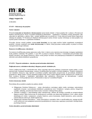 etapy wsparcia 25.08.2016 ETAP I - Rekrutacja do projektu Nabór wniosków Wnioski (wyłącznie na formularzu rekrutacyjnym) można będzie składać w biurze projektu lub w jednym z Powiatowych Punktów Informacyjnych. Wzory wszystkich niezbędnych dokumentów – regulaminów i formularzy zostaną udostępnine jako załączniki do ogłoszenia o naborze, które zostanie opublikowane nie później niż 10 dni roboczych przed dniem rozpoczęcia rekrutacji do projektu. W Powiatowych Punktach Informacyjnych można również uzyskać informacje na temat projektu oraz uzyskać pomoc techniczną w wypełnieniu formularza. Wszystkie złożone wnioski poddane zostaną ocenie formalnej (na tym etapie możliwe będzie uzupełnienie ewentualnych pomyłek i złożenie wyjaśnień) oraz ocenie merytorycznej (w trakcie, której przyznane zostaną punkty za pomysł na biznes i przygotowanie do jego realizacji). Rozmowa kwalifikacyjna z doradcami Na rozmowę kwalifikacyjną zostaną zaproszone osoby, które w trakcie oceny merytorycznej otrzymają wymaganą regulaminem liczbę punktów (minimum 70% punktów, w tym 50% za pomysł na biznes). Rozmowy z wnioskodawcami prowadzić będą doradca zawodowy oraz doradca biznesowy, którzy ocenią pomysł na biznes oraz predyspozycje kandydata do samodzielnego założenia i prowadzenia działalności gospodarczej. ETAP II - Wsparcie szkoleniowo - doradcze przed założeniem działalności Podpisanie umowy szkoleniowo-doradczej i diagnoza potrzeb szkoleniowych. Umowy podpisywane będą z wnioskodawcami, którzy otrzymają najwyższą punktację (zsumowane zostaną punkty z oceny merytorycznej, formularza rekrutacyjnego, rozmowy kwalifikacyjnej oraz punkty za kryteria dodatkowe. Wsparcie szkoleniowe oraz doradztwo biznesowe mają zapewnić uczestnikom projektu odpowiednie przygotowanie do prowadzenia działalności gospodarczej, dlatego bardzo ważnym elementem podpisywanej umowy będzie diagnoza potrzeb szkoleniowych i doradczych, która wyznaczy każdemu z kandydatów indywidualny plan szkoleniowy dostosowany do doświadczenia i potrzeb wnioskodawcy. Z chwilą podpisania umowy Wnioskodawca staje się Uczestnikiem Projektu. Zakres tematyczny szkoleń Przewidziano dla uczestników projektu trzy pakiety szkoleń Obligatoryjne Szkolenia Podstawowe – zestaw obowiązkowy zawierający pakiet wiedzy zawierający najważniejsze zagadnienia związane z prowadzeniem działalności gospodarczej (m.in. formalności i przepisy prawne, księgowość i podatki, marketing, pozyskiwanie finansowania, tworzenie i realizacja biznes planu); Szkolenia wynikające z indywidualnego planu szkoleniowego, dobrane dla każdego uczestnika po przeprowadzeniu diagnozy potrzeb. Będą dostosowane do predyspozycji uczestnika oraz planowanej działalności (m.in.: pakiet szkoleń aktualizujących wiedzę i umiejętności, przepisy branżowe, prawa konsumenta, handel internetowy, prawa autorskie, ochrona danych osobowych, handel zagraniczny); Obligatoryjne Szkolenia Warsztatowe – zestaw obowiązkowy warsztatów, które w sposób praktyczny pomogą utrwalić cechy osobowości oraz umiejętności przyszłych przedsiębiorców (motywacja, negocjacje, pozyskanie i obsługa klienta, psychologia biznesu). Zakres doradztwa przed założeniem działalności 1 https://www.marr.pl/projekty/dcbtarnow/etapy-wsparcia.html Dla każdego uczestnika projektu przewidziano 20 godzin indywidualnej pomocy doradczej dostosowanej do potrzeb oraz rodzaju prowadzonej działalności. Wspólnie z doradcą zostanie dopracowany biznesplan przyszłej działalności oraz będą rozwiązywane potencjalne problemy jakie pojawią się na etapie planowania. ETAP III - Przyznanie dotacji oraz wsparcia pomostowego szkoleniowo-doradczego Składanie biznesplanów Aby ubiegać się o dotację oraz wsparcie pomostowe szkoleniowo-doradcze należy przedstawić biznesplan przyszłej działalności, który dołącza się do wniosku o wsparcie finansowe. Biznesplany opracowane są na podstawie zdobytej wiedzy na etapie szkoleniowo doradczym (przed założeniem firmy) i są podstawą oceny powodzenia przyszłej działalności oraz przyznania przyszłemu przedsiębiorcy dalszej pomocy. Złożone dokumenty poddane zostaną ocenie formalnej i merytorycznej – punktowej. Ocena merytoryczna prowadzona będzie przez Komisję Oceny Projektów na podstawie z góry ustalonych zasad oceny, które zostaną przedstawione wszystkim uczestnikom na etapie szkoleniowo-doradczym przed złożeniem wniosków. Założenie działalności gospodarczej Uczestnicy projektu, którzy otrzymają pozytywne rekomendacje (ocena merytoryczna biznesplanów) aby móc uzyskać dalsze wsparcie już jako przedsiębiorcy powinni zarejestrować działalność gospodarczą. Wypłata dotacji i rozliczanie wydatków Z chwilą podpisania Umowy o udzielenie wsparcia finansowego oraz Umowy o udzielenie wsparcia pomostowego szkoleniowodoradczego uczestnik projektu staje się grantobiorcą. Wysokość dotacji (grantu) zależy od statystycznej wartości 6-krotności przeciętnego wynagrodzenia, natomiast dokładana kwota zostanie podana w ogłoszeniu o naborze już na etapie rekrutacji. Dotacja zostanie wypłacona na konto Grantobiorcy i może zostać przeznaczona na uruchomienie działalności ale zgodnie z przeznaczeniem, jaki został opisany w biznesplanie. Wsparcie pomostowe szkoleniowo-doradcze w prowadzeniu działalności gospodarczej Z uwagi na wiele problemów, z jakimi mogą zetknąć się początkujący przedsiębiorcy, wsparcie szkoleniowo-doradcze w prowadzeniu działalności gospodarczej stanowi bardzo ważny element projektu. Celem tej pomocy jest bezpieczne uruchomienie i utrzymanie nowo założonych przedsiębiorstw, tak aby firmy nie tylko funkcjonowały w wymaganym okresie trwałości, ale również stanowiły dla grantobiorców trwałe źródło utrzymania i rozwoju. Przez 12 miesięcy od rozpoczęcia działalności gospodarczej przedsiębiorca będzie mógł skorz
