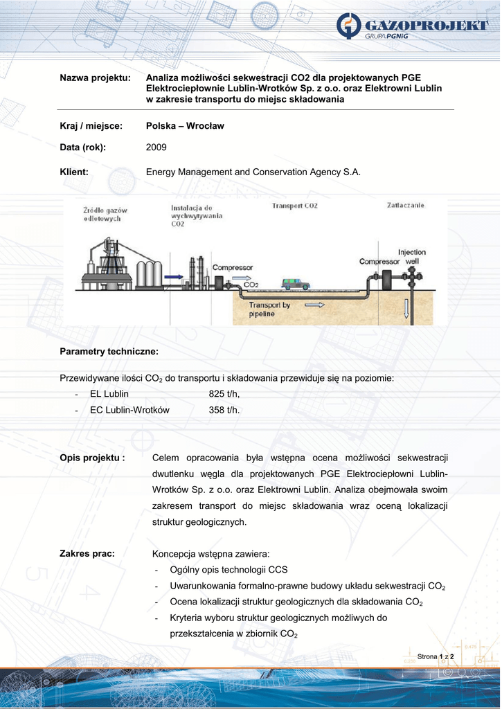Nazwa projektu: Analiza możliwości sekwestracji CO2 dla projektowanych PGE Elektrociepłownie Lublin-Wrotków Sp. z o.o. oraz Elektrowni Lublin w zakresie transportu do miejsc składowania Kraj / miejsce: Polska – Wrocław Data (rok): 2009 Klient: Energy Management and Conservation Agency S.A. Parametry techniczne: Przewidywane ilości CO2 do transportu i składowania przewiduje się na poziomie: - EL Lublin 825 t/h, - EC Lublin-Wrotków 358 t/h. Opis projektu : Celem opracowania była wstępna ocena możliwości sekwestracji dwutlenku węgla dla projektowanych PGE Elektrociepłowni LublinWrotków Sp. z o.o. oraz Elektrowni Lublin. Analiza obejmowała swoim zakresem transport do miejsc składowania wraz oceną lokalizacji struktur geologicznych. Zakres prac: Koncepcja wstępna zawiera: - Ogólny opis technologii CCS - Uwarunkowania formalno-prawne budowy układu sekwestracji CO2 - Ocena lokalizacji struktur geologicznych dla składowania CO2 - Kryteria wyboru struktur geologicznych możliwych do przekształcenia w zbiornik CO2 Strona 1 z 2 - Propozycje lokalizacji struktur dla magazynowania CO2 z Elektrowni w rejonie Lublina - Analiza tras rurociągu do potencjalnych miejsc składowania CO2 - Analizy hydrauliczne i cieplne rurociągu przesyłowego CO2 - Obliczenia wytrzymałościowe rur - Wstępna koncepcja obiektów technologicznych - System sterowania rurociągiem - Zakres rzeczowy i nakłady inwestycyjne na budowę instalacji transportu i składowania CO2 - Ryzyka w obszarze transportu CO2 - Harmonogram realizacji inwestycji Strona 2 z 2