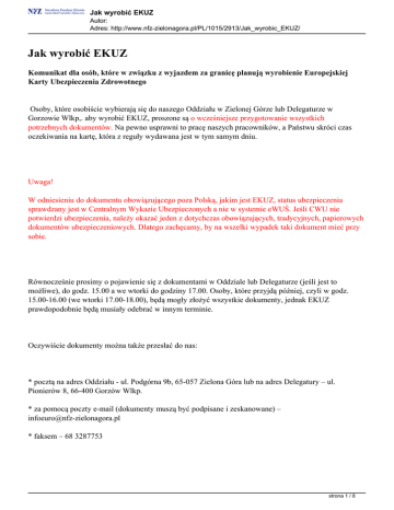 Jak wyrobić EKUZ Autor: Adres: http://www.nfz-zielonagora.pl/PL/1015/2913/Jak_wyrobic_EKUZ/ Jak wyrobić EKUZ Komunikat dla osób, które w związku z wyjazdem za granicę planują wyrobienie Europejskiej Karty Ubezpieczenia Zdrowotnego Osoby, które osobiście wybierają się do naszego Oddziału w Zielonej Górze lub Delegaturze w Gorzowie Wlkp,. aby wyrobić EKUZ, proszone są o wcześniejsze przygotowanie wszystkich potrzebnych dokumentów. Na pewno usprawni to pracę naszych pracowników, a Państwu skróci czas oczekiwania na kartę, która z reguły wydawana jest w tym samym dniu. Uwaga! W odniesieniu do dokumentu obowiązującego poza Polską, jakim jest EKUZ, status ubezpieczenia sprawdzany jest w Centralnym Wykazie Ubezpieczonych a nie w systemie eWUŚ. Jeśli CWU nie potwierdzi ubezpieczenia, należy okazać jeden z dotychczas obowiązujących, tradycyjnych, papierowych dokumentów ubezpieczeniowych. Dlatego zachęcamy, by na wszelki wypadek taki dokument mieć przy sobie. Równocześnie prosimy o pojawienie się z dokumentami w Oddziale lub Delegaturze (jeśli jest to możliwe), do godz. 15.00 a we wtorki do godziny 17.00. Osoby, które przyjdą później, czyli w godz. 15.00-16.00 (we wtorki 17.00-18.00), będą mogły złożyć wszystkie dokumenty, jednak EKUZ prawdopodobnie będą musiały odebrać w innym terminie. Oczywiście dokumenty można także przesłać do nas: * pocztą na adres Oddziału - ul. Podgórna 9b, 65-057 Zielona Góra lub na adres Delegatury – ul. Pionierów 8, 66-400 Gorzów Wlkp. * za pomocą poczty e-mail (dokumenty muszą być podpisane i zeskanowane) – [email protected] * faksem – 68 3287753 strona 1 / 8 Jak wyrobić EKUZ Autor: Adres: http://www.nfz-zielonagora.pl/PL/1015/2913/Jak_wyrobic_EKUZ/ EKUZ nie trzeba odbierać osobiście. We wniosku można zaznaczyć, że ma być odesłana pocztą na wskazany adres. W tej sytuacji jednak trzeba się liczyć z dłuższym oczekiwaniem na kartę. JAKIE DOKUMENTY PRZYGOTOWAĆ? 1. Wniosek o wydanie EKUZ (uwaga, prosimy pobrać właściwy!) - druk wniosku dla osób wyjeżdżających w związku z czasowym pobytem (np. turystycznym) - pobierz - druk wniosku dla osób oddelegowanych przez pracodawcę – pobierz 2. W celu uzyskania EKUZ, wnioskodawca dla którego NFZ nie może potwierdzić prawa do świadczeń na koszt NFZ, powinien okazać przy składaniu wniosku następujące dokumenty: Wyjazd turystyczny: Do wniosku warto dołączyć dokument potwierdzający ubezpieczenie zdrowotne Dla osób ubezpieczonych, odpowiednio do sytuacji, np.: * aktualne zaświadczenie wypełnione przez płatnika składki, strona 2 / 8 Jak wyrobić EKUZ Autor: Adres: http://www.nfz-zielonagora.pl/PL/1015/2913/Jak_wyrobic_EKUZ/ * aktualne zaświadczenie z KRUS o podleganiu i opłaceniu składek na powszechne ubezpieczenie zdrowotne, * aktualne zaświadczenia z ZUS o niezaleganiu w opłacaniu składek, dowód wpłaty składki na ubezpieczenie zdrowotne (tylko dla osób prowadzących działalność gospodarczą), * aktualne dokumenty zawierające zestawienie należnych składek zdrowotnych: ZUS RMUA, ZUS RZA, ZUS RCA – w odniesieniu do pracowników i członków ich rodzin, * legitymacja emeryta/rencisty, * aktualne zaświadczenie o pobieraniu zasiłku przedemerytalnego, * aktualne zaświadczenie wystawione przez urząd pracy w przypadku bezrobotnych niepodlegających ubezpieczeniu z innego tytułu, * aktualne zaświadczenie z uczelni o zgłoszeniu do ubezpieczenia studenta niepodlegającego ubezpieczeniu z innego tytułu, * dokument potwierdzający zgłoszenie do ubezpieczenia – ZUS ZUA – w przypadku osób, które w dniu składania wniosku nie były ustawowo zobowiązane do opłacenia pierwszej składki na ubezpieczenie zdrowotne licząc od dnia powstania obowiązku ubezpieczenia. Dla członków rodziny, odpowiednio do sytuacji, np.: * dokument potwierdzający uprawnienia do świadczeń osoby ubezpieczonej (głównego ubezpieczonego) oraz zgłoszenie do ubezpieczenia członka rodziny (druk ZUS ZCNA / ZUS ZCZA) * w przypadku dzieci, które ukończyły 18 rok życia, aktualny dokument potwierdzający kontynuację nauki lub niepełnosprawność, * w przypadku członków rodziny zgłoszonych do ubezpieczenia w KRUS, aktualne zaświadczenie o okresach podlegania ubezpieczeniu zdrowotnemu. Uwaga! W przypadku uczniów/studentów, którzy ukończyli lub przerwali naukę, należy przedłożyć stosowny dokument, np.: świadectwo ukończenia szkoły, dyplom ukończenia studiów wyższych, zaświadczenie o skreśleniu z listy uczniów/studentów. strona 3 / 8 Jak wyrobić EKUZ Autor: Adres: http://www.nfz-zielonagora.pl/PL/1015/2913/Jak_wyrobic_EKUZ/ Dla nieubezpieczonego – uprawnionego do świadczeń (zgodnie z art. 2 ust. 1 pkt 2 i 3 ustawy o świadczeniach: * decyzja wójta (burmistrza, prezydenta) gminy właściwej ze względu na miejsce zamieszkania świadczeniobiorcy, potwierdzająca to prawo, * dokument potwierdzający tożsamość, * zaświadczenie od lekarza (z datą nie wcześniejszą niż 30 dni przed złożeniem wniosku), ewentualnie karta przebiegu ciąży, * skrócony odpis aktu urodzenia, * dokument potwierdzający zamieszkiwanie na terytorium RP (nie dotyczy dzieci do 18. roku życia) Oprócz wszystkich ww. dokumentów dopuszcza się możliwość przedstawiania przez ubezpieczonych innych dokumentów, wystawionych przez właściwy organ, zawierających w szczególności informację o odprowadzeniu składek na ubezpieczenie zdrowotne. Wyjazd osoby delegowanej: Do wniosku należy dołączyć formularz A1 Wyjazd do szkoły, na studia Do wniosku należy dołączyć: zaświadczenie o podjęciu studiów lub nauki w szkole zawierające daty trwania danego semestru/programu Erasmus itp. (od….do…), tj.: * zaświadczenie wydane przez polską uczelnię / szkołę delegującą wnioskodawcę do podjęcia nauki / strona 4 / 8 Jak wyrobić EKUZ Autor: Adres: http://www.nfz-zielonagora.pl/PL/1015/2913/Jak_wyrobic_EKUZ/ odbycia 