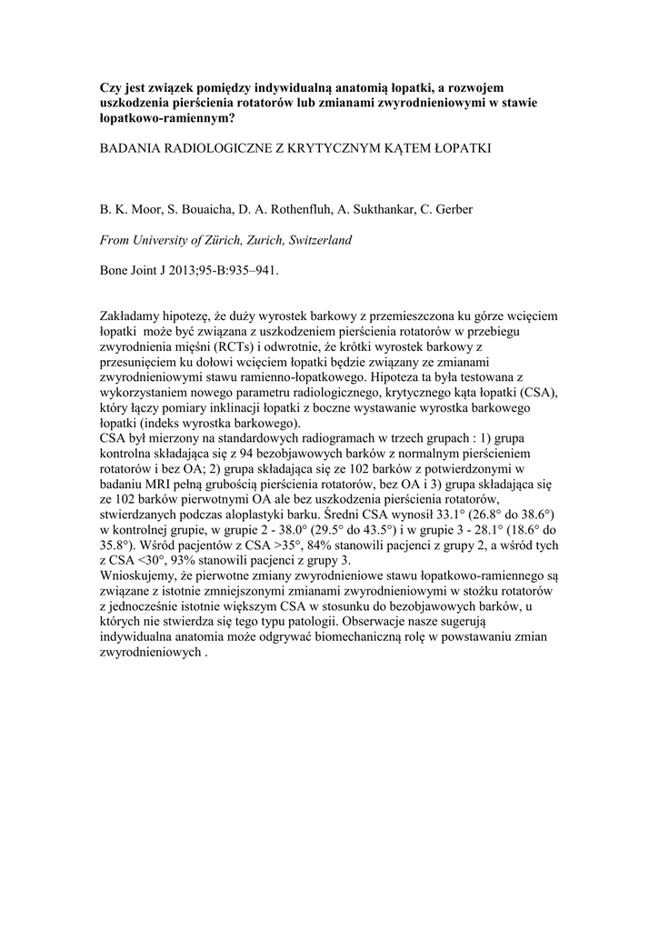 Czy jest związek pomiędzy indywidualną anatomią łopatki, a rozwojem uszkodzenia pierścienia rotatorów lub zmianami zwyrodnieniowymi w stawie łopatkowo-ramiennym? BADANIA RADIOLOGICZNE Z KRYTYCZNYM KĄTEM ŁOPATKI B. K. Moor, S. Bouaicha, D. A. Rothenfluh, A. Sukthankar, C. Gerber From University of Zürich, Zurich, Switzerland Bone Joint J 2013;95-B:935–941. Zakładamy hipotezę, że duży wyrostek barkowy z przemieszczona ku górze wcięciem łopatki może być związana z uszkodzeniem pierścienia rotatorów w przebiegu zwyrodnienia mięśni (RCTs) i odwrotnie, że krótki wyrostek barkowy z przesunięciem ku dołowi wcięciem łopatki będzie związany ze zmianami zwyrodnieniowymi stawu ramienno-łopatkowego. Hipoteza ta była testowana z wykorzystaniem nowego parametru radiologicznego, krytycznego kąta łopatki (CSA), który łączy pomiary inklinacji łopatki z boczne wystawanie wyrostka barkowego łopatki (indeks wyrostka barkowego). CSA był mierzony na standardowych radiogramach w trzech grupach : 1) grupa kontrolna składająca się z 94 bezobjawowych barków z normalnym pierścieniem rotatorów i bez OA; 2) grupa składająca się ze 102 barków z potwierdzonymi w badaniu MRI pełną grubością pierścienia rotatorów, bez OA i 3) grupa składająca się ze 102 barków pierwotnymi OA ale bez uszkodzenia pierścienia rotatorów, stwierdzanych podczas aloplastyki barku. Średni CSA wynosił 33.1° (26.8° do 38.6°) w kontrolnej grupie, w grupie 2 - 38.0° (29.5° do 43.5°) i w grupie 3 - 28.1° (18.6° do 35.8°). Wśród pacjentów z CSA >35°, 84% stanowili pacjenci z grupy 2, a wśród tych z CSA <30°, 93% stanowili pacjenci z grupy 3. Wnioskujemy, że pierwotne zmiany zwyrodnieniowe stawu łopatkowo-ramiennego są związane z istotnie zmniejszonymi zmianami zwyrodnieniowymi w stożku rotatorów z jednocześnie istotnie większym CSA w stosunku do bezobjawowych barków, u których nie stwierdza się tego typu patologii. Obserwacje nasze sugerują indywidualna anatomia może odgrywać biomechaniczną rolę w powstawaniu zmian zwyrodnieniowych .