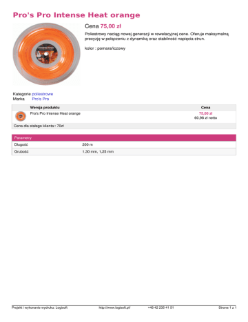 Pro's Pro Intense Heat orange Cena 75,00 zł Poliestrowy naciąg nowej generacji w rewelacyjnej cene. Oferuje maksymalną precyzję w połączeniu z dynamiką oraz stabilność napięcia strun. kolor : pomarańczowy Kategorie poliestrowe Marka Pro's Pro Wersja produktu Cena Pro's Pro Intense Heat orange 75,00 zł 60,98 zł netto Cena dla stałego klienta:: 70zł Parametry Długość 200 m Grubość 1,30 mm, 1,25 mm Projekt i wykonanie wydruku: Logisoft Powered by TCPDF (www.tcpdf.org) http://www.logisoft.pl/ +48 42 235 41 51 Strona 1 z 1