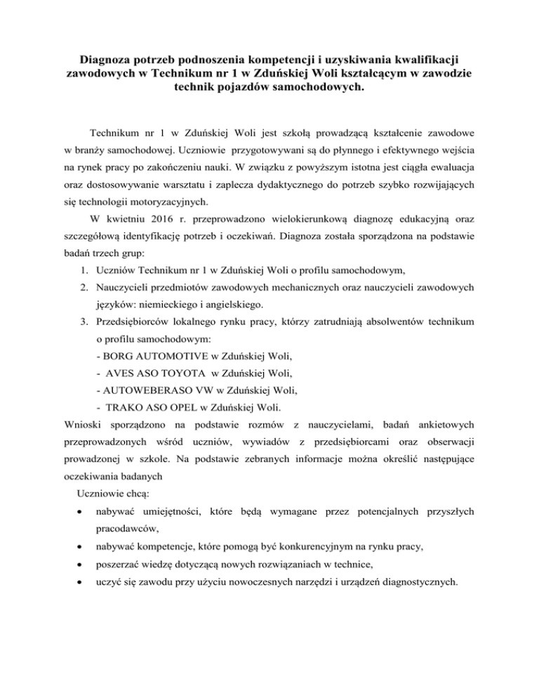 Diagnoza potrzeb podnoszenia kompetencji i uzyskiwania kwalifikacji zawodowych w Technikum nr 1 w Zduńskiej Woli kształcącym w zawodzie technik pojazdów samochodowych. Technikum nr 1 w Zduńskiej Woli jest szkołą prowadzącą kształcenie zawodowe w branży samochodowej. Uczniowie przygotowywani są do płynnego i efektywnego wejścia na rynek pracy po zakończeniu nauki. W związku z powyższym istotna jest ciągła ewaluacja oraz dostosowywanie warsztatu i zaplecza dydaktycznego do potrzeb szybko rozwijających się technologii motoryzacyjnych. W kwietniu 2016 r. przeprowadzono wielokierunkową diagnozę edukacyjną oraz szczegółową identyfikację potrzeb i oczekiwań. Diagnoza została sporządzona na podstawie badań trzech grup: 1. Uczniów Technikum nr 1 w Zduńskiej Woli o profilu samochodowym, 2. Nauczycieli przedmiotów zawodowych mechanicznych oraz nauczycieli zawodowych języków: niemieckiego i angielskiego. 3. Przedsiębiorców lokalnego rynku pracy, którzy zatrudniają absolwentów technikum o profilu samochodowym: - BORG AUTOMOTIVE w Zduńskiej Woli, - AVES ASO TOYOTA w Zduńskiej Woli, - AUTOWEBERASO VW w Zduńskiej Woli, - TRAKO ASO OPEL w Zduńskiej Woli. Wnioski sporządzono na podstawie rozmów z nauczycielami, badań ankietowych przeprowadzonych wśród uczniów, wywiadów z przedsiębiorcami oraz obserwacji prowadzonej w szkole. Na podstawie zebranych informacje można określić następujące oczekiwania badanych Uczniowie chcą: nabywać umiejętności, które będą wymagane przez potencjalnych przyszłych pracodawców, nabywać kompetencje, które pomogą być konkurencyjnym na rynku pracy, poszerzać wiedzę dotyczącą nowych rozwiązaniach w technice, uczyć się zawodu przy użyciu nowoczesnych narzędzi i urządzeń diagnostycznych. II Nauczyciele przedmiotów zawodowych widzą potrzebę: podnoszenia własnych kompetencji zawodowych, aby uczniowie a przyszli pracownicy mogli sprostać wymaganiom szybko rozwijającego się przemysłu, kontaktu uczniów i nauczycieli z nowoczesnymi rozwiązaniami, technologicznymi tj: nowoczesnymi pojazdami samochodowymi oraz metodami ich obsługi, diagnostyki, naprawy. doposażenia pracowni ćwiczeń praktycznych, poprzez zakup narzędzi, urządzeń do diagnostyki pojazdów samochodowych. IV Pracodawcy wymagają przy zatrudnieniu: pracownika znającego podstawy budowy i naprawy pojazdu samochodowego, pracownika, który posiada praktyczne umiejętności samodzielnej naprawy i diagnozowania pojazdów samochodowych, absolwenta szkoły w pełni przygotowanego do podjęcia pracy zaraz po zakończeniu technikum, pracownika posiadającego praktyczne umiejętności dokonywania samodzielnych pomiarów warsztatowych. Mając na uwadze potrzebę kontynuacji projektu „Od mechanika do wykwalifikowanego pracownika” RPLD-11.03.00-IZ-10-001/15, który będzie realizowany w naszej szkole od 15.07.2016 r. oraz analizując oczekiwania badanych grup zasadne jest złożenie wniosku na dofinansowanie projektu w konkursie nr RPLD - 11.03.01 - IZ.00 - 10-001/16w ramach Osi Priorytetowej XI, Działania XI.3, Regionalnego Programu Operacyjnego Województwa Łódzkiego na lata 2014-2020, w którym zawarte będą zadania niezbędne do zaspokojenia potrzeb badanej grupy: 1. Realizacja szkolenia „Nowoczesne techniki obsługi i naprawy pojazdów samochodowych” dla uczniów w certyfikowanych ośrodkach szkolenia branży motoryzacyjnej. 2. Adaptacja oraz doposażenie pracowni ćwiczeń praktycznych w warsztatach szkolnych, 3. Doposażenie pracowni pojazdów samochodowych. 4. Kursy zawodowe dla nauczycieli: nowoczesnej diagnostyki pojazdów samochodowych, doskonalenia techniki jazdy, programów eksperckich napraw pojazdów samochodowych AUDATEX 5. Kursy zawodowe dla uczniów prowadzone w certyfikowanych ośrodkach szkolenia branży motoryzacyjnej: pomiaru i regulacji geometrii zawieszeń, praktycznej diagnostyki pojazdów z wykorzystaniem testera diagnostycznego, napraw silników Benzynowych i Diesla, doskonalenia techniki jazdy, 6. Staże zawodowe dla uczniów u pracodawców, 7. Wyjazdy studyjne (edukacyjne) na: Targi samochodowe Motor show, Targi części narzędzi i wyposażenia warsztatów InterCars, Linię produkcyjną Volkswagena w Wolfsburgu (ośrodek samochodowego) Opracowali: Sławomir Kornatka Radosław Michalski przemysłu