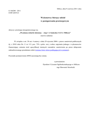 Milicz, dnia 9 czerwca 2011 roku S-146280 - 2011 (znak sprawy) Wykonawcy biorący udział w postępowaniu przetargowym dotyczy: przetargu nieograniczonego na; „Wymiana stolarki okiennej – etap 1 w budynku I LO w Miliczu” (nazwa zadania) W związku z art. 38 ust. 4 ustawy z dnia 29 stycznia 2004 r. prawo zamówień publicznych (tj. z 2010 roku Dz. U nr 113, poz. 759 z późn. zm.), wobec zapytania jednego z wykonawców Zamawiający zmienia treść specyfikacji istotnych warunków zamówienia po przez dołączenie zaktualizowanego przedmiaru robót (zmiana ilości okien podlegających wymianie). Pozostałe postanowienia SIWZ pozostają bez zmian. z poważaniem Dyrektor I Liceum Ogólnokształcącego w Miliczu mgr Sławomir Strzelecki