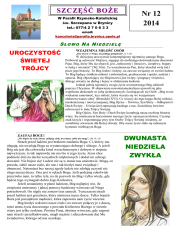 SZCZĘŚĆ BOŻE Nr 12 2014 W Parafii Rzymsko-Katolickiej św. Szczepana w Brynicy tel.: 077/4 2 7 0 6 3 3 email: [email protected] SŁOWO NA NIEDZIELĘ =========================================================================================================================================================================== UROCZYSTOŚĆ ŚWIETEJ TRÓJCY WZAJEMNA MIŁOŚĆ OSÓB „Kto wierzy w Niego, nie podlega potępieniu”. (J 3,18) W dzisiejszą uroczystość kontemplujemy tajemnicę samego Boga. Próbował ją uchwycić Mojżesz, sięgając do osobistego doświadczenia obecności Pana. Bóg, który Mu się objawił, jest „miłosierny i litościwy, cierpliwy, bogaty w łaskę i wierność” (Wj 34,6). To wszechmocny Pan, który ukochał swój lud i pisze jego historię. To Bóg Jeden i Jedyny, na zawsze związany ze swoim ludem. To Bóg będący źródłem miłości i miłosierdzia, przebaczenia i opieki, nadziei i oparcia. Bóg objawiający się Mojżeszowi jest święty i pragnący świętości, dlatego otwarty na dialog i hojny w obdarzaniu łaskami. Jednak pełnię tajemnicy swego życia wewnętrznego Bóg odsłonił poprzez Chrystusa. W objawieniu nowotestamentalnym ujawnił się jako wspólnota doskonale ze sobą zjednoczonych i kochających się Osób. „Bóg to nie wiekuista samotność, lecz miłość, która wyraża się we wzajemnym obdarowywaniu sobą” (Benedykt XVI). Co więcej: do tego kręgu Bożej miłości, nieskończonej i niewyczerpanej, Bóg Ojciec – Stwórca, Syn Boży – Odkupiciel i Duch Święty – Uświęciciel zapraszają każdego z nas. Zostaliśmy bowiem ochrzczeni w imię Trójcy Świętej. Bóg Ojciec, Syn Boży i Duch Święty kształtują naszą osobistą historię wiary. Są ostatecznym horyzontem naszego życia: naszą przyszłością. Czyniąc znak krzyża i wspominając przy tym Osoby Trójcy Świętej wiedzmy, że zostaliśmy stworzeni dla Bożej chwały. Oby nasze życie stało się radosnym hymnem wielbiącym Boga. =============================================================================================================================================================================== ZAUFAJ BOGU! „Nie bójcie się tych, którzy zabijają ciało, lecz duszy zabić nie mogą”. (Mt 10, 28) Strach przed ludźmi jest brakiem zaufania Bogu. Ci, którzy mu ulegają, nie uważają Boga za wystarczająco dobrego i silnego. A jeżeli Bóg nie jest dla człowieka kimś wszechmocnym i dobrym w stopniu najwyższym, to tak naprawdę nie ma Go w jego życiu. Jezus chce podnieść dziś na duchu wszystkich zalęknionych i dodać im odwagi słowami: Nie bójcie się! Ludzie nie są w stanie nas unicestwić. Mogą, co prawda, zabić nasze ciało, ale ono i tak kiedyś musi zwiędnąć i obumrzeć. Natomiast bez naszej zgody ludzie nie zdołają uczynić nic złego naszej duszy. Ona jest w rękach Boga. Jeśli podejmą cokolwiek przeciwko nam, to tylko tyle, na ile pozwoli im Bóg i tylko wtedy, gdy będzie tego wymagało dobro Jego Królestwa. Jeżeli zostaniemy wydani ludziom, Bóg najlepiej wie, ile cierpienia uniesiemy i jakiej pomocy będziemy wówczas od Niego potrzebowali. On nigdy nie zostawi nas samych. Tymczasem strach przed ludźmi jest grzechem, który uśmierca nasze dusze. Tylko bojaźń Boża jest początkiem mądrości, która zapewnia nam życie wieczne. Bóg kiedyś wskrzesi nasze ciało i na zawsze połączy je z duszą, toteż strata życia doczesnego z powodu Królestwa Bożego w świetle wiary jest tylko zyskiem. Prośmy Pana, abyśmy wówczas, gdy zagrozi nam strach i prześladowanie, mogli mężnie i zdecydowanie dać Mu świadectwo, którego od nas oczekuje. DWUNASTA NIEDZIELA ZWYKŁA INTENCJE MSZALNE – PORZĄDEK NABOŻEŃSTW od 15 do 22 czerwca 2014 roku. Niedziela 7.30 9.15 10.30 15.06 UROCZYSTOŚĆ TRÓJCY ŚWIĘTEJ. Odpust Luboszyce Do MBNP z podziękowaniem za otrzymane łaski z prośbą o dalszą opiekę Bożą z ok. 34 rocz. sakramentu małżeństwa oraz o bł. Boże w rodzinie i rodzinach dzieci. Grabczok Za †† matkę Gertrudę Sczepurek w 20 rocz. śm., ojca Piotra, braci Waltra, Gerharda, szwagra Józefa, z pok i dcc. Za †† Piotra Jendro, Gertrudę Jurczyk i z pokrewieństwa. Poniedziałek 16.06 7.00 Za †† Cecylię Polok z ok. ur., szwagra Herberta, brata Alojzego, jego żonę Hildegardę, rodziców, rodzeństwo i dcc. 18.00 Za †† rodziców Pawła i Marię Kałuża, siostrę Marię, brata Jerzego, męża Gintra Hyla, jego rodziców i z całego pokrewieństwa oraz dusze w czyśćcu cierpiące. Wtorek 17.06 Św. Alberta Chmielowskiego. 7.00 Za †† rodziców Annę i Jerzego Baldy, Gertrudę i Stefana Lisowskich, ciotkę Jadwigę Gralla, wszystkich z rodzin Woźnica, Baldy i Lisowski. Środa 18.06 j.n. 7.00 Czwartek 19.06 Boże Ciało. 7.00 Grabczok Za †† ojca Herberta Nanko w rocz. śm., żonę, syna Józefa i zięcia Krzysztofa oraz z pokrewieństwa. 8.30 Za parafian. 10.30 Piątek 20.06 Św. Alojzego Gonzagi. 17.00 Grabczok Do MBNP z podziękowaniem za odebrane łaski, z prośbą o dalsze zdrowie i bł. Boże z ok. 60 rocz. ur. p. Anny Gawlickiej. 18.00 Nabożeństwo eucharystyczne z procesją. Sobota 21.06 NMP Opolskiej. 16.00 W intencji rocznika 1974 z ok. spotkania klasowego. 18.00 O wieczną radość w niebie dla † Waltra Richter z ok. ur. Procesja eucharystyczna. Niedziela 22.06 DWUNASTA NIEDZIELA ZWYKŁA. Odpust Świerkli 7.30 W 30 dzień śmierci Piotra Chlubek. 9.30 Z podziękowaniem za otrzymane łaski z ok. 75 rocz. ur. Pawła Ciernia z prośbą o dalsze zdrowie i bł. Boże w rodzinie i rodzinach dzieci. 11.00 Grabczok W intencji żyjących i zmarłych parafian ku czci Św. Jana Chrzciciela. 15.00 Grabczok Nieszpory odpustowe. ====================================================================== OGŁOSZENIA: Bóg zapłać za sprzątanie świątyni. W tym tygodniu zapraszam: Beata Niedworok, Martyna Kowalczyk, Edyta Brzeźniak, Maria Mikoś Bóg zapłać za dyżur różańco
