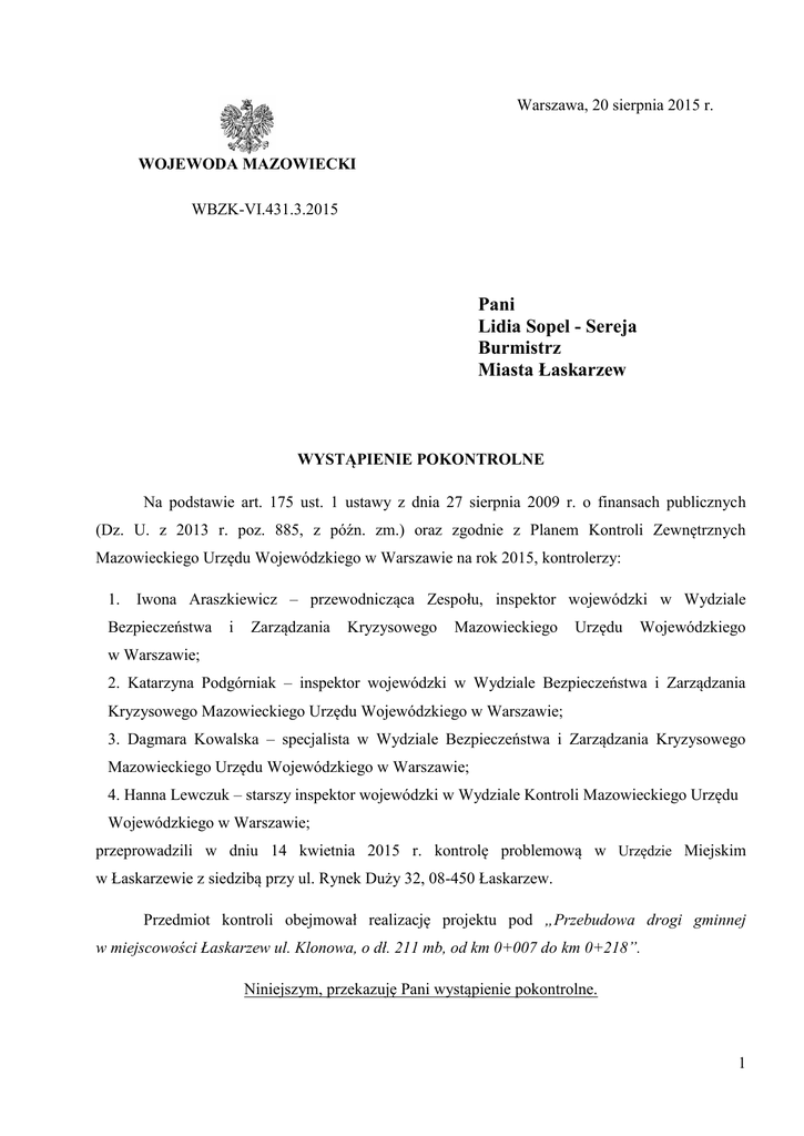 Warszawa, 20 sierpnia 2015 r. WOJEWODA MAZOWIECKI WBZK-VI.431.3.2015 Pani Lidia Sopel - Sereja Burmistrz Miasta Łaskarzew WYSTĄPIENIE POKONTROLNE Na podstawie art. 175 ust. 1 ustawy z dnia 27 sierpnia 2009 r. o finansach publicznych (Dz. U. z 2013 r. poz. 885, z późn. zm.) oraz zgodnie z Planem Kontroli Zewnętrznych Mazowieckiego Urzędu Wojewódzkiego w Warszawie na rok 2015, kontrolerzy: 1. Iwona Araszkiewicz – przewodnicząca Zespołu, inspektor wojewódzki w Wydziale Bezpieczeństwa i Zarządzania Kryzysowego Mazowieckiego Urzędu Wojewódzkiego w Warszawie; 2. Katarzyna Podgórniak – inspektor wojewódzki w Wydziale Bezpieczeństwa i Zarządzania Kryzysowego Mazowieckiego Urzędu Wojewódzkiego w Warszawie; 3. Dagmara Kowalska – specjalista w Wydziale Bezpieczeństwa i Zarządzania Kryzysowego Mazowieckiego Urzędu Wojewódzkiego w Warszawie; 4. Hanna Lewczuk – starszy inspektor wojewódzki w Wydziale Kontroli Mazowieckiego Urzędu Wojewódzkiego w Warszawie; przeprowadzili w dniu 14 kwietnia 2015 r. kontrolę problemową w Urzędzie Miejskim w Łaskarzewie z siedzibą przy ul. Rynek Duży 32, 08-450 Łaskarzew. Przedmiot kontroli obejmował realizację projektu pod „Przebudowa drogi gminnej w miejscowości Łaskarzew ul. Klonowa, o dł. 211 mb, od km 0+007 do km 0+218”. Niniejszym, przekazuję Pani wystąpienie pokontrolne. 1 W okresie objętym kontrolą ocenie poddane zostały następujące zagadnienia dotyczące realizacji przez Miasto Łaskarzew zadania pod nazwą „Przebudowa drogi gminnej w miejscowości Łaskarzew ul. Klonowa, o dł. 211 mb, od km 0+007 do km 0+218”: 1. Realizacja zakresu rzeczowego zadania: Kontrola realizacji zakresu rzeczowego zadania polegała na weryfikacji zgodności faktycznego wykonania zakresu rzeczowego ze wskazanymi w promesie, wniosku o dotację, harmonogramie rzeczowo – finansowym oraz protokole odbioru końcowego, efektami mierzalnymi i wskaźnikami produktu, stanowiącymi załączniki do umowy dotacji nr 6355.28.01.2014 z 8 sierpnia 2014 r. 2. Dokumentacja dotycząca realizacji zadania: Kontrola dokumentacji dotyczącej realizacji zadania polegała na sprawdzeniu, czy jednostka kontrolowana posiadała dokumenty dotyczące realizacji zadania objętego kontrolą oraz czy potwierdzają one realizację zadania zgodnie z promesą, wnioskiem o dotację oraz umową nr 6355.28.01.2014 z 8 sierpnia 2014 r. i obowiązującymi przepisami. 3. Przeprowadzenie postępowania o udzielenie zamówienia publicznego: Kontrola przeprowadzenia postępowania o udzielenie zamówienia publicznego polegała na weryfikacji, czy udzielenie zamówienia publicznego dotyczącego realizacji zadania zgodne było z przepisami ustawy z 29 stycznia 2004 r. Prawo zamówień publicznych (Dz. U. z 2013 r., poz. 907 z późn. zm.), zwaną dalej „ustawą Pzp”, w brzmieniu obowiązującym w dniu wszczęcia postępowania. 4. Realizacja zakresu finansowego zadania: Kontrola realizacji zakresu finansowego zadania polegała na sprawdzeniu, czy zakres finansowy zrealizowany został zgodnie z umową dotacji nr 6355.28.01.2014 z 8 sierpnia 2014 r. i obowiązującymi przepisami. 2 Ocena poszczególnych zagadnień objętych kontrolą prezentuje się następująco: a) Realizacja zakresu rzeczowego zadania – ocena pozytywna. Projekt pn. „Przebudowa drogi gminnej w miejscowości Łaskarzew, ul. Klonowa, o długości 211 mb, od km 0+007 do km 0+218” zakładał wykonanie nawierzchni z betonu asfaltowego na odcinku o długości 211,00 mb i szerokości 5,5 mb oraz wykonanie odwodnienia w postaci trzech przepustów. W miejscu realizacji projektu stwierdzono wykonane powyższych prac zgodnie z wnioskiem o dotację, harmonogramem rzeczowo – finansowym oraz pozostałymi dokumentami rozliczeniowymi. Przy przepuście zlokalizowanym w km 0+051 stwierdzono uszkodzenia płyt pod rurą odprowadzającą wodę z drogi oraz częściowe rozmycie skarpy rowu. b) Dokumentacja dotycząca realizacji zadania – ocena pozytywna z uchybieniami. W toku kontroli stwierdzono wprowadzenie protokółem na plac budowy z dnia 13.05.2014 r. oraz oświadczenie kierownika budowy o podjęciu pełnienia funkcji z dnia 13.05.2014 r., przed informacją z dnia 20.05.2014 r. o wyłonieniu wykonawcy w postępowaniu o udzielenie zamówienia publicznego. W dniu 21 maja 2015 r. skierowano pismo do jednostki w celu wyjaśnienia rozbieżności. Pismem znak OR.7313.3.2014 z dnia 25 maja 2015 r. wyjaśniono, że w oświadczeniu jak i w protokole została omyłkowo wpisana błędna data. c) Przeprowadzenie postępowania o udzielenie zamówienia publicznego – ocena pozytywna z uchybieniami. W trakcie kontroli postępowania o udzielenie zamówienia publicznego na zadanie pod nazwą „Przebudowa ulic – dróg gminnych w mieście Łaskarzew” – kontroli podano III część zadania obejmującą przebudowę drogi gminnej w miejscowości Łaskarzew przy ul. Klonowej, ustalono następujące uchybienia: – w protokole postępowania w trybie przetargu nieograniczonego podano inną datę powołania komisji niż w zarządzeniu Nr OR.0050.16.2013 Burmistrza Miasta Łaskarzew z dnia 11 kwietnia 2013 r. w sprawie powołania stałej komisji przetargowej w Urzędzie Miasta Łaskarzew. Ponadto stwierdzono brak uregulowania kwestii zakresu obowiązków oraz odpowiedzialności członków komisji. – w ogłoszeniu o zamówieniu nr 145510 – 2014 zamieszczonym 29.04.2014 r., (w sekcji III. 3) warunki udziału w postępowaniu oraz opis sposobu dokonywania oceny spełniania 3 tych warunków, Zamawiający nie precyzuje tych warunków pozostawia tylko sformułowanie na zasadzie spełnia/nie spełnia na podstawie złożonych dokumentów i oświadczeń opisanych w SIWZ. Mając na uwadze treść art. 22 ustawy Pzp należy podkreślić, że warunki udziału w postępowaniu oraz opis sposobu dokonania oceny spełnienia warunków Zamawiający określa w trybie przetargu nieograniczonego już w ogłoszeniu o zamówieniu, specyfikacji 