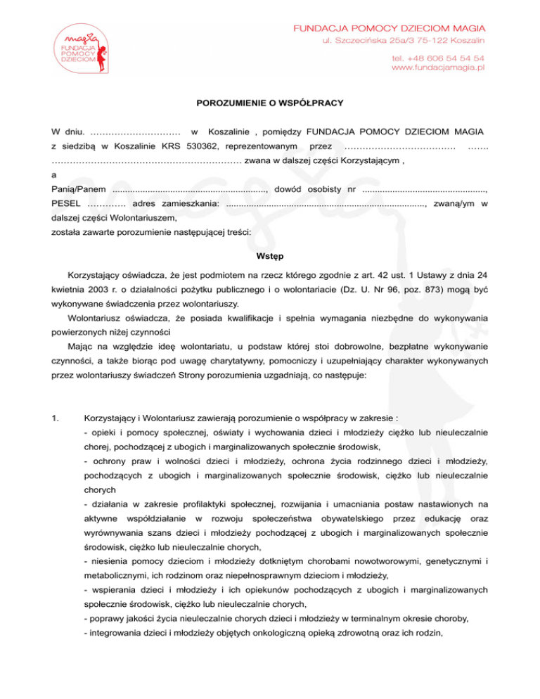 POROZUMIENIE O WSPÓŁPRACY W dniu. ………………………… w Koszalinie , pomiędzy FUNDACJA POMOCY DZIECIOM MAGIA z siedzibą w Koszalinie KRS 530362, reprezentowanym przez ………………………………. ……. ……………………………………………………… zwana w dalszej części Korzystającym , a Panią/Panem ............................................................., dowód osobisty nr ................................................., PESEL …………. adres zamieszkania: ..............................................................................., zwaną/ym w dalszej części Wolontariuszem, została zawarte porozumienie następującej treści: Wstęp Korzystający oświadcza, że jest podmiotem na rzecz którego zgodnie z art. 42 ust. 1 Ustawy z dnia 24 kwietnia 2003 r. o działalności pożytku publicznego i o wolontariacie (Dz. U. Nr 96, poz. 873) mogą być wykonywane świadczenia przez wolontariuszy. Wolontariusz oświadcza, że posiada kwalifikacje i spełnia wymagania niezbędne do wykonywania powierzonych niżej czynności Mając na względzie ideę wolontariatu, u podstaw której stoi dobrowolne, bezpłatne wykonywanie czynności, a także biorąc pod uwagę charytatywny, pomocniczy i uzupełniający charakter wykonywanych przez wolontariuszy świadczeń Strony porozumienia uzgadniają, co następuje: 1. Korzystający i Wolontariusz zawierają porozumienie o współpracy w zakresie : - opieki i pomocy społecznej, oświaty i wychowania dzieci i młodzieży ciężko lub nieuleczalnie chorej, pochodzącej z ubogich i marginalizowanych społecznie środowisk, - ochrony praw i wolności dzieci i młodzieży, ochrona życia rodzinnego dzieci i młodzieży, pochodzących z ubogich i marginalizowanych społecznie środowisk, ciężko lub nieuleczalnie chorych - działania w zakresie profilaktyki społecznej, rozwijania i umacniania postaw nastawionych na aktywne współdziałanie w rozwoju społeczeństwa obywatelskiego przez edukację oraz wyrównywania szans dzieci i młodzieży pochodzącej z ubogich i marginalizowanych społecznie środowisk, ciężko lub nieuleczalnie chorych, - niesienia pomocy dzieciom i młodzieży dotkniętym chorobami nowotworowymi, genetycznymi i metabolicznymi, ich rodzinom oraz niepełnosprawnym dzieciom i młodzieży, - wspierania dzieci i młodzieży i ich opiekunów pochodzących z ubogich i marginalizowanych społecznie środowisk, ciężko lub nieuleczalnie chorych, - poprawy jakości życia nieuleczalnie chorych dzieci i młodzieży w terminalnym okresie choroby, - integrowania dzieci i młodzieży objętych onkologiczną opieką zdrowotną oraz ich rodzin, - podnoszenia świadomości społecznej na temat holistycznej i wielodyscyplinarnej opieki hospicyjnej dzieci i młodzieży, - wspieranie i propagowanie ruchu hospicyjnego, - organizacja i promocja wolontariatu. 2. Korzystający powierza wykonywanie Wolontariuszowi, a Wolontariusz dobrowolnie podejmuje się wykonania na rzecz Korzystającego następujących czynności: …………………………………………………………………...................................................................... …………………………………………………………………...................................................................... …………………………………………………………………...................................................................... …………………………………………………………………...................................................................... 3. Rozpoczęcie wykonania świadczeń strony ustalają na dzień …………………….., a zakończenie do dnia ……….. ( okres nie krótszy niż 31 dni ) 4. Z uwagi na charakter i ideę wolontariatu: Wolontariusz jest obowiązany wykonywać uzgodnione czynności osobiście; Wolontariusz za swoje czynności nie otrzyma wynagrodzenia; Wolontariusz zwalnia Korzystającego z obowiązku pokrywania poniesionych przez Wolontariusza wydatków, w tym kosztów podróży. Tym samym Wolontariusz nie ma prawa do zwrotu poniesionych wydatków, w tym kosztów podróży, Korzystający nie zapewnia Wolontariuszowi ubezpieczenia zdrowotnego, jak i ubezpieczenia od odpowiedzialności cywilnej. 5. Korzystający poinformował wolontariusza o zasadach bezpiecznego i higienicznego wykonywania 6. świadczeń oraz takie warunki zapewnia. Wolontariusz zobowiązuje się do zachowania w tajemnicy wszelkich informacji w zakresie wykonywanego porozumienia, a zwłaszcza informacji związanych z sytuacją socjalną i zdrowotną 7. osób, na rzecz których świadczy pomoc W sprawach nie uregulowanych porozumieniem zastosowanie ma kodeks cywilny oraz Ustawa o 8. 9. 10. działalności pożytku publicznego i o wolontariacie. Wolontariusz został poinformowany o przysługujących mu prawach i obowiązkach. Porozumienie może być wypowiedziane przez każdą ze stron z okresem wypowiedzenia 14 dni. Porozumienie sporządzono w dwóch jednobrzmiących egzemplarzach, po jednym dla każdej ze stron. …............................................. KORZYSTAJĄCY …............................................. WOLONTARIUSZ