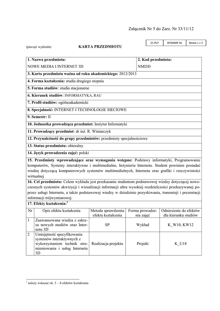 Załącznik Nr 5 do Zarz. Nr 33/11/12 Z1-PU7 (pieczęć wydziału) WYDANIE N1 Strona 1 z 3 KARTA PRZEDMIOTU 1. Nazwa przedmiotu: 2. Kod przedmiotu: NOWE MEDIA I INTERNET 3D NMI3D 3. Karta przedmiotu ważna od roku akademickiego: 2012/2013 4. Forma kształcenia: studia drugiego stopnia 5. Forma studiów: studia stacjonarne 6. Kierunek studiów: INFORMATYKA, RAU 7. Profil studiów: ogólnoakademicki 8. Specjalność: INTERNET I TECHNOLOGIE SIECIOWE 9. Semestr: II 10. Jednostka prowadząca przedmiot: Instytut Informatyki 11. Prowadzący przedmiot: dr inż. R. Winiarczyk 12. Przynależność do grupy przedmiotów: przedmioty specjalnościowe 13. Status przedmiotu: obieralny 14. Język prowadzenia zajęć: polski 15. Przedmioty wprowadzające oraz wymagania wstępne: Podstawy informatyki, Programowanie komputerów, Systemy interaktywne i multimedialne, Inżynieria Internetu. Student powinien posiadać wiedzę dotyczącą komputerowych systemów multimedialnych, Internetu oraz grafiki i rzeczywistości wirtualnej 16. Cel przedmiotu: Celem wykładu jest przekazanie studentom podstawowej wiedzy dotyczącej nowoczesnych systemów akwizycji i wizualizacji informacji ultra wysokiej rozdzielczości przekazywanej poprzez usługi Internetu, a także podstawowej wiedzy w dziedzinie pozyskiwania, transmisji i prezentacji informacji trójwymiarowej. 17. Efekty kształcenia:1 Nr 1 2 1 Opis efektu kształcenia Metoda sprawdzenia efektu kształcenia Zaawansowana wiedza z zakresu nowych mediów oraz InterSP netu 3D Umiejętność specyfikowania systemów interaktywnych z wykorzystaniem technik stru- Realizacja projektu mieniowania i usług Internetu 3D należy wskazać ok. 5 – 8 efektów kształcenia Forma prowadzenia zajęć Odniesienie do efektów dla kierunku studiów Wykład K_W10, KW12 Projekt K_U18 3 4 Umiejętność oceny i doboru elementów składowych nietypowego systemu interaktywne- Realizacja projektu go z wykorzystaniem nowych mediów Umiejętność korzystania z narzędzi do oceny efektywności Realizacja projektu złożonych projektów. Projekt K_U19 Projekt K_U20 18. Formy zajęć dydaktycznych i ich wymiar (liczba godzin) W. 30 Ćw. - L. - P. 30 Sem. - 19. Treści kształcenia: Treść wykładów: Nowe media, rozumiane jako zbiór technik i form przekazu, oprócz przekazu treści o wysokich rozdzielczościach lub o wektorowej reprezentacji przestrzennej, pozwalają na ich łączne wykorzystanie. Może to być zastosowane do zwiększania realności tworzonych systemów wirtualnej rzeczywistości lub wprowadzania do nich nowych funkcjonalności. Łączenie różnych form przekazu pozwala na realizacje zaawansowanych, interaktywnych aplikacji multimedialnych Do technologii reprezentatywnych dla nowych mediów można zaliczyć miedzy innymi: strumieniowanie treści w wysokich rozdzielczościach oraz dystrybucje treści 3D (w formie strumieni 3D, jak i obiektów 3D), która stanowi bazę dla Internetu 3D. W ramach wykładów zostaną omówione podstawowe zagadnienia dotyczące technologii strumieniowego przesyłu informacji wysokiej rozdzielczości, usług medialnych oraz Internetu 3D. Wykłady rozpoczną się od syntetycznego omówienia podstaw systemów multimedialnych tak, a by w następnej kolejności przedstawić przegląd technik i technologii związanych z akwizycja, reprezentacja i wizualizacja treści xK (w wysokich rozdzielczościach) oraz 3D. Scharakteryzowane zostaną reprezentatywne usługi i aplikacje dla przekazu tego typu treści oraz możliwość wykorzystania ich w połączeniu z technologiami sieciowymi. Następnie omówione zostaną zagadnienia związane z Internetem 3D: podstawowe pojęcia, zagadnienia i perspektywy rozwoju. Przedstawione i omówione istotne własności i funkcje nowych mediów i usług Internetu 3D posłużą do dyskusji nad projektem rozproszonej platformy do interaktywnych wizualizacji 3D. Poszczególne elementy platformy oraz propozycja jej funkcjonalności zostaną omówione w kontekście zastosowania do nowo rozwijanej gałęzi jaką jest kreatywny przemysł (ang. creative industries), rozumiany jako połączenie działalności technicznej, artystycznej i użytkowej w jednym przedsięwzięciu gospodarczym. W odniesieniu do przedsiębiorstw tradycyjnych dodana wartość ma wymiar niematerialny i odnosi się głównie do wiedzy, umiejętności, i pomysłowości - czyli kreatywności. Tematyka projektu: W ramach zadań projektowych zadaniem studentów będzie opracowanie specyfikacji funkcjonalnej oraz zaproponowanie konfiguracji rozproszonego muzeum wirtualnego, rozbudowanego o możliwość odbioru strumieni multimedialnych i wykorzystania usług konwersacyjnych. Korzystając z takiej możliwości użytkownik oprócz wirtualnej, tematycznej przestrzeni, zrealizowanej z wykorzystaniem interaktywnego dostarczania treści (na bazie sieci świadomej treści CAN) będzie mógł na przykład odtwarzać strumienie audio z komentarzem do oglądanych scen lub odtwarzać strumienie wideo (także 3D) wzbogacające prezentowane ekspozycje. 20. Egzamin: nie 21. Literatura podstawowa: 1. G. Tselentis, J.Dominique et al.Towards the Future Internet, A European Research Perspective, IOS Press BV, ISBN 978-1-60750-007-0, 2009 2. M. Chau, Evolution of New Media Technologies, Booksurge Lic., 2008 22. Literatura uzupełniająca: 1. ITU FG-FN OD-72, Draft Deliverable on ”Future Networks: Design Goals and Promising Technologies”, Rev.1, Pazdziernik 2010 2. Zahariadis T., Daras P., Laso-Ballesteros I.: Towards Future 3D Media Internet, NEM Summit 2008, St. Malo, 13-15 Pazdziernik 2008 3. Babiarz J., Chan K., Baker F.: RFC 4594 - Configuration Guidelines for DiffServ Service Classes, August 2006 4. ITU-T G.1010 - Series G: Transmission Systems And Media, Digital Systems And Networks. Quality of service and performance. End-user multimedia QoS categories, November 2001 5. Digital Cinema System Specification Version 1.2, Digital Cinema Initiatives, March 2008 6. 6. Skabek K.,