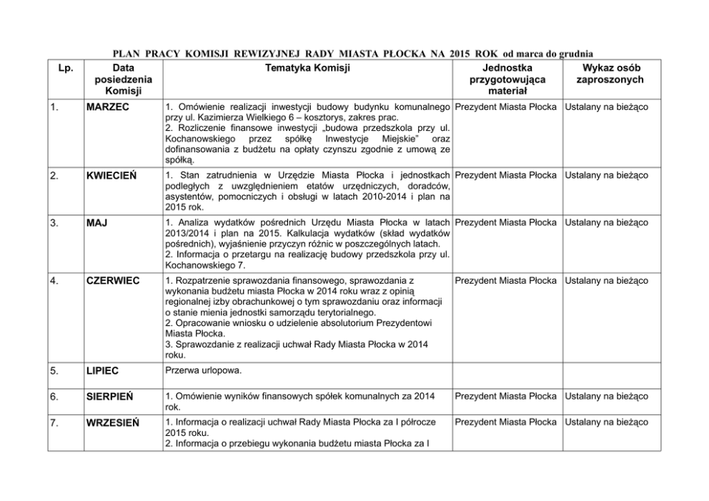Lp. PLAN PRACY KOMISJI REWIZYJNEJ RADY MIASTA PŁOCKA NA 2015 ROK od marca do grudnia Data Tematyka Komisji Jednostka Wykaz osób posiedzenia przygotowująca zaproszonych Komisji materiał 1. MARZEC 1. Omówienie realizacji inwestycji budowy budynku komunalnego Prezydent Miasta Płocka Ustalany na bieżąco przy ul. Kazimierza Wielkiego 6 – kosztorys, zakres prac. 2. Rozliczenie finansowe inwestycji „budowa przedszkola przy ul. Kochanowskiego przez spółkę Inwestycje Miejskie” oraz dofinansowania z budżetu na opłaty czynszu zgodnie z umową ze spółką. 2. KWIECIEŃ 1. Stan zatrudnienia w Urzędzie Miasta Płocka i jednostkach Prezydent Miasta Płocka Ustalany na bieżąco podległych z uwzględnieniem etatów urzędniczych, doradców, asystentów, pomocniczych i obsługi w latach 2010-2014 i plan na 2015 rok. 3. MAJ 1. Analiza wydatków pośrednich Urzędu Miasta Płocka w latach Prezydent Miasta Płocka Ustalany na bieżąco 2013/2014 i plan na 2015. Kalkulacja wydatków (skład wydatków pośrednich), wyjaśnienie przyczyn różnic w poszczególnych latach. 2. Informacja o przetargu na realizację budowy przedszkola przy ul. Kochanowskiego 7. 4. CZERWIEC 1. Rozpatrzenie sprawozdania finansowego, sprawozdania z wykonania budżetu miasta Płocka w 2014 roku wraz z opinią regionalnej izby obrachunkowej o tym sprawozdaniu oraz informacji o stanie mienia jednostki samorządu terytorialnego. 2. Opracowanie wniosku o udzielenie absolutorium Prezydentowi Miasta Płocka. 3. Sprawozdanie z realizacji uchwał Rady Miasta Płocka w 2014 roku. 5. LIPIEC Przerwa urlopowa. 6. SIERPIEŃ 1. Omówienie wyników finansowych spółek komunalnych za 2014 rok. Prezydent Miasta Płocka Ustalany na bieżąco 7. WRZESIEŃ 1. Informacja o realizacji uchwał Rady Miasta Płocka za I półrocze 2015 roku. 2. Informacja o przebiegu wykonania budżetu miasta Płocka za I Prezydent Miasta Płocka Ustalany na bieżąco Prezydent Miasta Płocka Ustalany na bieżąco Lp. Data posiedzenia Komisji Tematyka Komisji Jednostka przygotowująca materiał Wykaz osób zaproszonych półrocze 2015 roku. 3. Informacja o kształtowaniu się wieloletniej prognozy finansowej. 4. Omówienie wyników finansowych spółek komunalnych za 2014 rok. 8. PAŹDZIERNIK 1. Polityka mieszkaniowa miasta Płocka. Ocena funkcjonowania zasad przydziału mieszkań komunalnych w latach 2010-2014. Prezydent Miasta Płocka Ustalany na bieżąco 9. LISTOPAD 1. Kontrola wybranego przetargu. Prezydent Miasta Płocka Ustalany na bieżąco 10. GRUDZIEŃ 1. Ocena stanu zaawansowania aktualnie prowadzonych inwestycji strategicznych. Prezydent Miasta Płocka Ustalany na bieżąco Plan pracy Komisja Rewizyjna przyjęła na posiedzeniu w dniu 9 lutego 2015 r. Przewodniczący Komisji Rewizyjnej Rady Miasta Płocka /-/ Artur Kras