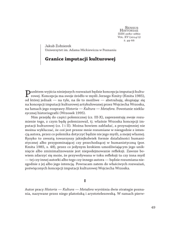SENSUS HISTORIAE ISSN 2082–0860 Vol. XV (2014/2) s. 49-66 Jakub Żołnierek Uniwersytet im. Adama Mickiewicza w Poznaniu Granice imputacji kulturowej P unktem wyjścia niniejszych rozważań będzie koncepcja imputacji kulturowej. Koncepcja ma swoje źródło w myśli Jerzego Kmity (Kmita 1985), od której jednak — na tyle, na ile to możliwe — abstrahuję, skupiając się na koncepcji imputacji kulturowej artykułowanej przez Wojciecha Wrzoska, na łamach jego rozprawy Historia — Kultura — Metafora. Powstanie nieklasycznej historiografii (Wrzosek 1995). Nim przejdę do części polemicznej (cz. III-X), zaprezentuję swoje rozumienie tego, z czym będę polemizował, tj. właśnie Wrzoska koncepcji imputacji kulturowej (cz. I i II). Można bowiem zakładać, a przynajmniej nie można wykluczać, że coś jest przeze mnie rozumiane w niezgodzie z intencją autora, przez co polemika dotyczyć będzie nie jego myśli, a mojej własnej. Ryzyko to zresztą towarzyszy jakiejkolwiek formie działalności humanistycznej albo przypominającej czy przechodzącej w humanistyczną (por. Kmita 1985, s. 48), przez co jedynym krokiem umożliwiającym jego uniknięcie albo zminimalizowanie jest niepodejmowanie refleksji. Zawsze bowiem zdarzyć się może, że przywoływana w toku refleksji ta czy inna myśl — tej czy innej autorki albo tego czy innego autora — będzie rozumiana niezgodnie z jej albo jego intencją. Powracam zatem do właściwych rozważań, poświęconych koncepcji imputacji kulturowej Wojciecha Wrzoska. I Autor pracy Historia — Kultura — Metafora wyróżnia dwie strategie poznania, nazywane przez niego platońską i arystotelesowską. W ramach pierw- 49 Jakub Żołnierek szej przyjmuje się model zbieżny do pewnego stopnia z pozytywistycznym, tzn. przyjmuje się przekonania o: [...] przezroczystości świata i bezpośredniej dostępności prawdy, przyjmuje podmiotowo-przedmiotową taktykę poznawania, z natury swej rzekomo nieuchronnie prowadzącą do prawdy. Taktyka ta ujawnia naiwno-realistyczne podejście do świata i jego pojmowania. (Wrzosek 1995, s. 7) W ramach przeciwstawianej jej, przynajmniej do pewnego stopnia, strategii nazywanej arystotelesowską przyjmuje się, że „świat przysłonięty jest kulturą, bądź że istnieje tylko w niej samej. (Wrzosek 1995, s. 7) Otóż Wrzosek opowiada się, na łamach wspomnianej pracy, za drugą ze strategii (por. Wrzosek 1995, s. 13). Nie definiuje on wszelako, co rozumie przez pojęcie kultury (a rozumieć można całkiem wiele i niekiedy całkiem rozbieżnie). Do kwestii tej wrócę, wspomniane tu niedookreślenie wykorzystując — w pewnym przynajmniej sensie — przeciwko autorowi. II Działalność etnologa albo etnografa, uważa Wrzosek, może być ufundowana na strategii platońskiej albo na strategii arystotelesowskiej. W pierwszym przypadku prowadzący dociekania na temat innej kultury będzie absolutyzował punkt widzenia swój, jak również — za sprawą tego, że swój — nauki, którą reprezentuje, metod, których używa, pojęć, które stosuje etc. Będzie on postępował jak czynił Herodot w swoim dziele, albo — parafrazując tu krytyczną interpretację Anny Pałubickiej — jak czynił to Frazer w Złotej gałęzi (por. Pałubicka 1984, rozdz. I i II). W drugim natomiast wypadku, uważa Wrzosek, badacz będzie zawieszał podmiotowo-przedmiotową strategię poznania, uznając raczej, iż prowadzi poznanie podmiotowo-podmiotowe. Nie będzie zatem absolutyzował punktu widzenia własnego (własnej nauki, metod, etc.), będzie natomiast, działał mając świadomość — ściśle przekładającą się na jego postępowanie i rezultaty tego postępowania — że bada określoną kulturę, samemu będąc przedstawicielem określonej kultury. Dochodzi zatem do poznania, które nazwałem (trochę być może wbrew intencjom Wrzoska) podmiotowo-podmiotowym, tzn. dochodzi do swoistego dialogu kultur albo monologu kultury na temat innej, powstałego na podstawie poprzedzającego go dialogu kultur. Wrzosek uważa, że sytuacja epistemologiczna historyka podobna jest do sytuacji etnologa czy etnografa, pod warunkiem wszelako, że: [...] bada on [społeczność — J.Ż.] odległą czasowo od naszej społeczność [...] G d y b a d a n i a h i s t o r y c z n e d o t y c z ą t e r a ź n i e j s z o ści, a więc okresu bliskiego badaczowi, problem ten 50 Granice imputacji kulturowej z d a j e s i ę z n i k a ć . Kwestia sprowadza się do ujęcia: kultura bada siebie samą. (Wrzosek 1995, s. , wyróżnienie — J.Ż.) Co dzieje się, kiedy historyk bada społeczność odległą czasowo od jego własnej, badającej tę odległą? Otóż badacz „który rozmyśla nad jakimś zjawiskiem, wnosi swym myśleniem potrzebę dostrzegania zmian w czasie i docieka genezy” (Wrzosek 1995, s. 18). Historyk, uważa Wrzosek, imputuje zatem kulturze badanej metafory dominujące — metaforę rozwoju i metaforę genezy — które niekoniecznie są obecne w tej kulturze badanej. Jednocześnie, imputuje on badanej kulturze temporalność oraz spacjalność również charakterystyczne dla kultury badającej, niekoniecznie zaś dla kultury badanej. Ponadto imputuje on kulturze badanej kategorie klasycznego rachunku logicznego (klasycznego dla naszej kultury) stanowiące fundament języka, jakim kultura badająca się posługuje. Innymi słowy, w toku refleksji historyka nad odległą mu przeszłością następuje: [...] kategoryzowanie świata badanego z punktu widzenia kryteriów kultury badającej. Tym samym imputowanie mu takiego ładu — jak powiedzielibyśmy w stylizacji podmiotowo-przedmiotowej — której świat badany może nie posiadać. Innymi słowy: zachodziłoby porównywanie świata nieznanego do świata znanego. „ T ł u m a c z e n i e ” k u l t u r y b a d a n e j n a j ę z y k k u l t u r y b a d a j ą c e j . (Wrzosek 1995, s. 20, wyróżnienie — J.Ż.) III Celem niniejszej polemiki nie jest 