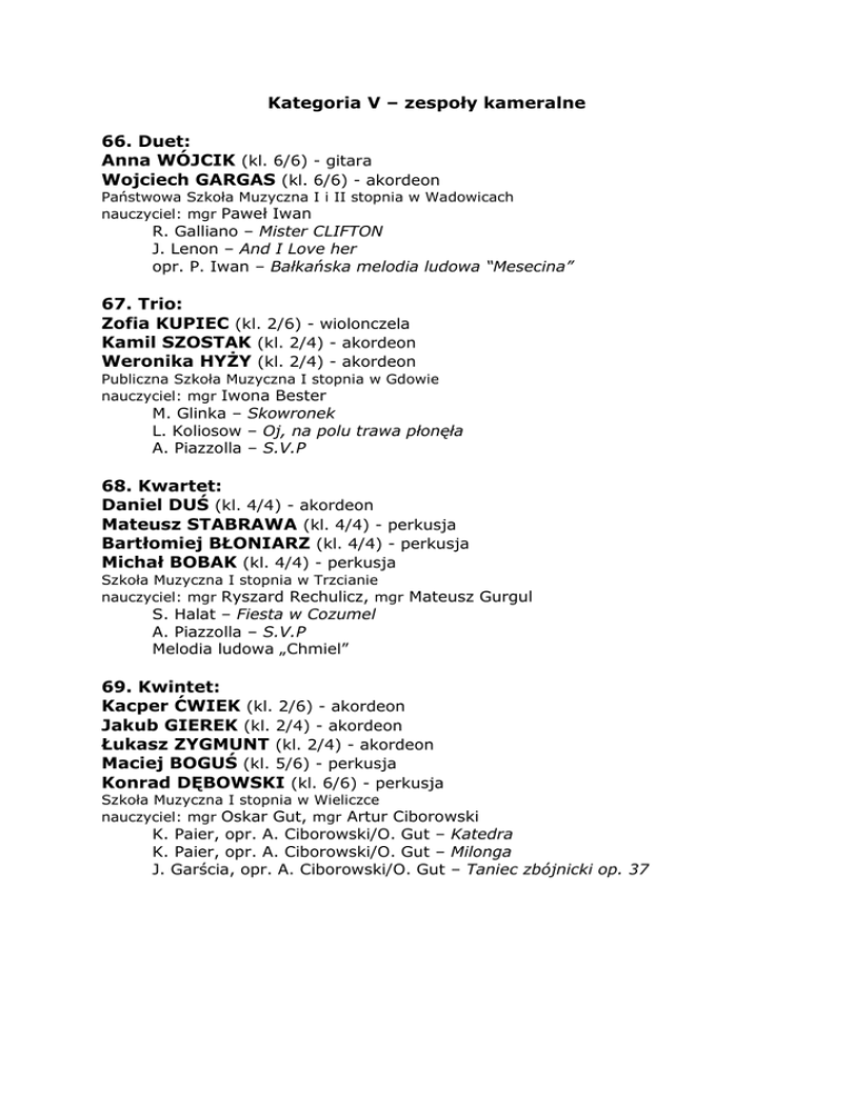 Kategoria V – zespoły kameralne 66. Duet: 67. Trio: 68. Kwartet