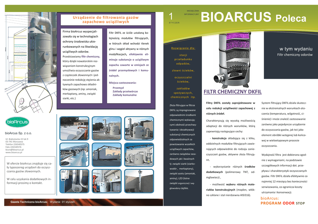 Urządzenie do filtrowania gazów zapachowo uciążliwych Firma bioArcus wyspecjalizowała się w technologiach ochrony środowiska ukierunkowanych na likwidację uciążliwych odorów. Filtr DKFIL ze ściśle ustaloną ko- 1 0 MIESIĘCZNIK INFORMACYJNY STYCZEŃ lejnością modułów filtrujących, w których skład wchodzi tlenek glinu i węgiel aktywny w różnych Rozwiązanie dla : modyfikacjach, efektywnie eli- wiązaniom konstrukcyjnym zapachu zawarte w emisjach ze stacji przeładunku odpadów, umożliwia oczyszczanie gazów źródeł przemysłowych i komu- zlewni ścieków, z cząsteczek złowonnych i jed- nalnych. Przedstawiamy filtr chemiczny, który dzięki nowatorskim roz- nocześnie redukcję stężenia aktywnych zapachowo składników gazowych (np: amoniak, merkaptany, aminy, związki siarki, etc.) minuje substancje o uciążliwym Miejsca zastosowania: Przemysł Zakłady przetwórcze Zakłady komunalne zakładów spożywczych, chemicznych itp. Filtr chemiczny odorów FILTR CHEMICZNY DKFIL Filtry DKFIL zostały zaprojektowane w System filtrujący DKFIL działa skutecz- celu redukcji uciążliwości zapachowej z nie w ekstremalnych warunkach oto- odpowiednimi środkami różnych źródeł. czenia (temperatura, wilgotność, ci- chemicznymi wykazują- Charakteryzują się wysoką możliwością cymi zdolność przechwy- adaptacji do różnych warunków, którą DKFiL są impregnowane tywania i dezaktywacji Ul. Białostocka 22 lok 9 03-741 Warszawa Telefon 226540575 Faks 226540576 [email protected] www.bioarcus.pl w tym wydaniu oczyszczalni ścieków, Złoża filtrujące w filtrze bioArcus Sp. z o.o. BIOARCUS Poleca zapewniają następujące cechy: substancji chemicznych śnienie) i może znaleźć zastosowanie zarówno jako pojedyncze urządzenie do oczyszczania gazów, jak też jako element obróbki wstępnej lub końco- - konstrukcja składająca się z kliku, odpowiedzialnych za wej w wieloetapowym procesie powstawanie wszelkich oddzielnych modułów filtrujących zawie- uciążliwych zapachów, rających odpowiednie do rodzaju zanie- zarówno związków zasa- czyszczeń gazów, aktywne złoża filtrują- Wydajność filtra jest dobierana zgod- dowych jak i kwaśnych ce, nie z wymaganiami, na podstawie oczyszczania. W ofercie bioArcus znajduje się cały typoszereg urządzeń do oczyszczania gazów złowonnych. tj: związki siarki (siarko- związki azotu (amoniak, dodatkowych (polimerowy TNT, od- pływu i charakterystyki oczyszczanych W celu uzyskania dodatkowych informacji prosimy o kontakt. aminy), LZO (lotne mgławiacz) , gazów. Filtr DKFiL działa efektywnie co wodór , merkaptany), związki organiczne) i węglowodory ciężkie. - wykorzystanie różnych środków - możliwość wyboru różnych materiałów konstrukcyjnych (moplen, włókno szklane i stal nierdzewna AISI316). Gazeta Techniczna bioArcus; Wydanie 01 styczeń szczegółowych informacji dot. prze- najmniej 12 miesięcy bez konieczności serwisowania, co ogranicza koszty utrzymania i konserwacji. bioArcus: PROGRAM ODOR STOP Podstawowe zalety chemicznego filtra DKFIL do redukcji zapachów Rozwiązania, Technologie dla ochrony przed Podstawowe informacje natychmiastowa eliminacja uciążliwości odorowej, wymaga stałego dopływu gazów, może pracować tylko wtedy kiedy jest to potrzebne, FILTR CHEMICZNY DKFIL nie stężenia zanieczyszczeń czy duże wahania stężeń np. siarkowodoru nie wpływają na sprawność urządzenia, sprawność oczyszczania nie jest zależna, od temperatury otoczenia (pracują jednakowo wydajnie zimą jak i latem), urządzenie może być łatwo przeniesione w inne wybrane miejsca, szybki montaż (nie wymaga żadnych zezwoleń), zajmują bardzo małą powierzchnię – urządzenia kompaktowe, niezawodny bezpłatne serwis, doradztwo techniczne, DKFIL efektywnie neutralizu- złoża, - oczyszczalnie ścieków komunalne i przemysłowe; je zarówno związki zasado- wiedniej we jak i kwaśne oraz sku- nieczne jest określenie na- - przepompownie ścieków; tecznie działa w warunkach stępujących - gospodarka odpadami i recykling; krytycznych (wysoka tempe- oczyszczanych gazów: ratura, zmienny skład oczysz- - przepływ, czanych gazów, wilgotność - analiza chemiczna, itp.). - wilgotność, - przemysł spożywczy, przetwórstwo spożywcze; - przemysł paszowy; odpo- wilgotności, ko- parametrów - temperatura, są dobierane in- DZIAŁANIE dywidualnie w za- W filtrze DKFIL proces fil- leżności od specy- trowania fiki oczyszczanych oczyszczania NOWE MOŻLIWOŚCI , WALKI Z ODORAMI - wymagana efektywność oczyszczania. powietrza to łańcuch fizy- gazów. ko - chemicznych reakcji. Odpowiednio dobrane mate- Zastosowano tu kilka ro- riały filtrujące umożliwiają szych informacji, możemy dzajów sub- działanie urządzenia z bardzo zaproponować wypełnienie stancji filtrujących, które wysoką wydajnością przez zmniejszają stężenia zanie- okres co najmniej 12 miesię- czyszczeń cy, bez żadnych czynności i aktywnych związków DODATKOWE INFORMACJE Urządzenie można zaprojektować do pracy w każdych warunkach, można jego pracę skojarzyć z innymi urządzeniami np. ze skruberem, czasami stosuje się je jako ostatni stopień oczyszczania np. po biofiltrze Producent: Labiotest / Włochy bioArcus Sp. z o.o. jest Wyłącznym Dystrybutorem w/w urządzeń w Polsce ZłoZłoża filtrujące - hodowla zwierząt i zachowania chemicznych złowonnych serwisowych. poprzez ich neutralizację W celu poprawnego dobo- i utlenianie. ru filtra, typu i wielkości Pytania, odpowiedzi i porady W przypadku braku powyżNasza sortownia ma problem z odorami, okoliczni mieszkańcy skarżą się. Jakie działania należy podjąć w kierunku likwidacji tego problemu? filtrujące na podstawie naszego doświadczenia i wiedzy, a także badań literatu- 1. 1. Prosimy o Kontakt z nami 2. 2. Bezpłatnie wykonamy audyt i zaprojektujemy rozwiązanie, 3. rowych lub wykonanie od- 4. powiednich analiz. 5. 3. Zains
