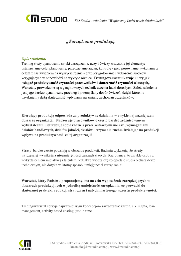 „Zarządzanie produkcją Opis szkolenia: Trening służy opanowaniu sztuki zarządzania, uczy i ćwiczy wszystkie jej elementy: ustanawianie celu, planowanie, przydzielanie zadań, kontrolę - jako porównanie wykonania z celem z nastawieniem na wykrycie różnic - oraz przygotowanie i wdrożenie środków korygujących w odpowiedzi na wykryte różnice. Trening/warsztat ukazuje i uczy jak osiągać produktywność czynności pracowników i skuteczność czynności własnych,. Warsztaty prowadzone są wg najnowszych technik uczenia ludzi dorosłych. Zaletą szkolenia jest jego bardzo dynamiczny przebieg i przemyślany dobór ćwiczeń, dzięki któremu uzyskujemy dużą skuteczność wpływania na zmiany zachowań uczestników. Kierujący produkcją odpowiada za produktywne działania w zwykle najważniejszym obszarze organizacji. Nadzoruje pracowników o często bardzo zróżnicowanym wykształceniu. Potrzebuje sobie radzić z przeciwstawnymi nie raz , wymaganiami działów handlowych, działów jakości, działów utrzymania ruchu. Działając na produkcji wpływa na produktywność całej organizacji! Straty bardzo często powstają w obszarze produkcji. Badania wykazują, że straty najczęściej wynikają z nieumiejętności zarządzających. Kierownicy, to zwykle osoby z wykształceniem inicjatywą i talentem, jednakże wiedza często oparta o studia o charakterze technicznym, nie dotyka w istotny sposób umiejętności zarządzania! Warsztat, który Państwu proponujemy, ma na celu wyposażenie zarządzających w obszarach produkcyjnych w jednolitą umiejętność zarządzania, co prowadzi do skutecznej praktyki, redukcji strat czasu i natychmiastowego wzrostu produktywności. Trening/warsztat sprzyja najważniejszym koncepcjom zarządzania: kaizen, six sigma, lean management, activity based costing, just in time. Uzyskane umiejętności: Zarządzający produkcją posługuje się strukturą zarządzania cel-plan-przydzielanie zadań kontrola Zarządzający produkcją analizuje proces pracy i rozkładać go na poszczególne czynności pracy. Rozpoznaje straty czasu i wykrywa ich przyczyny. Planuje i wdraża akcje korygujące dla eliminowania przyczyn strat. Zarządzający produkcją posługuje się celami SMART. Rozkłada cele długoterminowe na cele krótkoterminowe. Umie tworzyć cele dla poszczególnych czynności pracy. Zarządzający produkcją efektywnie komunikuje się zarówno z pracownikiem, jak i zarządem. Zarządzający produkcją rozumie przyczyny nieporozumień, nie unika trudnych tematów, jest asertywny w komunikacji – umie komunikować nie wzbudzając agresji i jednocześnie osiągając założone cele. Zarządzający produkcją porównuje wykonanie z celem. Umie rozpoznać przyczynę ( braki w motywacji lub umiejętności) odpowiedzialną za różnicę. Zna sposoby motywowania. Zarządzający produkcją asertywnie konfrontuje się z pracownikami niewykonującymi zadań. Potrafi przeprowadzić rozmowy w odpowiedzi na różne trudne sytuacje. Program szkolenia: 1. Czym jest zarządzanie produkcją Kroki zarządzania są powiązane! Czym jest produktywność? Specyfika zarządzania produkcją Metody wykrywania strat czasu 2. Zarządzanie jako system – gwarancja wyeliminowania strat czasu, praca ze zmniejszonym wysiłkiem i lepszymi efektami Odkrycie porządku jako głównego warunku sukcesu zespołu – efektywnego wykorzystania czasu i wysiłku członków zespołu. Odkrycie fenomenu efektywności zespołu przez eliminacje strat czasu. Straty jawne i ukryte. Metody organizacyjne na produkcji: 5s Toyota way SMED Poka yoke 3. Tworzenie norm – głównego narzędzia zarządzania produkcją Analiza procesu pracy Wyodrębnianie czynności Pomiary Rozkładanie celów głównych i długoterminowych na cele instrumentalne i dochodzenie aż do celów czynności W jaki sposób cel motywuje? 4. Przydzielanie zadań – komunikacja Przydzielanie zadań jest komunikacją! Efektywna/asertywna komunikacja: Budowanie relacji z pracownikami Wywieranie wpływu i perswazja 5. Kontrola porównanie wykonania z celem, wykrycie różnicy i znalezienie jej przyczyny Przyczyny odpowiedzialne za różnice miedzy wykonaniem a celem. Braki w umiejętności lub w motywacji jako przyczyny różnic. Co to jest motywacja? Kara i nagroda w motywacji. Style poznawcze, co motywuje kogo? 6. Działania korygujące w reakcji na różnicę Konfrontacja – procedura egzekwowania w sytuacji niewykonania przez pracowników zleconych zadań Różne postawy podwładnych, zachowania, emocje. Jak asertywnie radzić sobie z nimi? Metodologia: Podczas szkolenia wykorzystujemy następujące metody szkoleniowe: mini wykłady w Powerpoint dyskusja, praca w parach, praca w grupach zadania indywidualne odgrywanie ról nagrania video i analiza uzyskanego materiału Informacje organizacyjne: Ilość godzin szkolenia: 12 godzin / 2dni Godziny szkolenia: 9:15-15:15 Miejsce szkolenia: Łódź, ul Piotrkowska 125 – KM Studio - szkolenia