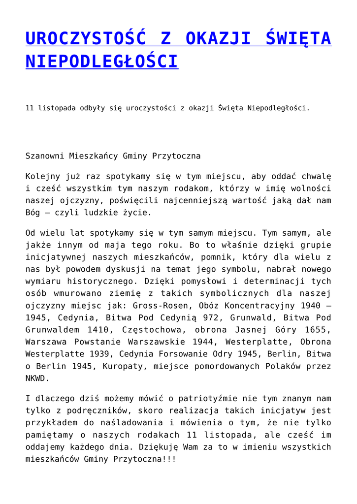 UROCZYSTOŚĆ Z OKAZJI ŚWIĘTA NIEPODLEGŁOŚCI 11 listopada odbyły się uroczystości z okazji Święta Niepodległości. Szanowni Mieszkańcy Gminy Przytoczna Kolejny już raz spotykamy się w tym miejscu, aby oddać chwalę i cześć wszystkim tym naszym rodakom, którzy w imię wolności naszej ojczyzny, poświęcili najcenniejszą wartość jaką dał nam Bóg – czyli ludzkie życie. Od wielu lat spotykamy się w tym samym miejscu. Tym samym, ale jakże innym od maja tego roku. Bo to właśnie dzięki grupie inicjatywnej naszych mieszkańców, pomnik, który dla wielu z nas był powodem dyskusji na temat jego symbolu, nabrał nowego wymiaru historycznego. Dzięki pomysłowi i determinacji tych osób wmurowano ziemię z takich symbolicznych dla naszej ojczyzny miejsc jak: Gross-Rosen, Obóz Koncentracyjny 1940 – 1945, Cedynia, Bitwa Pod Cedynią 972, Grunwald, Bitwa Pod Grunwaldem 1410, Częstochowa, obrona Jasnej Góry 1655, Warszawa Powstanie Warszawskie 1944, Westerplatte, Obrona Westerplatte 1939, Cedynia Forsowanie Odry 1945, Berlin, Bitwa o Berlin 1945, Kuropaty, miejsce pomordowanych Polaków przez NKWD. I dlaczego dziś możemy mówić o patriotyźmie nie tym znanym nam tylko z podręczników, skoro realizacja takich inicjatyw jest przykładem do naśladowania i mówienia o tym, że nie tylko pamiętamy o naszych rodakach 11 listopada, ale cześć im oddajemy każdego dnia. Dziękuję Wam za to w imieniu wszystkich mieszkańców Gminy Przytoczna!!! Dziękuję wszystkim nauczycielom i rodzicom za wychowanie młodego pokolenia w duchu patriotyzmu. Bo jak tego nie zauważyć skoro w czasach komputeryzacji, informatyzacji i pogoni za dobrobytem, na apelu klas I usłyszeć można głośny i płynący z serca, znany nam tu wszystkim wiersz: Kto Ty jesteś? … a za kilka dni trzylatki z przedszkola, spacerujące ulicami naszej miejscowości na czele z powiewającą biało-czerwoną flagą uzupełniają wiersz o pytanie: Czy ją kochasz? Kocham szczerze. A w co wierzysz? W Polskę wierzę!!! Tą wiarę i miłość do ukochanej ojczyzny widać na ulicach naszych miast przez tak łatwy symbol, jak wywieszenie flagi narodowej na naszych budynkach. Tą tradycją zarażajmy naszych sąsiadów, ponieważ jeszcze dwa pokolenia temu, wielu Polaków pragnęło zobaczyć, dotknąć białoczerwone barwy i wtulić się w nie, jak w kogoś na kogo z utęsknieniem czeka się przez całe życie. Nie rzucim ziemi skąd nasz ród! Nie damy pogrześć mowy. Polski my naród, polski lud, Królewski szczep Piastowy. Do krwi ostatniej kropli z żył Bronić będziemy ducha, Aż się rozpadnie w proch i w pył Krzyżacka zawierucha. Nie damy miana Polski zgnieść Nie pójdziem żywo w trumnę W Ojczyzny imię, na jej cześć Podnosi czoła dumne. Odzyska ziemi dziadów wnuk! Tak nam dopomóż Bóg! To między innymi te słowa dawały im skrzydeł do walki, która trwała 123 lata. Wierzmy w nasz kraj i piszmy nową historię naszej ojczyzny. Ojczyzny wolnej, wyzwolonej i mającej szansę na dynamiczny rozwój. Rozwój, którego podobnie jak kiedyś, nie sposób zrealizować w jeden rok, i który podobnie jak wtedy, kosztuje wiele wyzwań, wyrzeczeń a przede wszystkim jedności narodowej. Wójt Gminy /-/ Zachęcamy poniżej. Przytoczna Bartłomiej Kucharyk do odsłuchania przemówienia poprzez pobranie pliku http://przytoczna.pl/wp-content/uploads/2012/11/bartek_11_list opada.mp3 img_0961 img_0964 img_0965 img_0988 img_0993 img_0999 img_1005 img_1006 img_1010 img_1022 img_1034 img_1038 img_1043 img_1044 img_1045 img_1050 img_1065 img_1068 img_1069 img_1076 img_1083 img_1084 img_1085 img_1086 img_1087 img_1088 img_1090 img_1094 img_1095 img_1096 img_1097 img_1101 img_1102 img_1107 img_1108 img_1109 img_1110 img_1121 img_1122 img_1127 img_1130 img_1134 img_1139 img_1141 img_1144 img_1145 img_1148 img_1149 img_1151 img_1152 img_1155 img_1156 img_1162 img_1175 foto: Piotr Jeske