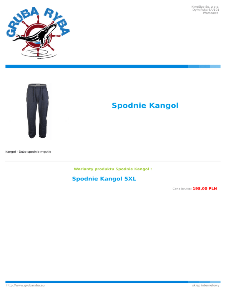 KingSize Sp. z o.o. Dymińska 6A/101 Warszawa Spodnie Kangol Kangol - Duże spodnie męskie Warianty produktu Spodnie Kangol : Spodnie Kangol 5XL Cena brutto: http://www.grubaryba.eu 198,00 PLN sklep internetowy