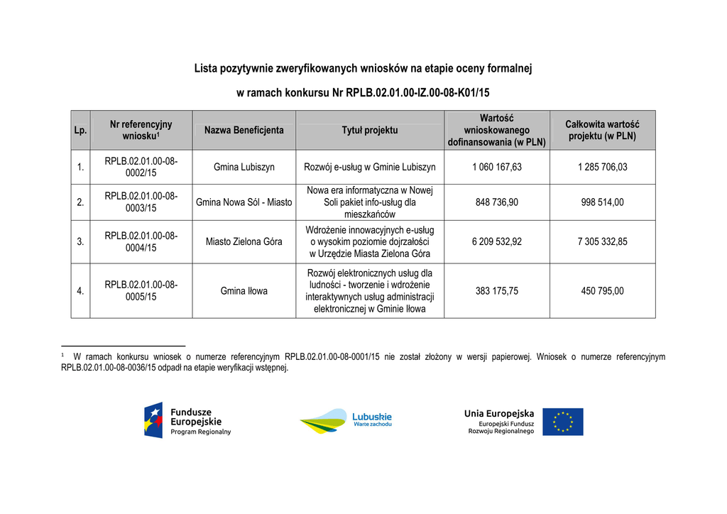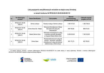 Lista pozytywnie zweryfikowanych wniosków na etapie oceny formalnej w ramach konkursu Nr RPLB.02.01.00-IZ.00-08-K01/15 1 Lp. Nr referencyjny wniosku1 Nazwa Beneficjenta Tytuł projektu Wartość wnioskowanego dofinansowania (w PLN) Całkowita wartość projektu (w PLN) 1. RPLB.02.01.00-080002/15 Gmina Lubiszyn Rozwój e-usług w Gminie Lubiszyn 1 060 167,63 1 285 706,03 2. RPLB.02.01.00-080003/15 Gmina Nowa Sól - Miasto Nowa era informatyczna w Nowej Soli pakiet info-usług dla mieszkańców 848 736,90 998 514,00 3. RPLB.02.01.00-080004/15 Miasto Zielona Góra Wdrożenie innowacyjnych e-usług o wysokim poziomie dojrzałości w Urzędzie Miasta Zielona Góra 6 209 532,92 7 305 332,85 4. RPLB.02.01.00-080005/15 Gmina Iłowa Rozwój elektronicznych usług dla ludności - tworzenie i wdrożenie interaktywnych usług administracji elektronicznej w Gminie Iłowa 383 175,75 450 795,00 W ramach konkursu wniosek o numerze referencyjnym RPLB.02.01.00-08-0001/15 nie został złożony w wersji papierowej. Wniosek o numerze referencyjnym RPLB.02.01.00-08-0036/15 odpadł na etapie weryfikacji wstępnej. Lp. 2 Nr referencyjny wniosku Nazwa Beneficjenta 5. RPLB.02.01.00-080006/15 Gmina Sulechów 6. RPLB.02.01.00-080007/15 Powiat Zielonogórski2 7. RPLB.02.01.00-080008/15 Gmina Szprotawa 8. RPLB.02.01.00-080009/15 Zakład Wodociągów i Kanalizacji Sp. z o. o. w Żarach 9. RPLB.02.01.00-080010/15 Gmina Czerwieńsk Tytuł projektu Rozwój technologii informacyjno - komunikacyjnych oraz e-usług i aplikacji dla mieszkańców gminy Sulechów i gminy Kargowa e-Geodezja Powiatu Zielonogórskiego Mobilny informator samorządowy zasobów oraz usług publicznych w Gminie Szprotawa Budowa systemu informacji przestrzennej (GIS) w ZWiK Sp. z o.o. w Żarach wraz z uruchomieniem e-usług dla mieszkańców Wdrożenie kompleksowego pakietu IT dla mieszkańców Gminy Czerwieńsk poprzez budowę zintegrowanego systemu informatycznego Projekt, który został pozytywnie oceniony w wyniku procedury odwoławczej. Wartość wnioskowanego dofinansowania (w PLN) 2 216 575,60 Całkowita wartość projektu (w PLN) 2 607 736,00 2 567 765,00 3 020 900,00 28 855,80 33 948,00 1 031 900,00 1 493 220,00 649 255,50 763 830,00 Lp. Nr referencyjny wniosku Nazwa Beneficjenta Tytuł projektu Wartość wnioskowanego dofinansowania (w PLN) Całkowita wartość projektu (w PLN) Budowa systemu informacji przestrzennej (GIS) oraz platformy e-usług dla Miejskiego Zakładu Gospodarki Komunalnej Sp. z o.o. w Nowej Soli 2 029 630,00 2 939 700,00 1 147 234,80 1 349 688,00 4 226 026,00 4 971 795,30 1 545 967,25 1 818 785,00 10. RPLB.02.01.00-080011/15 Miejski Zakład Gospodarki Komunalnej Sp. z o.o. w Nowej Soli 11. RPLB.02.01.00-080012/15 Stowarzyszenie Samorządowa platforma konsultacji Aktywnego Wspierania społecznych województwa Gospodarki z siedzibą we lubuskiego Wrocławiu 12. 13. RPLB.02.01.00-080013/15 Gmina Słubice Rozwój społeczeństwa informacyjnego na terenie partnerstwa: Gminy Słubice, Gminy Cybinka, Gminy Rzepin, Gminy Ośno Lubuskie oraz Gminy Górzyca RPLB.02.01.00-080014/15 Wojewódzka i Miejska Biblioteka Publiczna im. Cypriana Norwida w Zielonej Górze E-biblioteka Norwida przyjazna osobom niepełnosprawnym i wykluczonym cyfrowo Nazwa Beneficjenta Tytuł projektu Wartość wnioskowanego dofinansowania (w PLN) Całkowita wartość projektu (w PLN) Centralny Instytut Analiz Polityczno-Prawnych z siedzibą w Warszawie Kompleksowa digitalizacja zasobów posiadanych przez RDLP w Zielonej Górze oraz stworzenie interaktywnego systemu informacyjnego dotyczącego lubuskich zasobów leśnych 1 037 910,01 1 221 070,61 RPLB.02.01.00-080017/15 Sulechowskie Przedsiębiorstwo Komunalne „SuPeKom” Wdrożenie ZSI oraz elektronicznych usług dla ludności przez Sulechowskie Przedsiębiorstwo Komunalne „SuPeKom” Sp. z o.o. w Sulechowie 2 661 021,90 3 850 655,22 16. RPLB.02.01.00-080018/15 Wojewódzka i Miejska Biblioteka Publiczna im. Zbigniewa Herberta w Gorzowie Wlkp. Rozbudowa usług elektronicznych Wojewódzkiej i Miejskiej Biblioteki Publicznej im. Zbigniewa Herberta w Gorzowie Wlkp. 1 197 259,00 1 433 140,00 17. RPLB.02.01.00-080019/15 Gmina Słońsk Rozwój elektronicznych usług publicznych w Gminie Słońsk 528 581,00 624 620,00 Lp. 14. 15. Nr referencyjny wniosku RPLB.02.01.00-080015/15 Lp. 18. 19. 20. 3 Nr referencyjny wniosku Nazwa Beneficjenta Tytuł projektu Wartość wnioskowanego dofinansowania (w PLN) Całkowita wartość projektu (w PLN) RPLB.02.01.00-080020/15 Przedsiębiorstwo Wodociągów i Kanalizacji Sp. z o.o. w Gorzowie Wlkp. Budowa Systemu Informacji Przestrzennej (GIS) w Przedsiębiorstwie Wodociągów i Kanalizacji Sp. z o.o. w Gorzowie Wlkp. 1 099 900,00 1 591 620,00 Powiat Krośnieński e-Powiat Krośnieński 509 754,43 599 711,10 Gmina Świebodzin Rozwój e-usług dla mieszkańców gminy Świebodzin 875 386,69 1 029 866,70 1 375 436,00 1 990 336,80 1 138 796,00 1 339 760,00 RPLB.02.01.00-080021/15 RPLB.02.01.00-080022/15 21. RPLB.02.01.00-080023/15 Gmina Sulęcin 22. RPLB.02.01.00-080024/15 Powiat Nowosolski3 Cyfrowy krok w nowoczesne społeczeństwo Utworzenie interaktywnego systemu informacji i usług administracji elektronicznej opartego na tworzeniu i udostępnianiu zasobów cyfrowych Powiatu Nowosolskiego dla ludności Projekt, który został pozytywnie oceniony w wyniku procedury odwoławczej. Nazwa Beneficjenta Tytuł projektu Wartość wnioskowanego dofinansowania (w PLN) 23. RPLB.02.01.00-080025/15 Gmina Łagów Budowa i wdrożenie publicznego, interaktywnego systemu usług administracji samorządowej w Gminie Łagów 274 966,50 323 490,00 24. RPLB.02.01.00-080026/15 Miejskie Zakłady Komunalne Sp. z o.o. w Kostrzynie nad Odrą Wdrożenie e –usług dla MZK SP. z o.o. 843 200,00 1 220 160,00 25. RPLB.02.01.00-080027/15 Przedsiębiorstwo Usług Komunalnych USKOM Sp. z o.o. w Kożuchowie Budowa systemu e-usług dla mieszkańców w Przedsiębiorstwie Usług Komunalnych "USKOM" Sp. z o.o. 1 604 1