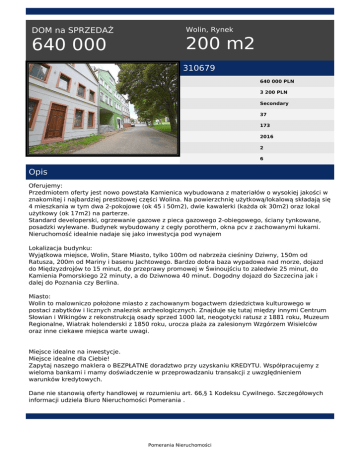 DOM na SPRZEDAŻ 640 000 Wolin, Rynek 200 m2 310679 640 000 PLN 3 200 PLN Secondary 37 173 2016 2 6 Opis Oferujemy: Przedmiotem oferty jest nowo powstała Kamienica wybudowana z materiałów o wysokiej jakości w znakomitej i najbardziej prestiżowej części Wolina. Na powierzchnię użytkową/lokalową składają się 4 mieszkania w tym dwa 2-pokojowe (ok 45 i 50m2), dwie kawalerki (każda ok 30m2) oraz lokal użytkowy (ok 17m2) na parterze. Standard developerski, ogrzewanie gazowe z pieca gazowego 2-obiegowego, ściany tynkowane, posadzki wylewane. Budynek wybudowany z cegły porotherm, okna pcv z zachowanymi łukami. Nieruchomość idealnie nadaje się jako inwestycja pod wynajem Lokalizacja budynku: Wyjątkowa miejsce, Wolin, Stare Miasto, tylko 100m od nabrzeża cieśniny Dziwny, 150m od Ratusza, 200m od Mariny i basenu Jachtowego. Bardzo dobra baza wypadowa nad morze, dojazd do Międzyzdrojów to 15 minut, do przeprawy promowej w Świnoujściu to zaledwie 25 minut, do Kamienia Pomorskiego 22 minuty, a do Dziwnowa 40 minut. Dogodny dojazd do Szczecina jak i dalej do Poznania czy Berlina. Miasto: Wolin to malowniczo położone miasto z zachowanym bogactwem dziedzictwa kulturowego w postaci zabytków i licznych znalezisk archeologicznych. Znajduje się tutaj między innymi Centrum Słowian i Wikingów z rekonstrukcją osady sprzed 1000 lat, neogotycki ratusz z 1881 roku, Muzeum Regionalne, Wiatrak holenderski z 1850 roku, urocza plaża za zalesionym Wzgórzem Wisielców oraz inne ciekawe miejsca warte uwagi. Miejsce idealne na inwestycje. Miejsce idealne dla Ciebie! Zapytaj naszego maklera o BEZPŁATNE doradztwo przy uzyskaniu KREDYTU. Współpracujemy z wieloma bankami i mamy doświadczenie w przeprowadzaniu transakcji z uwzględnieniem warunków kredytowych. Dane nie stanowią oferty handlowej w rozumieniu art. 66,§ 1 Kodeksu Cywilnego. Szczegółowych informacji udziela Biuro Nieruchomości Pomerania . Pomerania Nieruchomości Pomerania Nieruchomości tel. Lewobrzeże: 914894242 | Prawobrzeże: 913508888 email: [email protected] Pomerania Nieruchomości Powered by TCPDF (www.tcpdf.org)