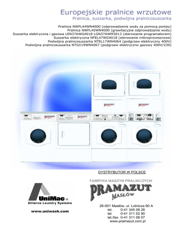 Europejskie pralnice wrzutowe Pralnica, suszarka, podwójna pralnicosuszarka Pralnica NWFL44WN4000 (odprowadzenie wody za pomocą pompy) Pralnica NWFL45WN4000 (grawitacyjne odprowadzanie wody) Suszarka elektryczna i gazowa LEN37AWG4018 LGN37AWM3013 (sterowanie programatorem) Suszarka elektryczna NFEL47WG4018 (sterowanie mikroprocesorowe) Podwójna pralnicosuszarka NTEL17WN4064 (podgrzew elektryczny 400V) Podwójna pralnicosuszarka NTGX19WN4067 (podgrzew elektryczno gazowy 400V/230) DYSTRYBUTOR W POLSCE www.uniwash.com 26-001 Masłów, ul. Lotnicza 60 A tel. 0-41 345 08 26 tel. 0-41 311 02 90 tel./fax 0-41 311 08 07 www.pramazut.com.pl Dane techniczne NWFL44 / NWFL45 - bęben i obudowa ze stali nierdzewnej - wierzch ze stali nierdzewnej - pojemność 80 litrów - czteropunktowe zawieszenie - prędkość wirowania 1000 obr/min - silnik indukcyjny z napędem sterowanym mikroprocesorem - moc grzewcza 4800W - programowalne sterowanie elektroniczne - pompa spustowa (model NWFL44) - grawitacyjny spust wody (model NWFL45) NFEL47 - wierzch ze stali nierdzewnej - objętość bębna 198 litrów - moc grzewcza 4800W - 6300 kcal - programowalne sterowanie elektroniczne - oszczędność miejsca - bardzo duża pojemność - programowalne sterowanie elektroniczne Pralnica Szerokość (mm) Głębokość (mm) Wysokość (mm) Temp. wody (° C) Programy prania Czas prania Objętość bębna (dm3) Ciśnienie wody (bar) Prędkości wirowania (obr/min) Spust grawitacyjny Silnik (chroniony przed przegrzaniem) Element grzewczy Wykończenie wierzchu Kolor Zasilanie Waga netto (kg) Waga brutto (kg) Zezwolenie NWFL44 / NWFL45 683 711 1054 Pranie normalne/90° Pranie normalne/60° Pranie normalne/40° Trwałe zaprasowanie/60° Delikatne/30° Normalny, trwałe zaprasowanie, delikatne 31-35 minut + czas podgrzewania 80 1,4 - 8,3 500, 650, 1000 model NWFL45 Indukcyjny o zmiennej prędkości, 750W, 3/4KM 4800 W Stal nierdzewna Biały 230/400 V, 50 Hz/ 3 fazy, 15A 230/400 V, 50 Hz/ 3 fazy, 15A 230V, 50 Hz, 30 A NTEL17 / NTGX19 Suszarka Szerokość (mm) Głębokość (mm) Wysokość (mm) Objętość bębna (dm3) Silnik Element grzewczy Średnica wylotu powietrza – mm (cale) Prędkość obiegu powietrza*– dm3/s Maksymalne ciśnienie statyczne u wylotu powietrza Zasilanie Wykończenie wierzchu Kolor Waga netto (kg) Waga brutto (kg) Zezwolenie LEN37 / LGN37 / NFEL47 683 711 1035 198 1/3 KM; 5,5 A 4800W 102 (4”) Podwójna pralnicosuszarka Szerokość (mm) Głębokość (mm) Wysokość (mm) Kolor Wydajność (kcal/h) Zasilanie gazem 105 10 mm słupa wody El.: 400V, 50 Hz, 3 fazy, 15 A 230 V, 50 Hz, 1 faza, 30 A Stal nierdzewna Biały El.: 66 El.: 70 CE Przyłączka gazu – mm (cale) Waga netto (kg) NTEL17 / NTGX19 683 711 NTEL17 / NTGX19: 1946 Biały 6300 Fabrycznie – gaz ziemny/mieszany**. Możliwość przerobienia na gaz płynny. 9,5 (3/8” NPT) NTEL17 / NTGX19: Gaz: 166; El.: 163 Waga brutto (kg) NTEL17 / NTGX19: Gaz: 179; El.: 177 Zezwolenie CE 109 118 CE W celu uzyskania pozostałych danych technicznych prosimy odnieść się do konkretnych modeli. * mierzone w punkcie opuszczania suszarki ** WAŻNE: Wszelkie zmiany czy modyfikacje urządzeń muszą przeprowadzane być przez autoryzowanych dystrybutorów, przedstawicieli handlowych, czy lokalnych serwisantów. Z uwagi na to, że cały czas ulepszamy nasze produkty, konstrukcja i dane techniczne mogą ulec zmianie. Systemy zarządzania jakością we wszystkich zakładach produkcyjnych Alliance Laundry Systems posiadają certyfikat ISO9001:2000.