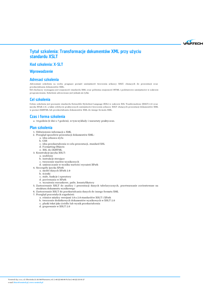 Tytuł szkolenia: Transformacje dokumentów XML przy użyciu standardu XSLT Kod szkolenia: X-SLT Wprowadzenie Adresaci szkolenia Adr es atam i s z ko lenia s ą o s o b y pr agnące po s iąś ć um iejętno ś ć two r z enia ar kus z y XSLT, s łużący ch do pr ez entacji o r az pr z eks z tałcania do kum entó w XML. O d s łuchacz y wy m agana jes t z najo m o ś ć s tandar du XML o r az po b ieżna z najo m o ś ć HT ML i po ds tawo we um iejętno ś ci w z akr es ie pr o gr am o wania. Sz ko lenie adr es o wane jes t jednak nie ty lko Cel szkolenia C elem s z ko lenia jes t po z nanie s tandar du Ex tens ib le Sty les heet Language (XSL) w z akr es ie XSL Tr anfo r m atio ns (XSLT ) 2 .0 o r az jęz y ka XPath 2 .0 , a także z do b y cie pr akty cz ny ch um iejętno ś ci two r z enia ar kus z y XSLT s łużący ch pr ez entacji do kum entó w XML w po s taci (X)HT ML lub pr z eks z tałcaniu do kum entó w XML do innego fo r m atu XML. Czas i forma szkolenia 14 godz in (2 dni x 7 godz in), w tym wykłady i warsz taty praktycz ne. Plan szkolenia 1. Odświeżenie informacji o XML 2. Prz egląd sposobów prez entacji dokumentów XML : a. idea arkusz a stylu b. CSS c. idea prz eksz tałcenia w celu prez entacji, standard XSL d. F ormatting Objects e. XSL do (X)HTML 3. Konstrukcje jęz yka XSL T: a. sz ablony b. instrukcje sterujące c. tworz enie węz łów wynikowych d. umiesz cz anie w wyniku wartości wyrażeń XPath 4. Sz cz egóły jęz yka XPath a. model danych XPath 2.0 b. ścieżki c. stałe, funkcje i operatory d. porównania w XPath e. wyrażenia warunkowe, pętle, kwantyfikatory 5. Zastosowanie XSLT do analiz y i prez entacji danych tabelarycz nych, prz etwarz anie z orientowane na strukturę dokumentu wynikowego 6. Zastosowanie XSL T do prz eksz tałcania danych do innego formatu XML 7. Prz egląd poz ostałych z agadnień: a. różnice międz y wersjami 1.0 a 2.0 standardów XSL T i XPath b. tworz enie dodatkowych dokumentów wynikowych w XSL T 2.0 c. płaski tekst jako ź ródło lub wynik prz eksz tałcenia d. grupowanie w XSL T 2.0 Vavatech Sp. z o.o., ul. Olesińska 21, 02-548 Warszawa, tel. (+48 22) 845 09 70, fax (+48 22) 213 81 27 e-mail: [email protected], www.vavatech.pl