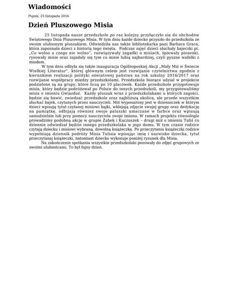 Wiadomości Piątek, 25 listopada 2016 Dzień Pluszowego Misia 25 listopada nasze przedszkole po raz kolejny przyłączyło się do obchodów Światowego Dnia Pluszowego Misia. W tym dniu każde dziecko przyszło do przedszkola ze swoim ulubionym pluszakiem. Odwiedziła nas także bibliotekarka pani Barbara Graca, która zapoznała dzieci z historią tego święta. Podczas zajęć dzieci słuchały bajeczki pt. „Co wolno a czego nie wolno”, rozwiązywały zagadki o misiach, śpiewały piosenki, rysowały misie oraz zajadały się tym co misie lubią najbardziej, czyli pyszne wafelki z miodem. W tym dniu odbyła się także inauguracja Ogólnoposkiej Akcji „Mały Miś w Świecie Wielkiej Literatur”, której głównym celem jest rozwijanie czytelnictwa zgodnie z kierunkiem realizacji polityki oświatowej państwa na rok szkolny 2016/2017 oraz rozwijanie współpracy między przedszkolami. Przedszkola biorące udział w projekcie podzielone są na grupy, które liczą po 10 placówek. Każde przedszkole przygotowuje misia, który będzie podróżował po Polsce do innych przedszkoli, my przygotowaliśmy misia o imieniu Gwiazduś. Każdy pluszak wraz z przedszkolakami u których zagości, będzie się bawić, zwiedzać przedszkole oraz najbliższą okolicę, ale przede wszystkim słuchać bajek, czytanych przez nauczycieli. Miś wyposażony jest w dzienniczek w którym dzieci wpisują tytuł czytanej misiowi bajki, wklejają zdjęcie swojej grupy oraz dedykację na pamiątkę, odbijają również swoje paluszki umaczane w farbce oraz wpisują samodzielnie lub przy pomocy nauczyciela swoje imiona. W ramach projektu równolegle prowadzimy podobną akcję w grupie Żabek i Kaczuszek – drugi miś o imieniu Tuliś co dziennie odwiedzał będzie innego przedszkolaka w jego domu. W tym czasie rodzice czytają dziecku i misiowi wybraną, dowolną książeczkę. Po przeczytaniu książeczki rodzice wypełniają dziennik podróży Misia Tulisia wpisując imię i nazwisko dziecka, tytuł przeczytanej książeczki, natomiast dziecko wykonuje poniżej rysunek dla Misia. Na zakończenie spotkania wszystkie przedszkolaki pozowały do zdjęć grupowych ze swoimi ulubieńcami. To był fajny dzień.