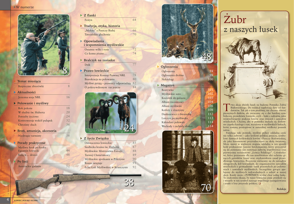 W numerze Żubr Z flanki 64 Festyn Tradycja, etyka, historia 66 70 „Mykita” z Puszczy Białej Tatrzańskie głuchonie k i n powiadania O i wspomnienia myśliwskie 72 74 Ostatnie wilki i rysie Co komu pisane… r e i Bralczyk na zasiadce Dzik 8 Prawo łowieckie Temat miesiąca Bezpieczne zbiorówki 8 Jesienna sesja NRŁ 16 Polowanie i myśliwy Rok pokotu W służbie św. Huberta 18 20 24 32 36 ź a Potrzeby życiowe Kontrowersje wokół pułapek Chrońmy słuch Broń, amunicja, akcesoria Niedrogie varminty p 38 Porady praktyczne Myśliwy krok po kroku Egzamin łowiecki Kulą w… deszcz Po linii fot. Tadeusz Serafin Austriackie gadanie 4 ŁOWIEC POLSKI 10/2008 44 48 52 Interpretacje Komisji Prawnej NRŁ Biurokracja na polowaniu Myśliwi pytają – prawnicy odpowiadają O pokrzywdzonym raz jeszcze z d Aktualności 77 78 80 82 84 24 48 Ogłoszenia Ogłoszenia Ogłoszenia drobne Nekrologi 94 98 100 Magazyn Rozrywka Myśliwskie auto Kociołek do gulaszu Album rocznicowy Album myśliwski Kotlety z dziczyzny Daukszewicz z dwururką Lutczyn po myśliwsku Kalendarz polowań Wschody i zachody słońca 101 102 103 104 106 108 112 113 114 114 Z życia Związku Odznaczenia łowieckie Siedlecka kraina św. Huberta Myśliwskie Mistrzostwa Europy Turniej Chmielakowy Myśliwskie spotkania w Połczynie Konin świętuje Echa Gali Myśliwskiej w Krasiczynie 85 87 88 89 90 91 92 38 z naszych łusek 70 T rwa akcja zbiórki łusek na budowę Pomnika Żubra Białowieskiego. Do redakcji napływają dary od fundatorów. Tak jak o tym pisaliśmy, nie chcemy zbierać pieniężnych datków, ale zwracamy się o dar bardziej symboliczny, prawdziwie łowiecki, czyli – łuski z nabojów, jakie wystrzeliwujemy podczas łowów oraz ćwiczeń i zawodów strzeleckich. Chcemy, aby w pomniku znalazła się dosłownie cząstka każdego z nas, wyrażona w myśliwskich łuskach, które zostaną przetopione w naturalnej wielkości pomnik żubra. Fundując taki pomnik, myśliwi polscy oddadzą cześć nie tylko żubrowi – jako królowi polskiej puszczy, symbolowi dawnych królewskich łowów i Puszczy Białowieskiej, ale jako fenomenowi przyrodniczemu na skalę światową. Może nawet w większym stopniu oddadzą w ten sposób hołd profesorowi Janowi Sztolcmanowi, który przyczynił się do powstania idei restytucji żubrów, współtwórcy oraz pierwszemu redaktorowi „Łowca Polskiego”. Człowiekowi, który pozostanie dla nas uosobieniem idei ochrony ginących gatunków fauny oraz orędownikiem zasad prawidłowego łowiectwa. Ponownie zwracamy się do zarządów okręgowych, kół łowieckich, do organizatorów zawodów strzeleckich o gromadzenie łusek pozostałych po polowaniach i zawodach myśliwskich. Szczególnie gorąco apelujemy do myśliwych indywidualnych o udział w naszej akcji. Każdy może i POWINIEN wysłać choć jedną łuskę. To znakomita okazja, by nasze łowieckie pasje przekuły się i wtopiły w ten symbol naszego wspólnego zaangażowania i troski o losy przyrody polskiej. Redakcja
