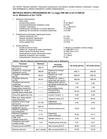 Zał. 02/OW. Metryka obiektów. Obliczenia hydrauliczne minimalnych świateł obiektów mostowych i przepustów kolidujących z ciekami naturalnymi i rowami melioracyjnymi. METRYKA MOSTU DROGOWEGO M-1 w ciągu DW-382 w km 5+386.65 na rz. Bielawica w km 1+010 1. ZałoŜenia obliczeniowe. – klasa drogi – powierzchnia zlewni – prawdopodobieństwo przepływu wody – przepływ miarodajny – współczynnik szorstkości w korycie głównym – współczynnik szorstkości na terasie zalewowej G 2 A=27.58km p=0.5% 3 Q0.5%=56.2m /s nk=0.040 nt=0.050 2. Projektowane parametry regulacyjne koryta. – średnia szerokość dna – średnia wysokość regulacyjna – średnie nachylenie brzegów – średni spadek dna b=1.5m h=2.0m m=0.5 (1:2) i=0.76% 3. Wyniki obliczeń. – światło poziome mostu – rzędna zw. spiętrzonej wody miarodajnej – rzędna spodu konstrukcji mostu – przewyŜszenie spodu konstrukcji mostu – prędkość przepływu pod mostem – przewidywane rozmycie pod obiektem L=84.8m (z przęsłem na lewy brzeg) zW =266.65m n.p.m. zK=269.16m n.p.m. ∆Z=2.51m v=1.39m/s P=0m Tabela 1 Wyniki obliczeń hydraulicznych mostu nad rz. Bielawica. Parametr Rzędna linii energii [m n.p.m.] Rzędna zw. wody spiętrzonej [m n.p.m.] Przepływ miarodajny 3 [m /s] Przepływ obliczony 3 [m /s] Przepływ nad koroną mostu [m] Odległość zw. wody z lewej strony mostu [m] Odległość zw. wody z prawej strony mostu [m] Stosunek głębokości [m] Max wys. wody nad koroną mostu [m] Rzędna korony drogi [m n.p.m.] Rzędna spodu kontr. mostu [m n.p.m.] RóŜnica wysokości linii energii [m] RóŜnica wysokości zw. wody [m] Całk. pow. 2 światła mostu [m ] Prędkość max przed mostem [m/s] Współczynnik WSPRO Metoda obliczeń Wartość 266.74 266.65 56.20 56.20 ——— ——— ——— Parametr pod mostem Rzędna linii energii [m n.p.m.] Rzędna zw. wody [m n.p.m.] Rzędna zw. wody w ruchu kryt. [m n.p.m.] Maksymalna róŜnica wzniesień przekroju [m] Prędkość pod mostem [m/s] Powierzchnia 2 przepływu [m ] Od wody górnej Od wody dolnej 266.71 266.65 266.55 266.53 266.49 266.49 1.87 2.09 1.40 1.28 40.09 43.90 0.62 0.59 ——— Liczba Froude [—] ——— Objętość wody [m ] 24.97 26.42 271.66 Głębokość hydrauliczna [m] 0.52 0.59 Obwód zwilŜony [m] 79.49 78.47 Szerokość lustra wody [m] 76.40 74.71 Spadek tarcia [—] 0.05 0.03 Współczynnik strat [m] 0.01 0.01 Siła ścinania [N/m ] 36.84 33.23 Siła unoszenia [N/m s] 51.64 42.54 3 269.16 0.13 0.13 239.63 1.40 ——— zach. energii 2 Zał. 02/OW. Metryka obiektów. Obliczenia hydrauliczne minimalnych świateł obiektów mostowych i przepustów kolidujących z ciekami naturalnymi i rowami melioracyjnymi. Rysunek 1 Model 3D obliczeniowego mostu (widok od strony wody dolnej) Geom: most_bielawica_80 Flow: Imported Flow 01 Legend WS Q0.5% Ground Levee Ineff Bank Sta 8 6 5 3 1 Rysunek 2 Profil podłuŜny rz. Bielawica na analizowanym odcinku w rejonie proj. Mostu. Geom: most_bielawica_80 272 Flow: Imported Flow 01 Legend EG Q0.5% WS Q0.5% Crit Q0.5% 271 Ground LOB ROB 270 Left Levee Right Levee Elevation (m) 269 268 267 266 265 264 0 20 40 60 Main Channel Distance (m) 80 100 Zał. 02/OW. Metryka obiektów. Obliczenia hydrauliczne minimalnych świateł obiektów mostowych i przepustów kolidujących z ciekami naturalnymi i rowami melioracyjnymi. Rysunek 3 Widok na proj. most od strony wody górnej Geom: m ost_bielawica_80 Flow: Imported Flow 01 River = RIVER-1 Reach = Reach-1 .05 RS = 5.5 BR .04 .05 272 Legend EG Q0.5% WS Q0.5% Crit Q0.5% 271 Ground Levee Ineff 270 Bank Sta Elevation (m) 269 268 267 266 265 264 0 50 100 150 200 250 Station (m) Rysunek 4 Widoka na proj. most od strony wody dolnej. Geom: m ost_bielawica_80 Flow: Imported Flow 01 River = RIVER-1 Reach = Reach-1 .05 RS = 5.5 .04 BR .05 272 Legend EG Q0.5% WS Q0.5% Crit Q0.5% 271 Ground Levee Ineff 270 Bank Sta Elevation (m) 269 268 267 266 265 264 0 50 100 150 Station (m) 200 250