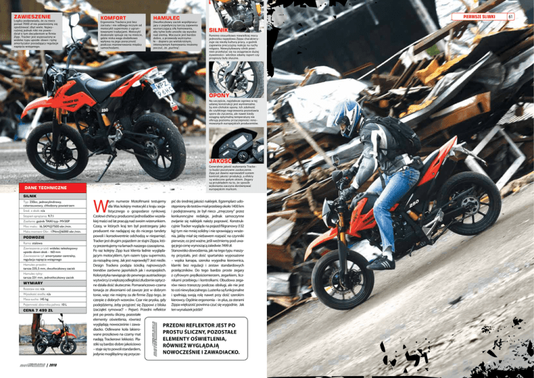 Zawieszenie Logika podpowiada, że za nieco ponad 7000 zł nie powinniśmy się spodziewać zbyt wiele. Najwyraźniej jednak nikt nie powiedział o tym decydentom w firmie Zipp. Tracker jest wyposażony w widelec typu upside-down i tylny amortyzator posiadający regulacje napięcia wstępnego. Komfort Ergonomia Trackera jest bez zarzutu i nie odbiega niczym od motocykli supermoto z ugruntowanymi tradycjami. Motocykl doskonale spisuje się na mieście, gdzie niska waga dodatkowo wpływa na jego poręczność podczas manewrowania między samochodami. Pierwsze sliwki Hamulec Dwutłoczkowy zacisk współpracujący z pojedynczą tarczą zapewnia wystarczającą siłę hamowania, aby tylne koło unosiło się wysoko nad ziemią. Wyczucie jest bardzo dobre, a przewody wytrzymałe - dopiero po wielokrotnym, intensywnym hamowaniu możemy poczuć, że „puchną”. Silnik Pomimo stosunkowo niewielkiej mocy jednostka napędowa Zippa charakteryzuje się niezłą kulturą pracy, a gaźnik zapewnia precyzyjną reakcję na ruchy rolgazu. Niewyżyłowany silnik powinien przełożyć się na osiągnięcie dużej żywotności- wkrótce zdamy raport czy prognozy były słuszne. Opony Na szczęście, najsłabsze ogniwo w tej udanej konstrukcji jest wymienialne. Są nim chińskie opony. Ich zdolność do szybkiego nagrzewania pozostawia sporo do życzenia, ale nawet kiedy osiągną optymalną temperaturę nie oferują poziomu przyczepności renomowanych europejskich producentów. Jakość Generalnie jakość wykonania Trackera budzi pozytywne zaskoczenie. Zipp już dawno wprowadził system kontroli jakości produkcji, a efekty są widoczne gołym okiem. Zegary są przykładem na to, że sposób wykonania zaczyna dorównywać europejskim markom. Dane techniczne Silnik Typ: 250cc, jednocylindrowy, czterosuwowy, chłodzony powietrzem Śred. x skok: n/a Stopień sprężania: 9.7:1 Zasilanie: gaźnik TAIKI typ- MV30P Moc maks.: 16,5KM@7500 obr./min. Maks moment Obr.: 17Nm@6000 obr./min. Podwozie Rama: stalowa Zawieszenie przód: widelec teleskopowy upside-down skok - 160 mm Zawieszenie tył: amortyzator centralny, regulacja napięcia wstępnego Hamulec przedni: tarcza 235,5 mm, dwutłoczkowy zacisk Hamulec tylny: tarcza 231 mm, jednotłoczkowy zacisk Wymiary Rozstaw osi: n/a Wysokość siodła: n/a Masa sucha: 145 kg Pojemność zbiornika paliwa: 10 L Cena 7 499 zł 2010 W tym numerze MotoRmanii testujemy pić do średniej jakości naklejek. Egzemplarz udodla Was kolejny motocykl z kraju socja- stępniony do testów miał przebieg około 1400 km listycznego o gospodarce rynkowej. i podejrzewamy, że był nieco „zmęczony” przez Czołowi chińscy producenci jednośladów wszela- konkurencyjne redakcje, jednak samoczynne kiej maści od lat pracują nad swoim wizerunkiem. zwijanie się naklejek należy poprawić. KonstrukCzasy, w których kraj ten był postrzegany jako cyjnie Tracker wygląda na pojazd filigranowy (132 producent nie nadającej się do niczego tandety kg) tym nie mniej solidny i nie sprawiający wrażepowoli i konsekwentnie odchodzą w niepamięć. nia, jakby miał się niebawem rozpaść na czynniki Tracker jest drugim pojazdem ze stajni Zippa, któ- pierwsze, co jest ważne, jeśli weźmiemy pod uwagę jego cenę wynoszącą zaledwie 7499 zł. ry prezentujemy na łamach naszego czasopisma. Po raz kolejny Zipp kusi klienta ładnie wygląda- Stanowisko dowodzenia, jak na tego typu maszyjącym motocyklem, tym razem typu supermoto, ny przystało, jest dość spartańsko wyposażone za rozsądną cenę. Jak jest naprawdę?? Jest nieźle. – wąska kanapa, szeroka wygodna kierownica, Design Trackera podąża ścieżką najnowszych klamki bez regulacji i zestaw standardowych trendów zarówno japońskich jak i europejskich. przełączników. Do tego bardzo proste zegary Kolorystyka nawiązuje do pewnego austriackiego z cyfrowym prędkościomierzem, zegarkiem, liczwytwórcy i z większej odległości złudzenie optycz- nikami przebiegu i kontrolkami. Obudowa zegane działa dość skutecznie. Pomarańczowo-czarna rów nieco trzeszczy podczas obsługi, ale nie jest tonacja ze złoceniami od zawsze jest w dobrym to coś niewybaczalnego. Lusterka są funkcjonalne tonie, więc nie miejmy za złe firmie Zipp tego, że i spełniają swoją rolę nawet przy dość szerokim czerpie z dobrych wzorców. Czar nie pryska, gdy kierowcy. Ogólnie ergonomia – in plus, za sterami podejdziemy, żeby przyjrzeć się Zippowi z bliska Zippa większość powinna czuć się wygodnie. Jak (zacząłeś rymować? – Pejser). Przedni reflektor ten wynalazek jeździ? jest po prostu śliczny, pozostałe elementy oświetlenia, również wyglądają nowocześnie i zawaPrzedni reflektor jest po diacko. Odlewane koła lakieroprostu śliczny, pozostałe wane proszkowo na czarny mat nadają Trackerowi lekkości. Plaelementy oświetlenia, stiki są bardzo dobre jakościowo również wyglądają – staje się to powoli standardem, nowocześnie i zawadiacko. jedynie moglibyśmy się przycze- 61