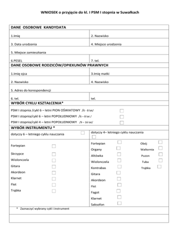 WNIOSEK o przyjęcie do kl. I PSM I stopnia w Suwałkach DANE OSOBOWE KANDYDATA 1.Imię 2. Nazwisko 3. Data urodzenia 4. Miejsce urodzenia 5. Miejsce zamieszkania 6.PESEL 7. tel. DANE OSOBOWE RODZICÓW/OPIEKUNÓW PRAWNYCH 1.Imię ojca 3.Imię matki 2. Nazwisko 4. Nazwisko 5. Adres do korespondencji 6. tel. tel. WYBÓR CYKLU KSZTAŁCENIA* PSM I stopnia /cykl 6 – letni PION OŚWIATOWY /6 - 8 lat/ PSM I stopnia/cykl 6 – letni POPOŁUDNIOWY /6 – 8 lat / PSM I stopnia/cykl 4 – letni POPOŁUDNIOWY /9 – 16 lat/ WYBÓR INSTRUMENTU * dotyczy 6 – letniego cyklu nauczania Fortepian Skrzypce Wiolonczela Gitara Akordeon Klarnet Flet Trąbka dotyczy 4– letniego cyklu nauczania Fortepian Obój Organy Waltornia Altówka Puzon Wiolonczela Tuba Kontrabas Trąbka Gitara Akordeon Flet Fagot Klarnet Saksofon * Zaznaczyć wybrany cykl i instrument OPINIA LEKARZA O BRAKU PRZECIWSKAZAŃ ZDROWOTNYCH DO NAUKI GRY NA WYBRANYM INSTRUMENCIE Suwałki, dnia …………………………… ………………………………… podpis i pieczęć lekarza DEKLARACJA RODZICA/OPIEKUNA PRAWNEGO Przyjmuję do wiadomości, że zajęcia w szkole muzycznej odbywają się niezależnie od zajęć w szkole macierzystej, do której uczęszcza moje dziecko – niemniej uczęszczanie na nie jest obowiązkiem na zasadach ogólnie przyjętych w szkolnictwie. Ponadto informujemy, iż w celu zapewnienia niezbędnego funkcjonowania Szkoły Rodzice uczniów wnoszą darowizny na cele oświatowe z przeznaczeniem na: zakup i renowację instrumentów muzycznych i akcesoriów, zakupy płyt i nut, konsultacje u prof. z Akademii i Uniwersytetów Muzycznych, seminaria, koncerty, konkursy, kursy, przesłuchania itp. Suwałki, dnia ………………………… ………….……………………………… podpis rodzica /opiekuna prawnego W szkole istnieje możliwość odpłatnego wypożyczania niektórych instrumentów muzycznych WNIOSEK o przyjęcie do kl. II PSM I stopnia w Suwałkach DANE OSOBOWE KANDYDATA 1.imię 2. Nazwisko 3. Data urodzenia 4. Miejsce urodzenia 5. Miejsce zamieszkania 6.PESEL 7. tel. DANE OSOBOWE RODZICÓW/OPIEKUNÓW PRAWNYCH 1.Imię ojca 3.Imię matki 2. Nazwisko 4. Nazwisko 5. Adres do korespondencji 6. tel. tel. WYBÓR CYKLU KSZTAŁCENIA* PSM I stopnia /cykl 6 – letni PION OŚWIATOWY /6-8 lat/ PSM I stopnia/cykl 6 – letni POPOŁUDNIOWY /6-8 lat/ PSM I stopnia/cykl 4 – letni POPOŁUDNIOWY /9-16 lat/ WYBÓR INSTRUMENTU * dotyczy 6 – letniego cyklu nauczania Fortepian dotyczy 4– letniego cyklu nauczania Fortepian Organy Skrzypce Wiolonczela Gitara Akordeon Flet Klarnet Trąbka Waltornia Altówka Puzon Wiolonczela Obój Kontrabas Tuba Gitara Trąbka Akordeon Flet Fagot Klarnet Saksofon Trąbka * Zaznaczyć wybrany cykl i instrument OPINIA LEKARZA O BRAKU PRZECIWSKAZAŃ ZDROWOTNYCH DO NAUKI GRY NA WYBRANYM INSTRUMENCIE Suwałki, dnia …………………………………….. ………….…………………………… podpis i pieczęć lekarza PROGRAM EGZAMINU KWALIFIKACYJNEGO …………………………………………………………………………………………………………………………… …………………………………………………………………………………………………………………………… …………………………………………………………………………………………………………………………… …………………………………………………………………………………………………………………………… …………………………………………………………………………………………………………………………… …………………………………………………………………………………………………………………………… ……………… DEKLARACJA RODZICA/OPIEKUNA PRAWNEGO Przyjmuję do wiadomości, że zajęcia w szkole muzycznej odbywają się niezależnie od zajęć w szkole macierzystej, do której uczęszcza moje dziecko – niemniej uczęszczanie na nie jest obowiązkiem na zasadach ogólnie przyjętych w szkolnictwie. Ponadto informujemy, iż w celu zapewnienia niezbędnego funkcjonowania Szkoły Rodzice uczniów wnoszą darowizny na cele oświatowe z przeznaczeniem na: zakup i renowację instrumentów muzycznych i akcesoriów, zakupy płyt i nut, konsultacje u prof. z Akademii i Uniwersytetów Muzycznych, seminaria, koncerty, konkursy, kursy, przesłuchania itp. Suwałki, dnia ………………………… ………….…………………………… podpis rodzica /opiekuna prawnego W szkole istnieje możliwość odpłatnego wypożyczania niektórych instrumentów muzycznych