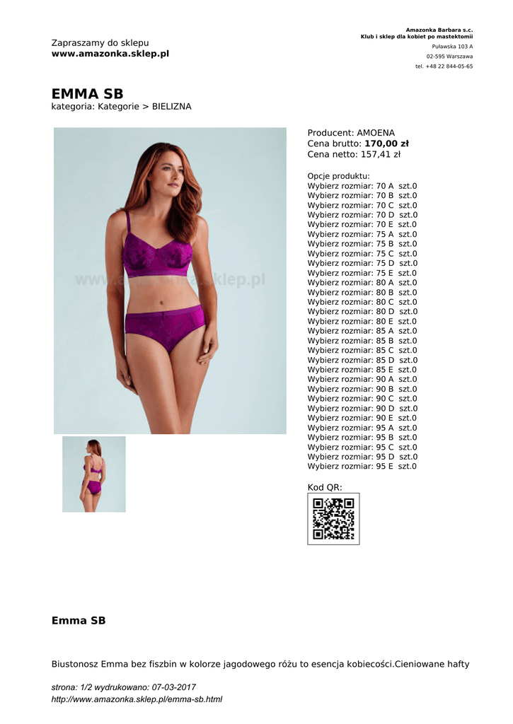 Amazonka Barbara s.c. Klub i sklep dla kobiet po mastektomii Zapraszamy do sklepu www.amazonka.sklep.pl Puławska 103 A 02-595 Warszawa tel. +48 22 844-05-65 EMMA SB kategoria: Kategorie > BIELIZNA Producent: AMOENA Cena brutto: 170,00 zł Cena netto: 157,41 zł Opcje produktu: Wybierz rozmiar: Wybierz rozmiar: Wybierz rozmiar: Wybierz rozmiar: Wybierz rozmiar: Wybierz rozmiar: Wybierz rozmiar: Wybierz rozmiar: Wybierz rozmiar: Wybierz rozmiar: Wybierz rozmiar: Wybierz rozmiar: Wybierz rozmiar: Wybierz rozmiar: Wybierz rozmiar: Wybierz rozmiar: Wybierz rozmiar: Wybierz rozmiar: Wybierz rozmiar: Wybierz rozmiar: Wybierz rozmiar: Wybierz rozmiar: Wybierz rozmiar: Wybierz rozmiar: Wybierz rozmiar: Wybierz rozmiar: Wybierz rozmiar: Wybierz rozmiar: Wybierz rozmiar: Wybierz rozmiar: 70 70 70 70 70 75 75 75 75 75 80 80 80 80 80 85 85 85 85 85 90 90 90 90 90 95 95 95 95 95 A B C D E A B C D E A B C D E A B C D E A B C D E A B C D E szt.0 szt.0 szt.0 szt.0 szt.0 szt.0 szt.0 szt.0 szt.0 szt.0 szt.0 szt.0 szt.0 szt.0 szt.0 szt.0 szt.0 szt.0 szt.0 szt.0 szt.0 szt.0 szt.0 szt.0 szt.0 szt.0 szt.0 szt.0 szt.0 szt.0 Kod QR: Emma SB Biustonosz Emma bez fiszbin w kolorze jagodowego różu to esencja kobiecości.Cieniowane hafty strona: 1/2 wydrukowano: 07-03-2017 http://www.amazonka.sklep.pl/emma-sb.html na miseczkach pzrypominają najdelikatniejszą koronkę.Szeroki pas pod biustem stanowi stabilną podstawę , nie zwija się i utrzymuje biustonosz na miejscu. Kieszonki z mikrofibry bezpiecznie utrzymują protezę lub nakładkę uzupełniającą na miejscu. Kolor: jagodowy róż, Materiał: 70% poliamid, 18% elastan, 12% poliester - delikatne cieniowane hafty zdobiące miseczkę, - ozdobny pas pod biustem, - mała kokardka umieszczona centralnie z przodu, - delikatna mikrofibra tworzy boki i tył biustonosza, - lekko obniżony dekolt tworzący piękne wycięcie. Kolekcja amoena to szeroki wybór klasycznej bielizny na każdy dzień. Relaks, poczucie bezpieczeństwa i komfortu czyni codzienne życie łatwiejszym. strona: 2/2 wydrukowano: 07-03-2017 http://www.amazonka.sklep.pl/emma-sb.html