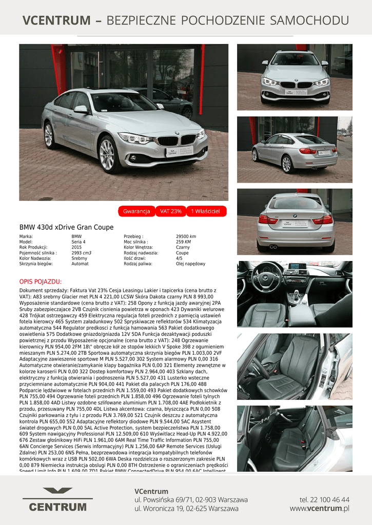 BMW 430d xDrive Gran Coupe Marka: Model: Rok Produkcji: Pojemność silnika : Kolor Nadwozia: Skrzynia biegów: BMW Seria 4 2015 2993 cm3 Srebrny Automat Przebieg : Moc silnika : Kolor Wnętrza: Rodzaj nadwozia: Ilość drzwi: Rodzaj paliwa: 29500 km 259 KM Czarny Coupe 4/5 Olej napędowy OPIS POJAZDU: Dokument sprzedaży: Faktura Vat 23% Cesja Leasingu Lakier i tapicerka (cena brutto z VAT): A83 srebrny Glacier met PLN 4 221,00 LCSW Skóra Dakota czarny PLN 8 993,00 Wyposażenie standardowe (cena brutto z VAT): 258 Opony z funkcją jazdy awaryjnej 2PA Sruby zabezpieczajace 2VB Czujnik cisnienia powietrza w oponach 423 Dywaniki welurowe 428 Trójkat ostrzegawczy 459 Elektryczna regulacja foteli przednich z pamięcią ustawień fotela kierowcy 465 System załadunkowy 502 Spryskiwacze reflektorów 534 Klimatyzacja automatyczna 544 Regulator predkosci z funkcja hamowania 563 Pakiet dodatkowego oswietlenia 575 Dodatkowe gniazdo/gniazda 12V 5DA Funkcja dezaktywacji poduszki powietrznej z przodu Wyposażenie opcjonalne (cena brutto z VAT): 248 Ogrzewanie kierownicy PLN 954,00 2FM 18\" obręcze kół ze stopów lekkich V Spoke 398 z ogumieniem mieszanym PLN 5.274,00 2TB Sportowa automatyczna skrzynia biegów PLN 1.003,00 2VF Adaptacyjne zawieszenie sportowe M PLN 5.527,00 302 System alarmowy PLN 0,00 316 Automatyczne otwieranie/zamykanie klapy bagażnika PLN 0,00 321 Elementy zewnętzne w kolorze karoserii PLN 0,00 322 Dostep komfortowy PLN 2.964,00 403 Szklany dach, elektryczny z funkcją otwierania i podnoszenia PLN 5.527,00 431 Lusterko wsteczne przyciemniane automatycznie PLN 904,00 441 Pakiet dla palacych PLN 176,00 488 Podparcie lędźwiowe w fotelach przednich PLN 1.559,00 493 Pakiet dodatkowych schowków PLN 755,00 494 Ogrzewanie foteli przednich PLN 1.858,00 496 Ogrzewanie foteli tylnych PLN 1.858,00 4AD Listwy ozdobne szlifowane aluminium PLN 1.708,00 4AE Podłokietnik z przodu, przesuwany PLN 755,00 4DL Listwa akcentowa: czarna, błyszcząca PLN 0,00 508 Czujniki parkowania z tyłu i z przodu PLN 3.769,00 521 Czujnik deszczu z automatyczna kontrola PLN 655,00 552 Adaptacyjne reflektory diodowe PLN 9.544,00 5AC Asystent świateł drogowych PLN 0,00 5AL Active Protection, system bezpieczeństwa PLN 1.758,00 609 System nawigacyjny Professional PLN 12.509,00 610 Wyświtlacz Head-Up PLN 4.922,00 676 Zestaw głośnikowy HiFi PLN 1.961,00 6AM Real Time Traffic Information PLN 755,00 6AN Concierge Services (Serwis informacyjny) PLN 1.256,00 6AP Remote Services (Usługi Zdalne) PLN 253,00 6NS Pełna, bezprzewodowa integracja kompatybilnych telefonów komórkowych wraz z USB PLN 502,00 6WA Deska rozdzielcza o rozszerzonym zakresie PLN 0,00 879 Niemiecka instrukcja obslugi PLN 0,00 8TH Ostrzeżenie o ograniczeniach prędkości Speed Limit Info PLN 1.609,00 ZD1 Pakiet BMW ConnectedDrive PLN 954,00 6AC Intelligent Emergency Calling (Inteligentne Połączenia Alarmowe) PLN 0,00 6AE TeleServices PLN 0,00 6AK ConnectedDrive Services (Usługi ConnectedDrive) PLN 1 758,00 ZS5 Rezygnacja z pakietu Service Inclusive PLN - 1.689,00 Wyposażenie opcjonalne razem: PLN 84 552,00 Cena katalogowa (cena brutto z VAT) PLN 340 852,00 Cena całkowita netto (bez VAT) PLN 277 115,47 Total cena brutto z VAT PLN 340 852,00 Dodatkowe Wyposażenie ✓18-calowe felgi aluminiowe ✓Automatycznie przyciemniane wewnętrzne lusterko wsteczne ✓Elektrycznie otwierana klapa bagażnika ✓Elektrycznie sterowany fotel kierowcy z pamięcią ustawień ✓Elektrycznie sterowany hamulec postojowy ✓Elementy dekoracyjne aluminiowe ✓Kierownica wykończona skórą ✓Klimatyzacja automatyczna sterowana elektronicznie ✓Komputer pokładowy ✓Podgrzewane przednie fotele ✓Reflektory Bi-Xenonowe Aktywne ✓Spryskiwacze ciśnieniowe lamp ✓Szyberdach ✓Światła do jazdy dziennej LED ✓System nawigacji satelitarnej Professional ✓Tempomat ✓Czujniki parkowania tył i przód ✓Czujnik deszczu ✓Napęd xDrive ✓Head-UP Display ✓Elektryczne szyby ✓Automatyczna skrzynia biegów ✓Skórzana tapicerka ✓Przyciemniane szyby Systemy Bezpieczeństwa ✓Poduszka powietrzna kierowcy i pasażera ✓Poduszki przednie boczne ✓Poduszki tylne boczne ✓ISOFIX ✓Centralny zamek Multimedia ✓Zestaw głośnomówiący Bluetooth ✓Radio CD ✓Kierownica wielofunkcyjna FINANSOWANIE I UBEZPIECZENIA: Cena: 239 900 PLN Przykładowa rata miesięczna, wpłata 20%, okres leasingu/kredytu 48 miesięcy, 10% wykupu. Rata leasingu jest wartością netto bez vat. Niniejsza treść nie stanowi oferty w rozumieniu przepisów Kodeksu Cywilnego oraz opisu towaru ani zapewnienia w rozumieniu art. 4 Ustawy z dnia 27 lipca 2002r o szczególnych warunkach sprzedaży konsumenckiej. Powered by TCPDF (www.tcpdf.org)