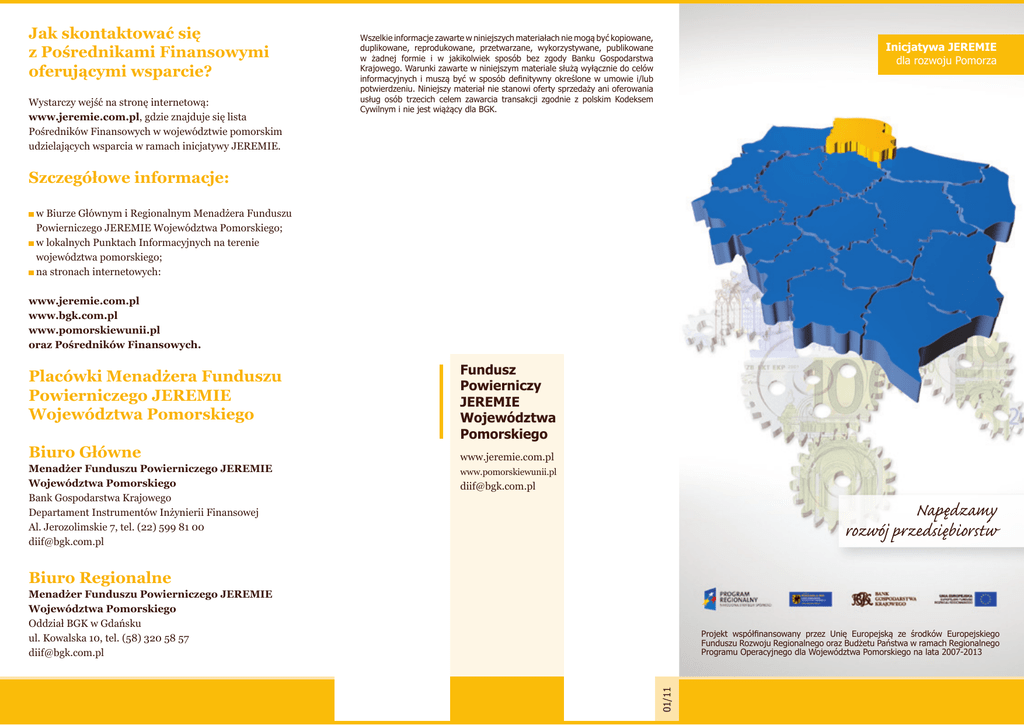 Jak skontaktować się z Pośrednikami Finansowymi oferującymi wsparcie? Wystarczy wejść na stronę internetową: www.jeremie.com.pl, gdzie znajduje się lista Pośredników Finansowych w województwie pomorskim udzielających wsparcia w ramach inicjatywy JEREMIE. Wszelkie informacje zawarte w niniejszych materiałach nie mogą być kopiowane, duplikowane, reprodukowane, przetwarzane, wykorzystywane, publikowane w żadnej formie i w jakikolwiek sposób bez zgody Banku Gospodarstwa Krajowego. Warunki zawarte w niniejszym materiale służą wyłącznie do celów informacyjnych i muszą być w sposób definitywny określone w umowie i/lub potwierdzeniu. Niniejszy materiał nie stanowi oferty sprzedaży ani oferowania usług osób trzecich celem zawarcia transakcji zgodnie z polskim Kodeksem Cywilnym i nie jest wiążący dla BGK. Inicjatywa JEREMIE dla rozwoju Pomorza Szczegółowe informacje: Biurze Głównym i Regionalnym Menadżera Funduszu w Powierniczego JEREMIE Województwa Pomorskiego; w lokalnych Punktach Informacyjnych na terenie województwa pomorskiego; na stronach internetowych: www.jeremie.com.pl www.bgk.com.pl www.pomorskiewunii.pl oraz Pośredników Finansowych. Placówki Menadżera Funduszu Powierniczego JEREMIE Województwa Pomorskiego Biuro Główne Menadżer Funduszu Powierniczego JEREMIE Województwa Pomorskiego Bank Gospodarstwa Krajowego Departament Instrumentów Inżynierii Finansowej Al. Jerozolimskie 7, tel. (22) 599 81 00 [email protected] Fundusz Powierniczy JEREMIE Województwa Pomorskiego www.jeremie.com.pl www.pomorskiewunii.pl [email protected] Napędzamy rozwój przedsiębiorstw Biuro Regionalne Menadżer Funduszu Powierniczego JEREMIE Województwa Pomorskiego Oddział BGK w Gdańsku ul. Kowalska 10, tel. (58) 320 58 57 [email protected] 01/11 Projekt współfinansowany przez Unię Europejską ze środków Europejskiego Funduszu Rozwoju Regionalnego oraz Budżetu Państwa w ramach Regionalnego Programu Operacyjnego dla Województwa Pomorskiego na lata 2007-2013 Co to jest inicjatywa JEREMIE? Inicjatywa JEREMIE (Joint European Resources for Micro-to-Medium Enterprises – Wspólne Europejskie Zasoby dla Mikro, Małych i Średnich Przedsiębiorstw) jest innowacyjnym mechanizmem finansowania rozwoju przedsiębiorstw wprowadzonym przez Komisję Europejską w perspektywie finansowej 2007-2013. Instrument ten umożliwia przeznaczenie części środków unijnych przyznanych państwom członkowskim i regionom UE w ramach Polityki Spójności na zwrotne instrumenty finansowego wsparcia mikro, małych i średnich przedsiębiorstw (np. poprzez pożyczki, poręczenia, czy produkty kapitałowe). W Polsce inicjatywa JEREMIE realizowana jest w pięciu województwach: dolnośląskim, łódzkim, pomorskim, wielkopolskim oraz zachodniopomorskim, w ramach Regionalnych Programów Operacyjnych finansowanych ze środków UE w ramach Polityki Spójności. Zarząd Województwa Pomorskiego, jako Instytucja Zarządzająca Regionalnym Programem Operacyjnym dla Województwa Pomorskiego na lata 2007-2013 (RPO WP) podjął decyzję o przeznaczeniu części środków Programu na realizację inicjatywy JEREMIE. Wdrażanie projektu zostało powierzone tzw. Menadżerowi Funduszu Powierniczego JEREMIE, którego rolę pełni Bank Gospodarstwa Krajowego (BGK) na podstawie umowy z dnia 7 sierpnia 2009 r. zawartej z Instytucją Zarządzającą RPO WP. Całkowita wartość projektu wynosi 287,4 mln zł, w tym dofinansowanie z UE to 215,5 mln zł, a wkład krajowy pochodzący z budżetu państwa to 71,8 mln zł. Cele inicjatywy JEREMIE Inicjatywa JEREMIE ma na celu dostarczenie zwrotnego kapitału (w formie różnych produktów finansowych, np. pożyczek, poręczeń, czy instrumentów kapitałowych) na wsparcie rozwoju przedsiębiorstw, które mają utrudniony dostęp do pozyskania finansowania na rynku. Realizacja inicjatywy JEREMIE w województwie pomorskim umożliwi w szczególności: spieranie rozwoju mikro i małych przedsiębiorstw w znajdujących się we wczesnej fazie działalności; dostarczenie kapitału na inwestycje podmiotom nieposiadającym odpowiednich zabezpieczeń by otrzymać kredyty bankowe; wprowadzenie i rozwój odnawialnego (pozadotacyjnego) systemu wsparcia przedsiębiorstw; zwiększenie absorpcji środków unijnych oraz efektywne ich wykorzystanie na rzecz rozwoju sektora mikro i małych przedsiębiorstw w ramach RPO WP. Główne korzyści ze wsparcia w ramach inicjatywy JEREMIE e lastyczne warunki finansowania dla przedsiębiorstw znajdujących się we wczesnej fazie rozwoju; możliwość uzyskania zabezpieczenia spłaty pożyczki lub kredytu dla firm nieposiadających zabezpieczeń (np. ze względu na krótką historię kredytową, wstępne stadium działalności, działalność usługową, brak wystarczających aktywów); możliwość uzyskania wsparcia na realizację ryzykownych przedsięwzięć innowacyjnych. Kto może skorzystać ze środków w ramach inicjatywy JEREMIE w województwie pomorskim? ikro i małe przedsiębiorstwa; m podmioty rozpoczynające działalność gospodarczą (tzw. startery), w tym również absolwenci; podmioty nieposiadające historii kredytowej, ani zabezpieczeń o wystarczającej wartości. Produkty finansowe oferowane w ramach inicjatywy JEREMIE 1. Produkty dla Pośredników Finansowych Instrumenty pożyczkowe: Inicjatywa JEREMIE dla rozwoju pomorza pożyczka globalna dla funduszy pożyczkowych; linia finansowa dla instytucji finansowych; Instrumenty poręczeniowe: reporęczenie dla funduszy poręczeniowych; poręczenie portfelowe dla instytucji finansowych; Instrumenty kapitałowe: wsparcie kapitałowe funduszy transferu technologii; wsparcie kapitałowe funduszy typu „mezzanine”. 2. Produkty dla przedsiębiorców zabezpieczenie w formie poręczenia kredytów/pożyczek; kredyty/pożyczki ze środków inicjatywy JEREMIE; kapitał typu „venture”, „mezzanine” na rozwój działalności. Na jaką działalność przedsiębiorca moż