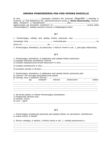 UMOWA POWIERZENIA PSA POD OPIEKĘ DOGVILLE W dniu ……………………………….pomiędzy Hotelem dla Zwierząt „Dogville” z siedzibą w Żukowie, ul. Pod Elżbietowo 2D, reprezentowanym przez p. Annę Jaworowską, zwanym dalej „Hotelem”, a Panią/Panem ………………………………., zam……………………………………………… legitymującą się dowodem osobistym nr……………………………………………………….. zwaną dalej „Powierzającym” została zawarta umowa o następującej treści: §1 1. Powierzający oddaje pod opiekę Hotelu psa/sukę rasy ……………………………………..., noszącego imię ………………………………………, numertatuażu ………………………………………………, na okres od ………………………………………… do ………………………………………… 2. Powierzający oświadcza, że pies/suka, o którym mowa w ust. 1, jest jego własnością. §2 1. Powierzający oświadcza, iż oddawany pod opiekę Hotelu pies/suka: 1) posiada aktualne szczepienia Tak/nie 2) została zabezpieczona przed kleszczami w dniu……………………………………………………..………. 3) została odrobaczona w dniu ………………………………………………………………………………..………….. 4) przeszła cieczkę w okresie -……………………………………………………………………………………………… 2. Powierzający oświadcza, iż oddawany pod opiekę Hotelu pies/suka jest: a) zdrowa i nie wymaga specjalistycznej opieki, b) zdrowa, lecz w ostatnim okresie………………………………………………………………………………………. i – wg wskazań lekarza weterynarii – należy ………………………………………………………………………………………………………………………………………………… ……………………………………………………………………………………………………………………………………………… ………………………………………………………………………………………………………………………………………………… ………………………………………………………………………………………………………………………………………………… ……………………………………………………………………………………………………………………………………………….. 3. Na okres pobytu w Hotelu Powierzający pozostawia: 1) książeczkę zdrowia suki, 2) obrożę, smycz 3) inne – jakie: ………………………………………………………………………………………………………………………………………………… §3 1. Powierzający przekazuje psa/sukę pod opiekę Hotelu na warunkach, określonych w czasie wizyty w Hotelu. 2. Strony ustalają, iż opieka, o której mowa w ust. 1, zostaje poszerzona o: ………………………………………………………………………………………………………………………………………………… ………………………………………………………………………………………………………………………………………………… ………………………………………………………………………………………………………………………………………………… ………………………………………………………………………………………………………………………………………………… ………………………………………………………………………………………………………………………………………………… 3. Koszt pobytu psa/suki w Hotelu w umówionym okresie został ustalony w oparciu o Cennik Usług, i wynosi łącznie kwotę ………….......... PLN (słownie: ………………………………………………………………………………………………………………………………………………… ………………………………………………………………………………………………………………………………………………) 4. Hotel oświadcza, że kwota, o której mowa w ust. 3, została opłacona w następujący sposób: 1) 50% kwoty w wysokości ……………………………… PLN (słownie: ………………………………………………………………………………………………………………………………………………… ………………………………………………………………………………………………………………………………………….……) wpłacono w kasie* Hotelu w dniu…………………………………………………………………………………..…….. 2) pozostałe 50% kwoty w wysokości ……………... PLN (słownie: ………………………………………………………………………………………………………………………………………………… ………………………………………………………………………………………………………………………………………………) Powierzający opłaci w dniu……………………………………………………………………………………………………. §4 1. W związku z zawarciem niniejszej umowy, Hotel zobowiązuje się do: 1) opieki nad psem/suką zgodnie z ofertą, o której mowa w § 3 ust. 1 i 2, 2) dołożenia wszelkich starań, by maksymalnie skrócić aklimatyzację psa/suki w Hotelu poprzez indywidualne ich traktowanie, odpowiednią dawkę zabawy i spacerów a także zapewnienie 