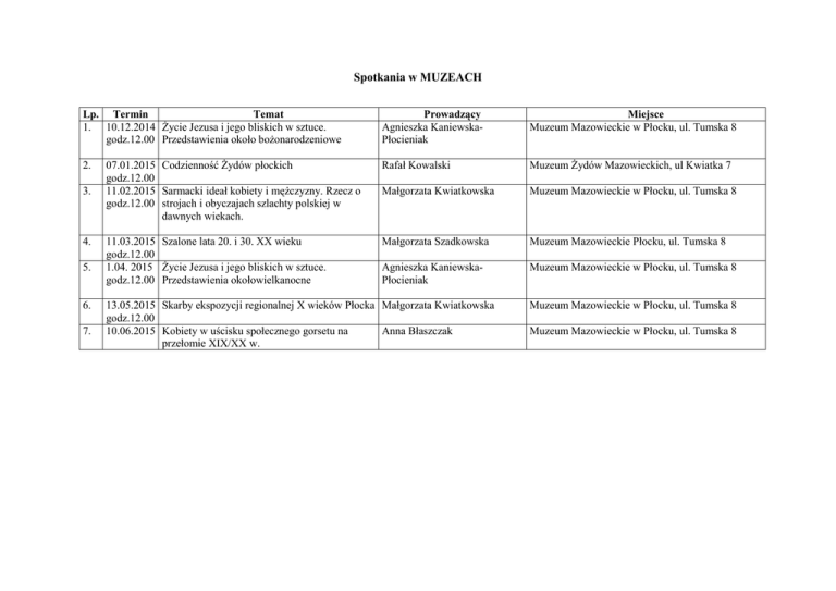 Spotkania w MUZEACH Prowadzący Agnieszka KaniewskaPłocieniak Miejsce Muzeum Mazowieckie w Płocku, ul. Tumska 8 07.01.2015 Codzienność Żydów płockich godz.12.00 11.02.2015 Sarmacki ideał kobiety i mężczyzny. Rzecz o godz.12.00 strojach i obyczajach szlachty polskiej w dawnych wiekach. Rafał Kowalski Muzeum Żydów Mazowieckich, ul Kwiatka 7 Małgorzata Kwiatkowska Muzeum Mazowieckie w Płocku, ul. Tumska 8 11.03.2015 Szalone lata 20. i 30. XX wieku godz.12.00 1.04. 2015 Życie Jezusa i jego bliskich w sztuce. godz.12.00 Przedstawienia okołowielkanocne Małgorzata Szadkowska Muzeum Mazowieckie Płocku, ul. Tumska 8 Agnieszka KaniewskaPłocieniak Muzeum Mazowieckie w Płocku, ul. Tumska 8 Lp. Termin Temat 1. 10.12.2014 Życie Jezusa i jego bliskich w sztuce. godz.12.00 Przedstawienia około bożonarodzeniowe 2. 3. 4. 5. 6. 7. 13.05.2015 Skarby ekspozycji regionalnej X wieków Płocka Małgorzata Kwiatkowska godz.12.00 10.06.2015 Kobiety w uścisku społecznego gorsetu na Anna Błaszczak przełomie XIX/XX w. Muzeum Mazowieckie w Płocku, ul. Tumska 8 Muzeum Mazowieckie w Płocku, ul. Tumska 8